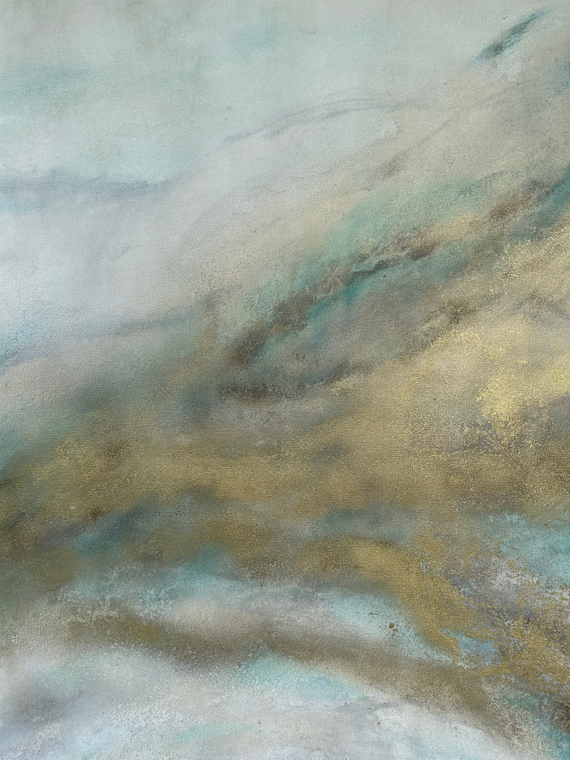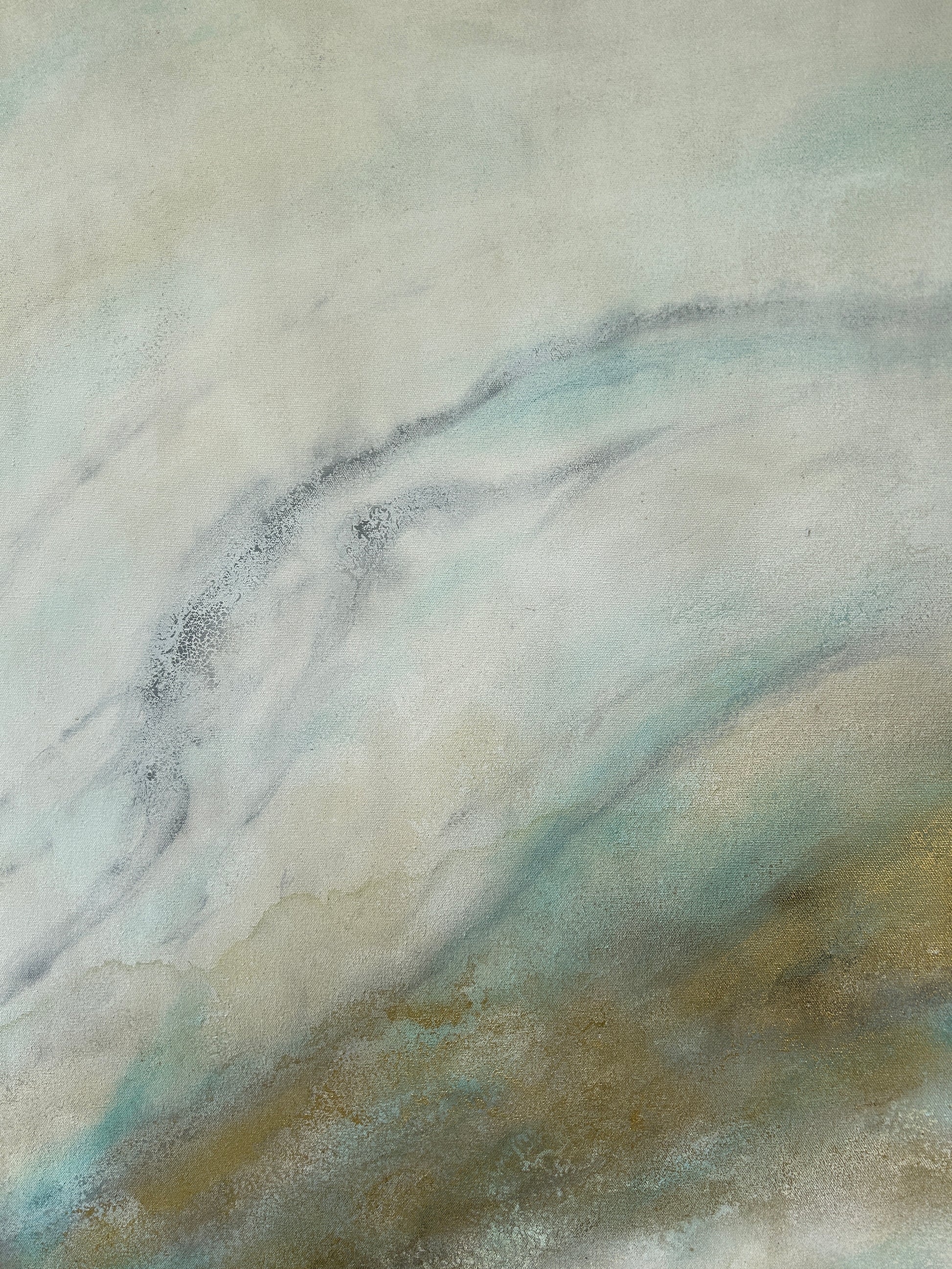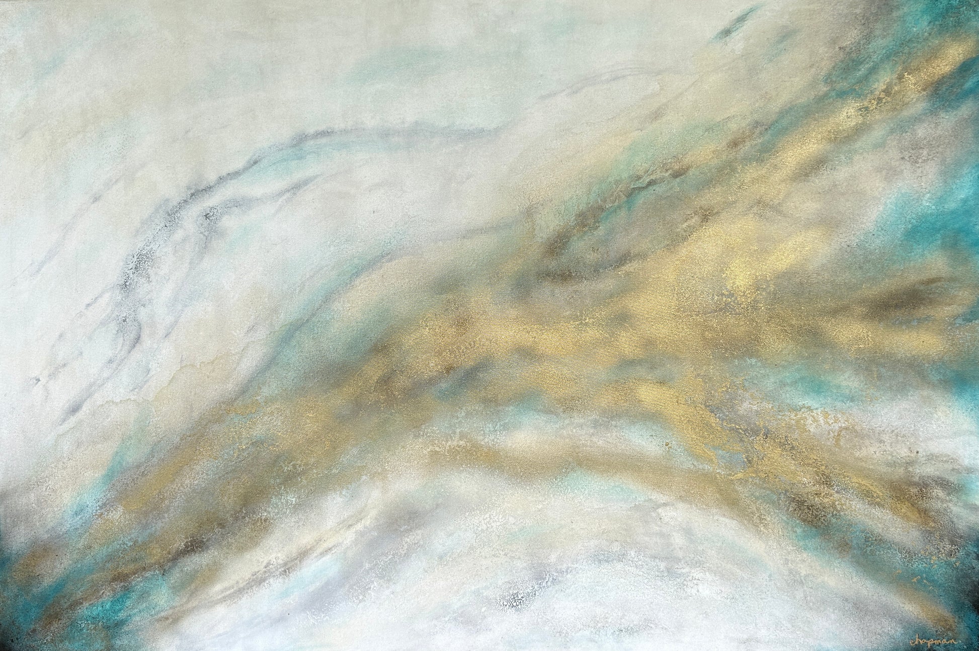 “Corrientes en Movimiento” Esta obra evoca el movimiento fluido y dinámico de los elementos naturales, como el agua o el aire, representado en la pintura. Los tonos fríos de azul, verde esmeralda, blanco y gris se entrelazan con las vetas doradas, creando una sensación de lujo y profundidad. “Corrientes en Movimiento” sugiere una experiencia visual y emocional que va más allá de lo tangible.
