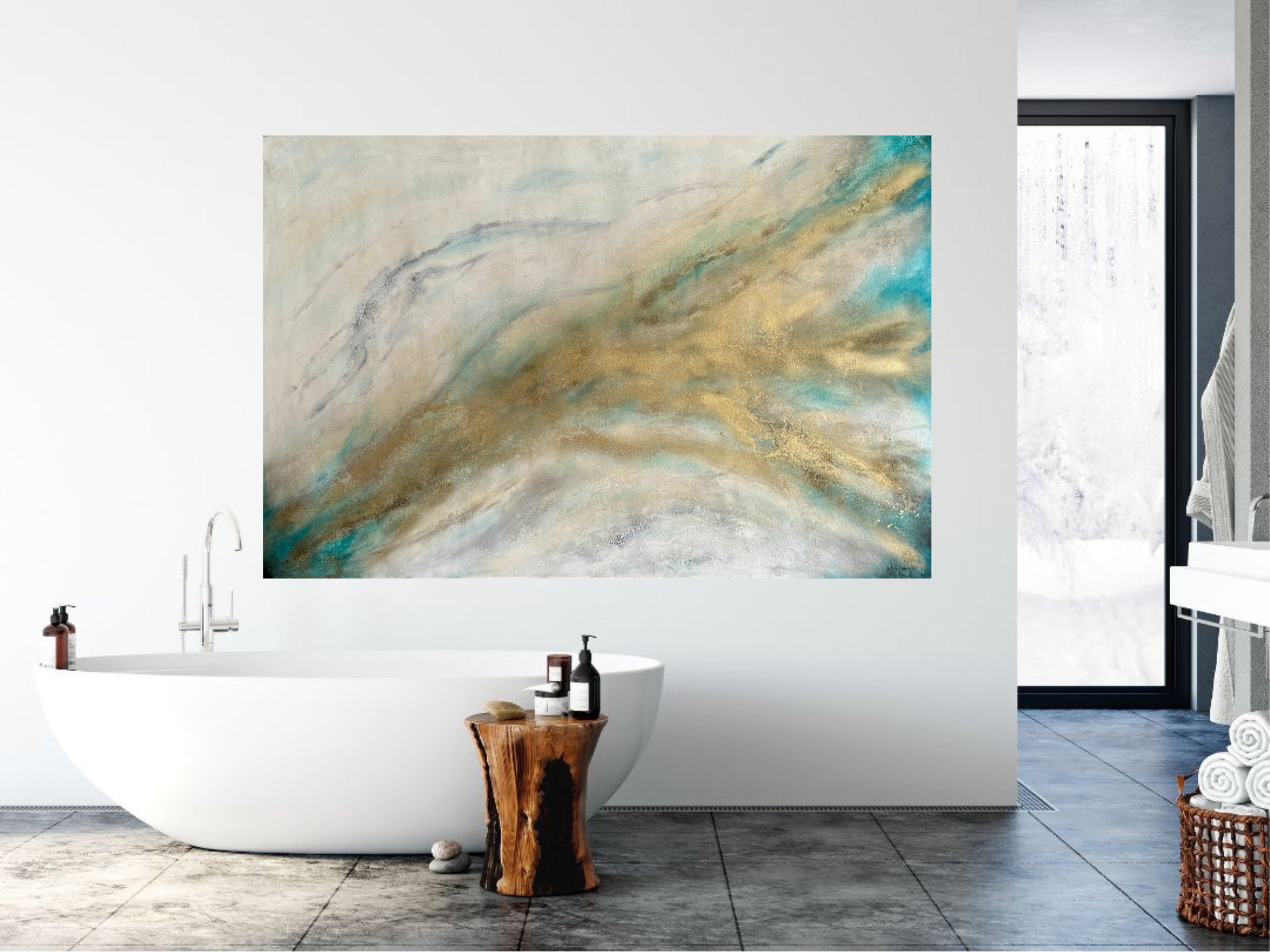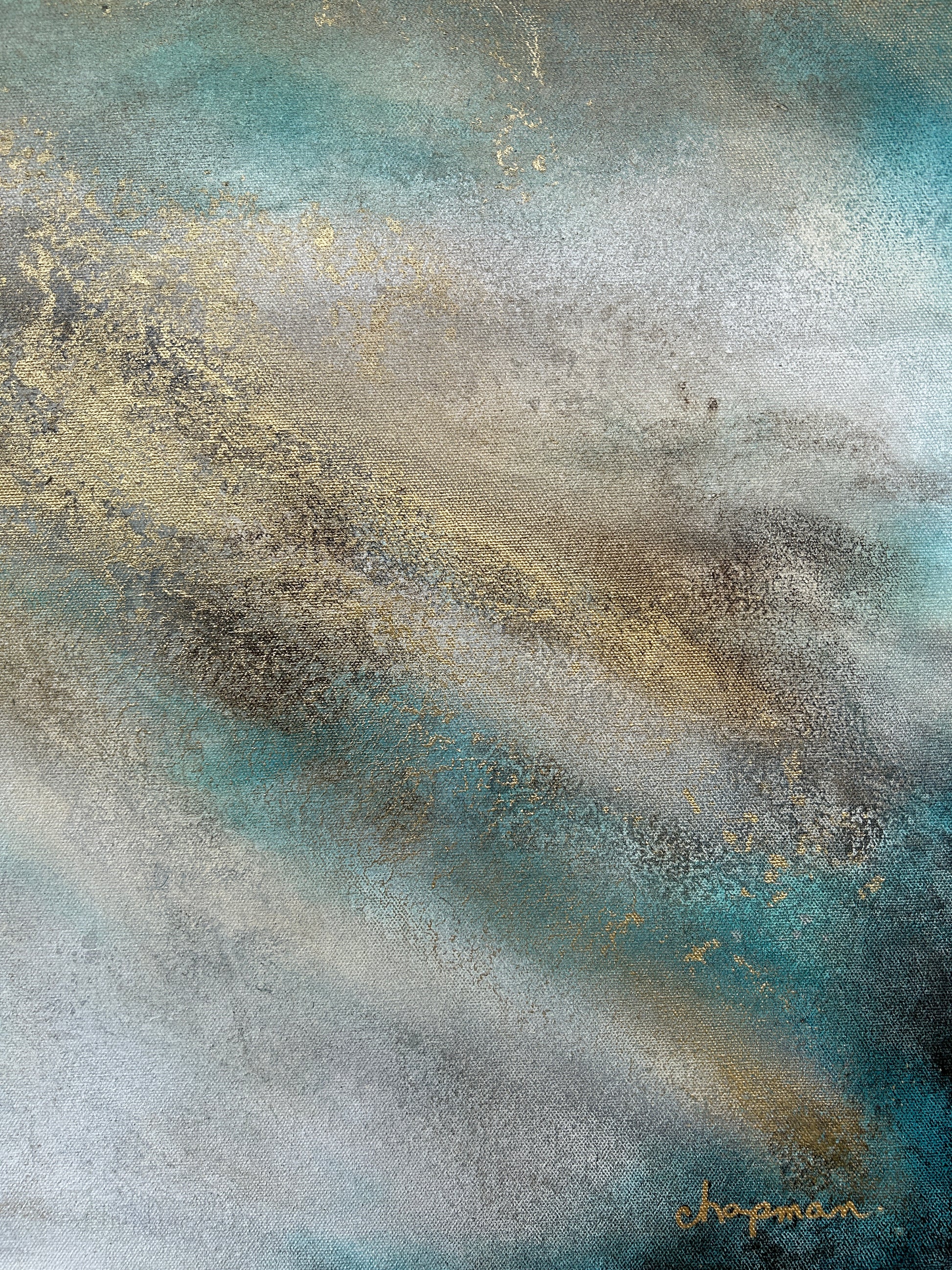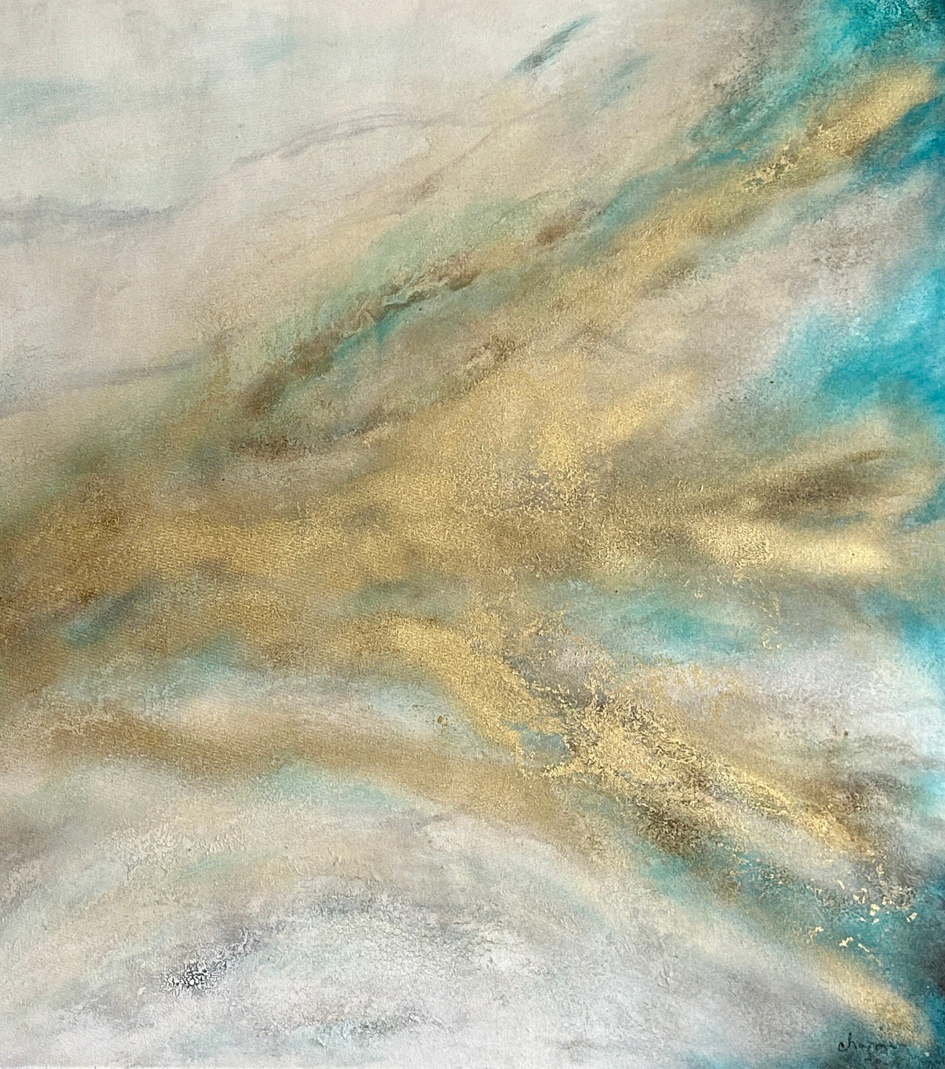 “Corrientes en Movimiento” Esta obra evoca el movimiento fluido y dinámico de los elementos naturales, como el agua o el aire, representado en la pintura. Los tonos fríos de azul, verde esmeralda, blanco y gris se entrelazan con las vetas doradas, creando una sensación de lujo y profundidad. “Corrientes en Movimiento” sugiere una experiencia visual y emocional que va más allá de lo tangible.