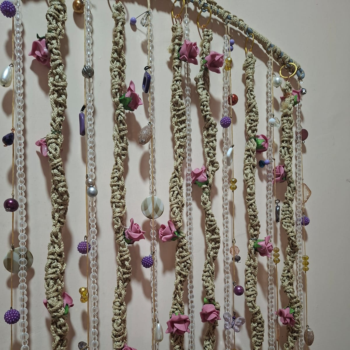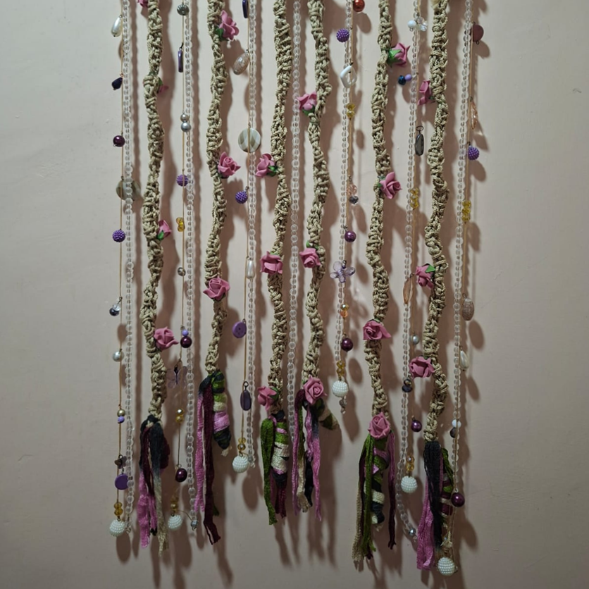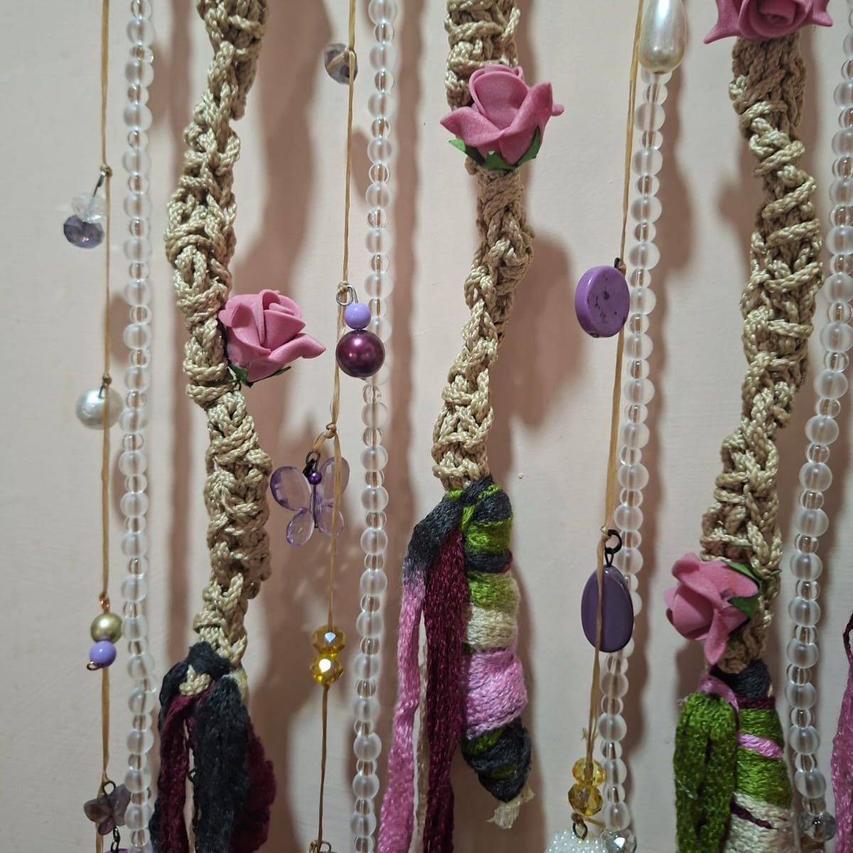 Delicado adorno para pared tejido con hilo para macramé, adornado con pequeñas rosas de seda, cuentas acrílicas de diferentes tonos de morado y rosas con largas tiras hechas con cuentitas esféricas de cristal. Todo esto está sujeto a una estructura metálica en forma de percha para ropa. Al final de cada tira las adornan unos listones de colores estilo hippie.