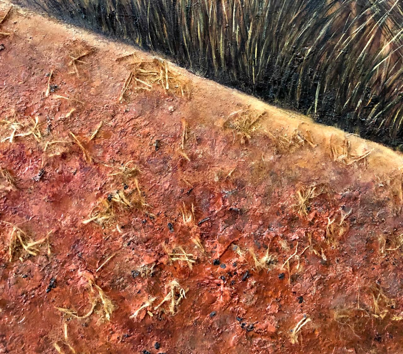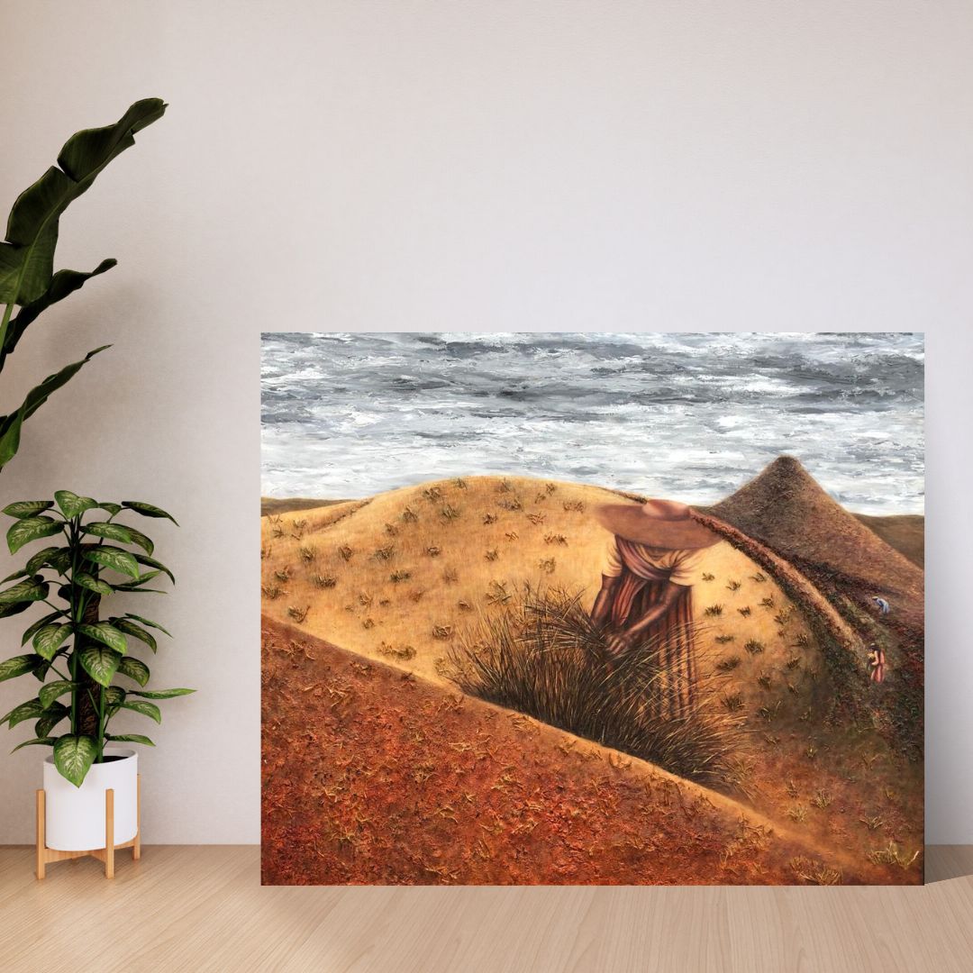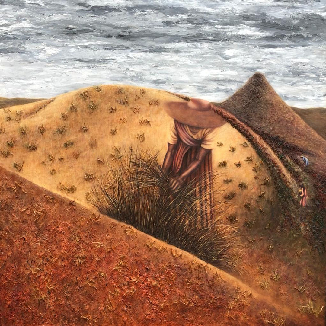 La textura de la obra enfatiza la rudeza y el peso del trabajo agrícola, pero también la resiliencia de quienes cultivan la tierra con sus manos. Los tonos ocres y terrosos dialogan con el cielo transmitiendo la dureza del entorno, pero también la fuerza de la mujer que lo habita. La mujer no es solo parte del paisaje, sino aquella que siembra, sostiene y transforma el mundo desde la raíz.