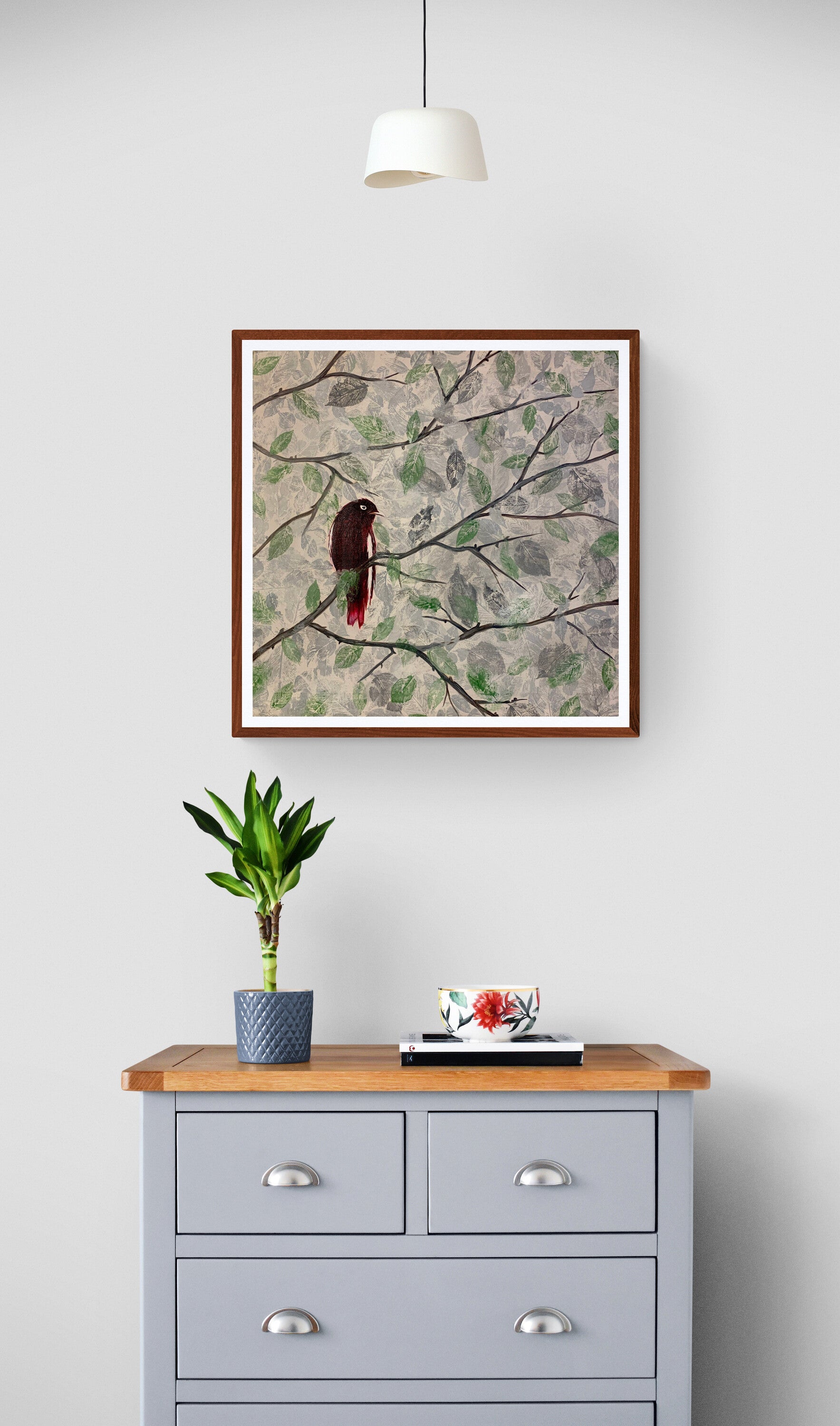 Lo que motiva esta serie es la amalgama entre la impresión colorida de hojas frescas y la transferencia de imágenes de aves; con lo que pretendo reproducir la magia de la naturaleza en el papel o el lienzo y trasladarla a la mirada de quien decida tener a su alcance cotidiano un pedacito de realidad.