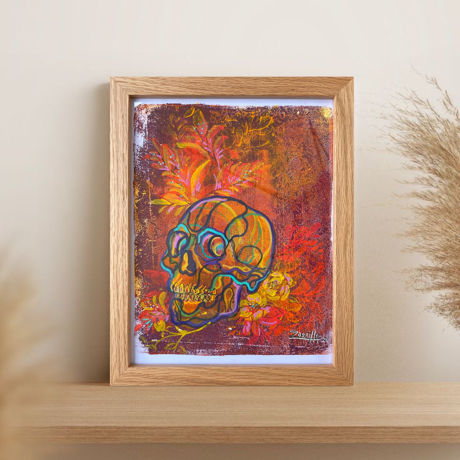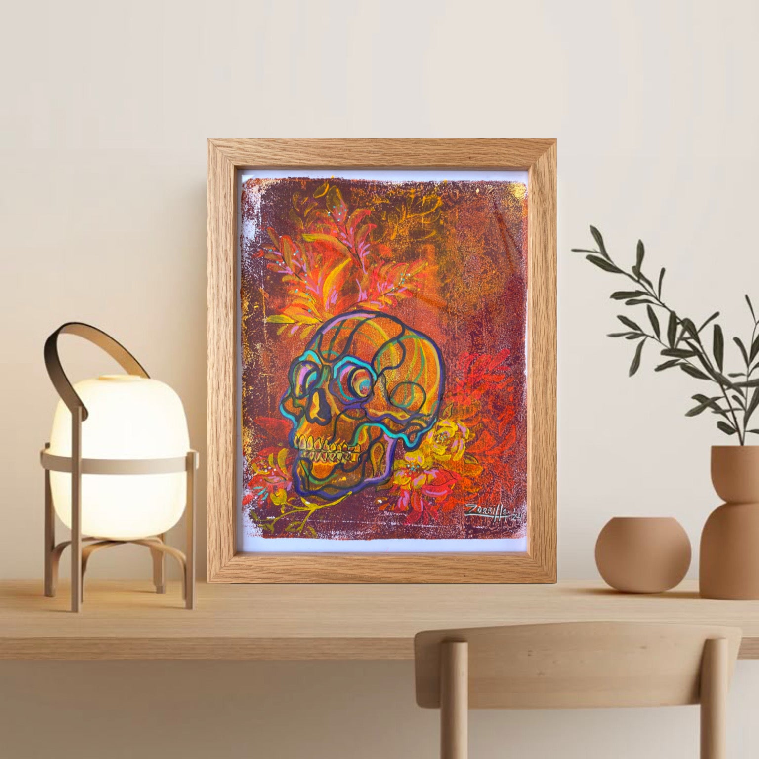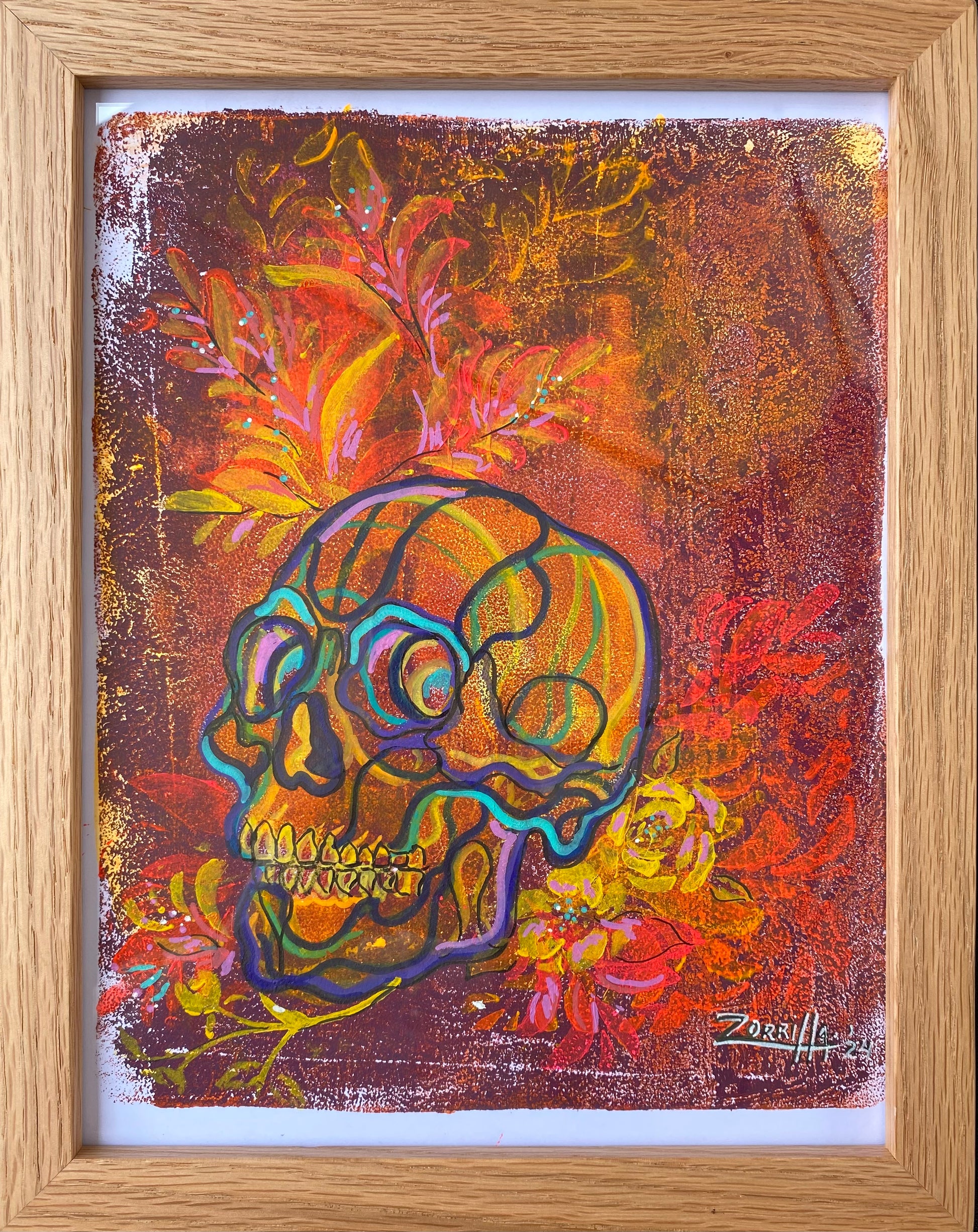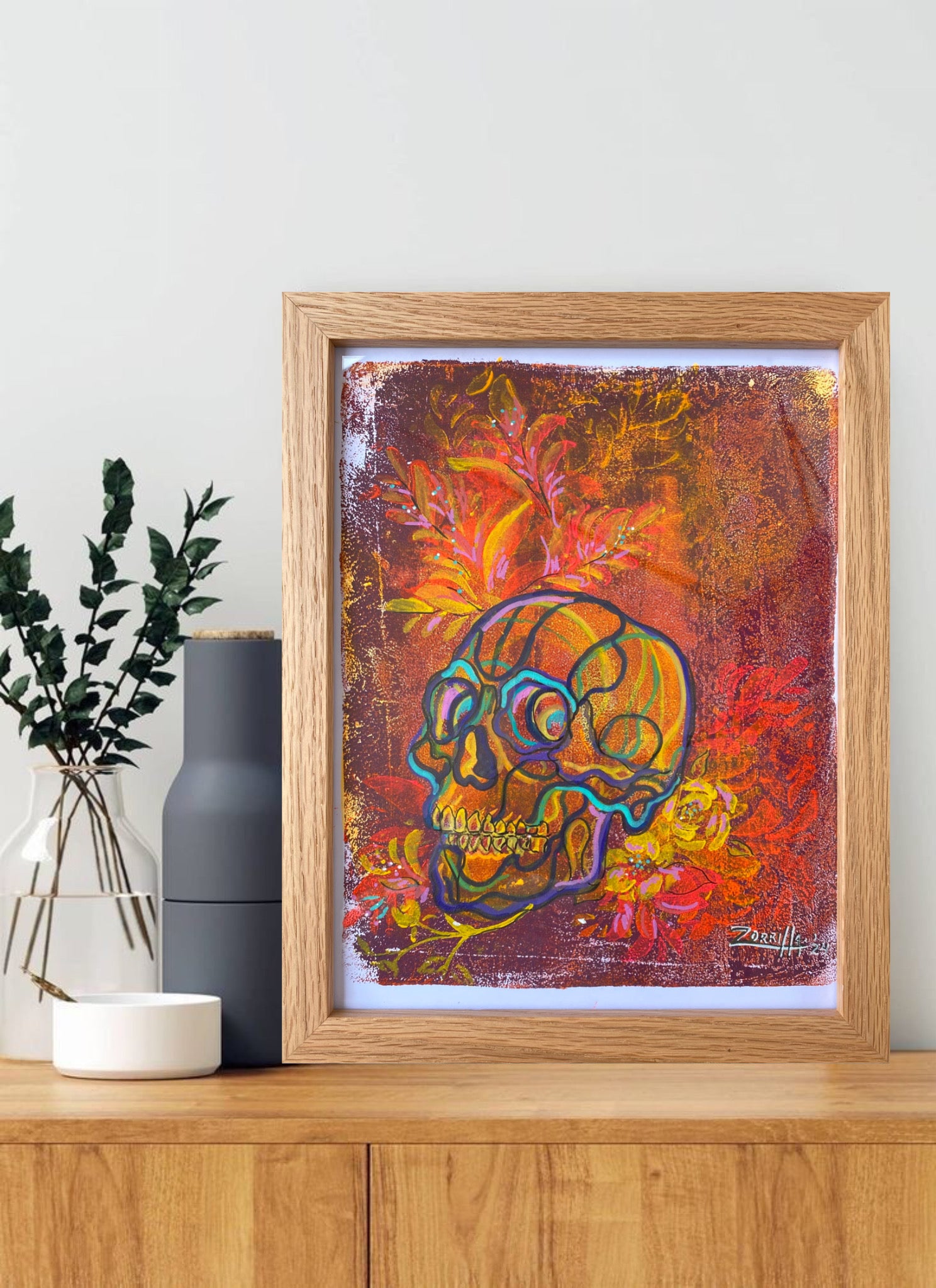 Pintura acrílica sobre papel, incluye marco de madera natural.