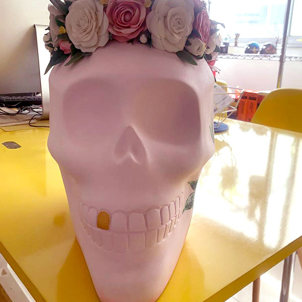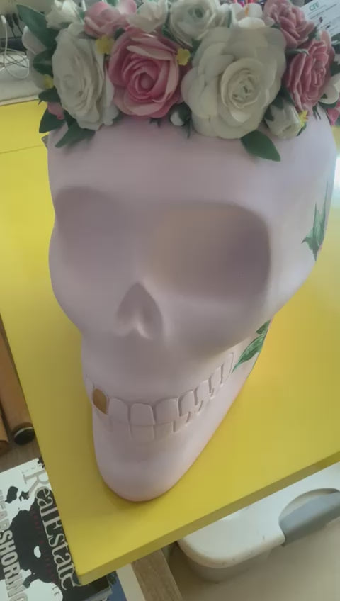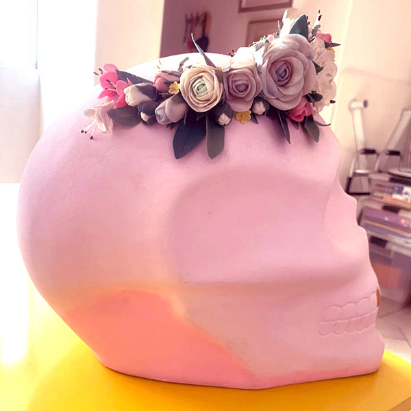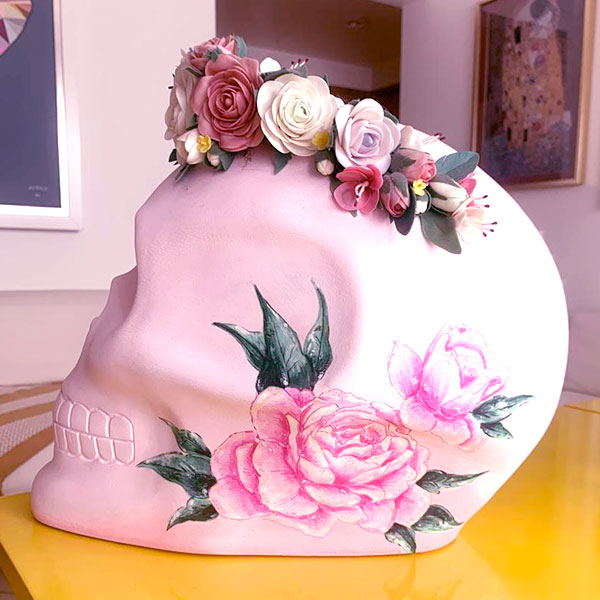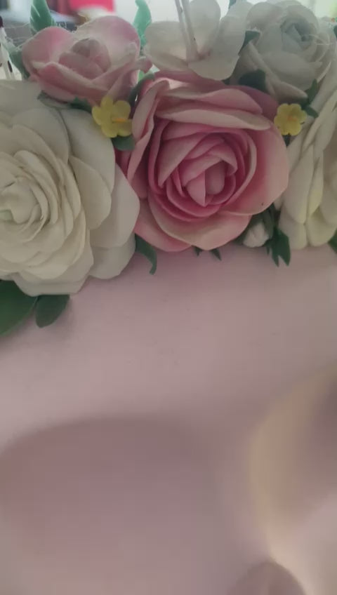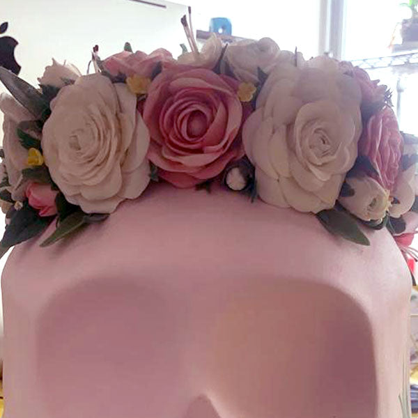 Un homenaje a nuestra gran artista mexicana, inspirada en Frida K. Detalles de diadema con flores de pasta fría hechas a mano y pintura en acrílico con motivos de rosas. El color base rosa pálido para resaltar el tocado, detalle principal el diente de oro.