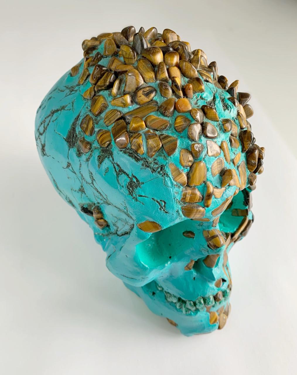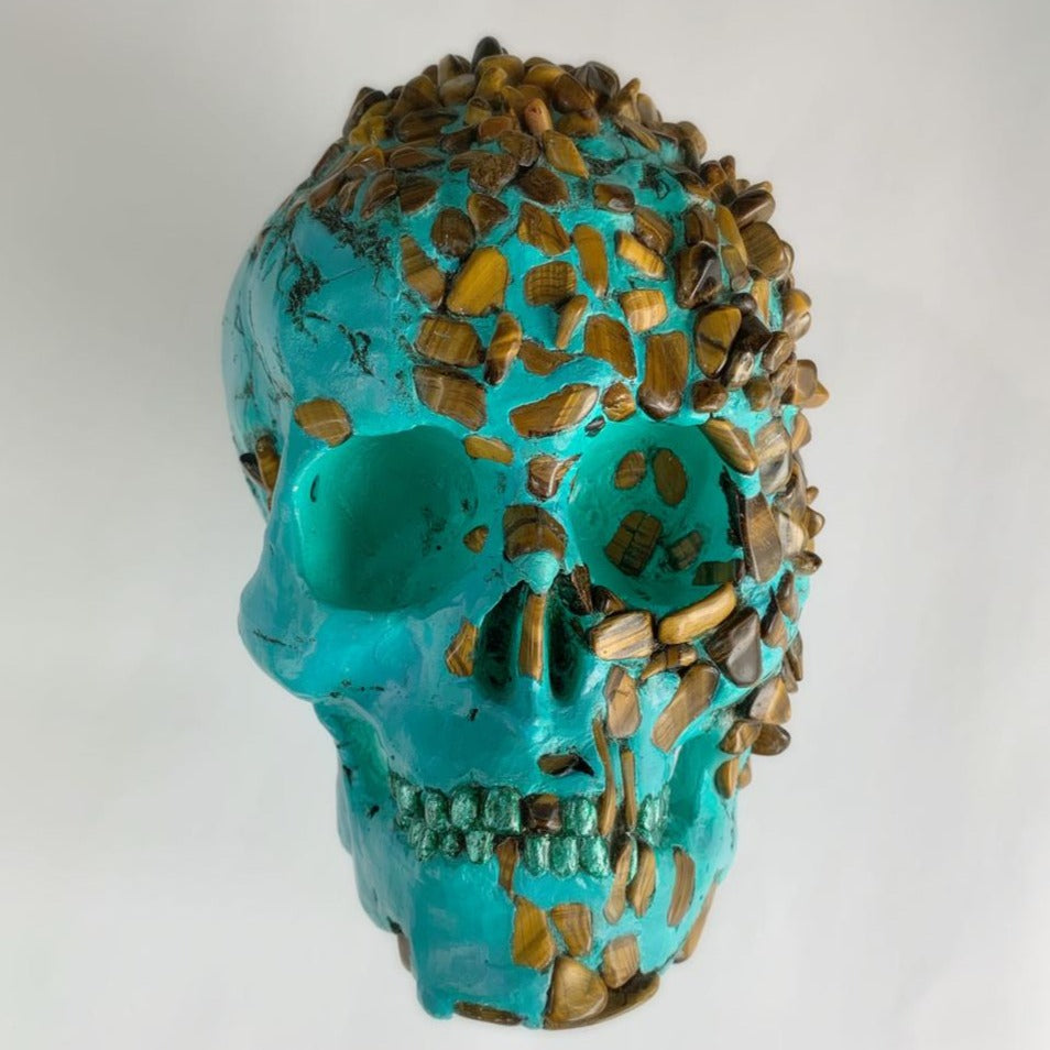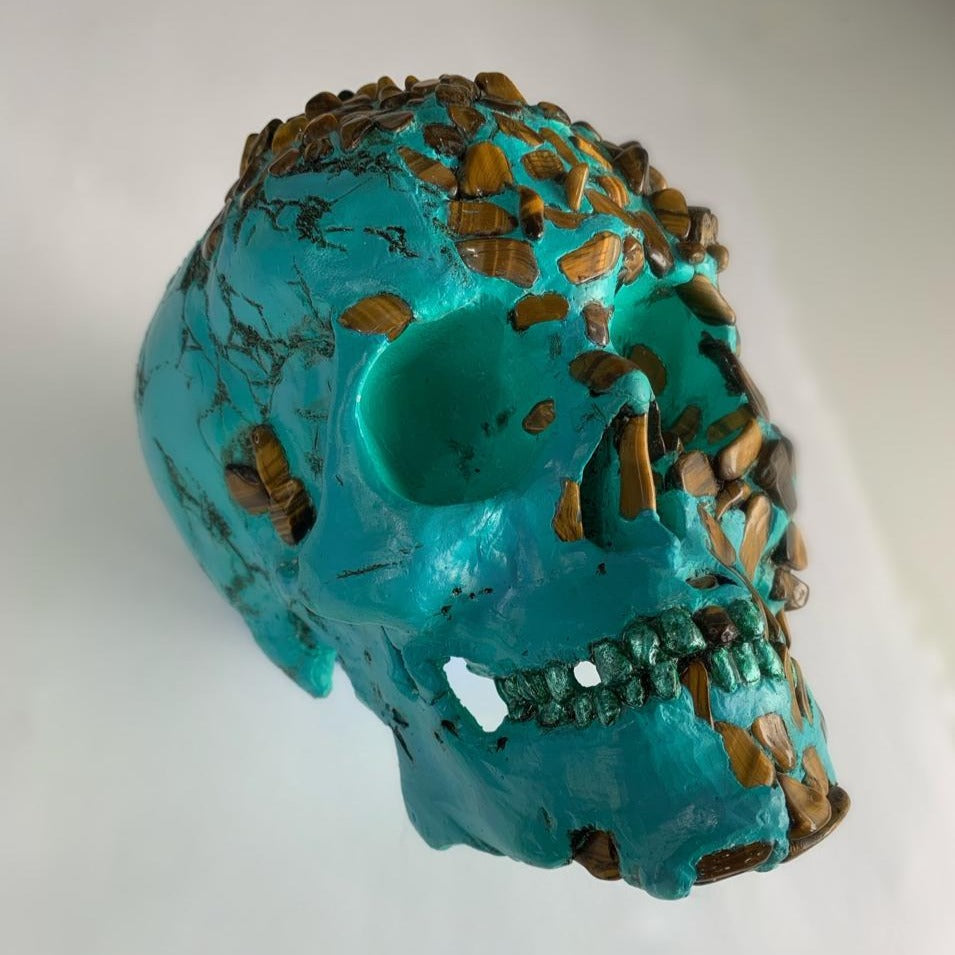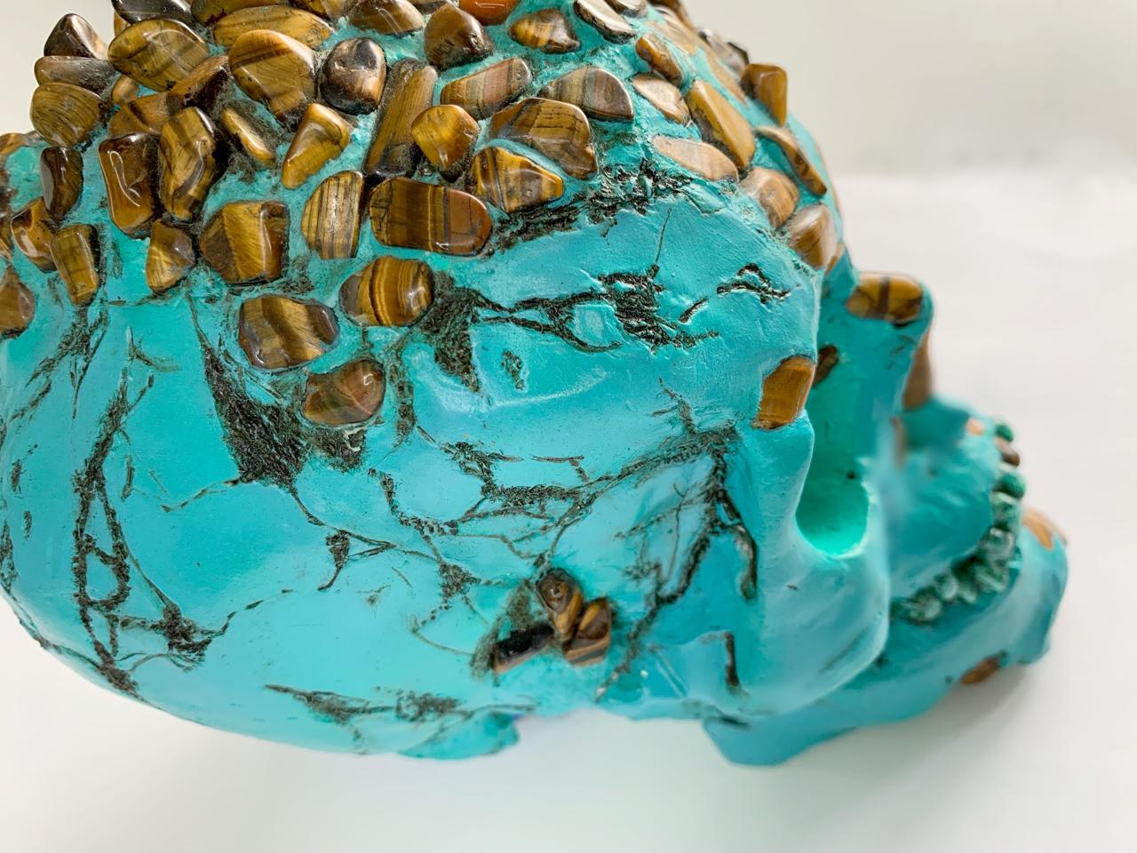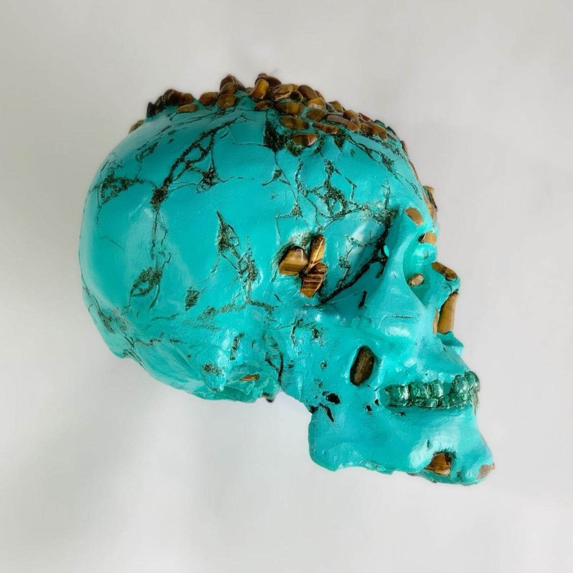 Craneo howlita turquesa falsa con incrustaciones de ojo de tigre verdaderas