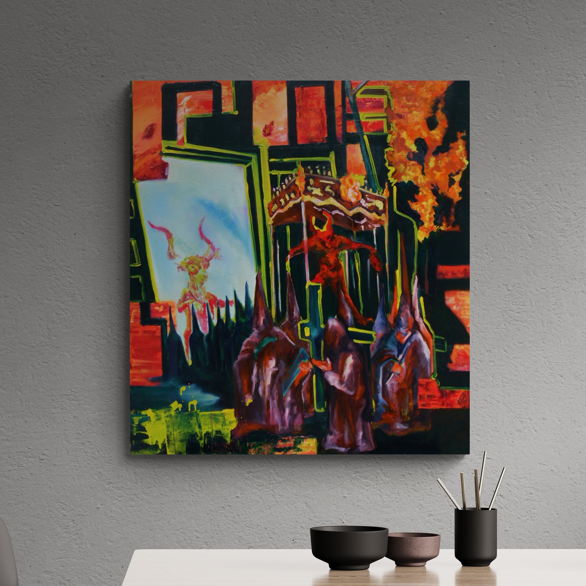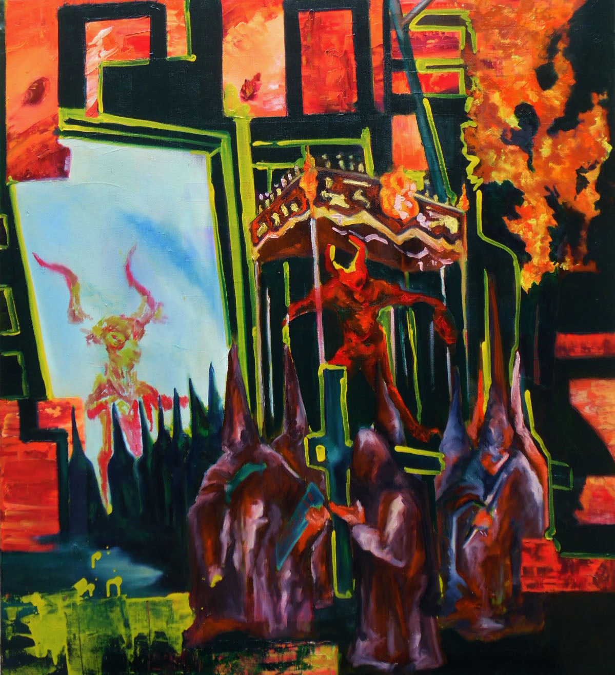 En esta pintura el artista busca reflexionar sobre el camino al Gólgota, sitio donde la muerte de cristo tuvo lugar. Explícitamente el artista coloca figuras que aluden al antagonista católico con la intención de señalar el morbo y la tortura que existe y existió al rededor del viacrucis, tanto en la mitología eclesiástica como en sus representaciones actuales, aludiendo también a la maldad de aquellos que con doble moral reivindican las prácticas religiosas.