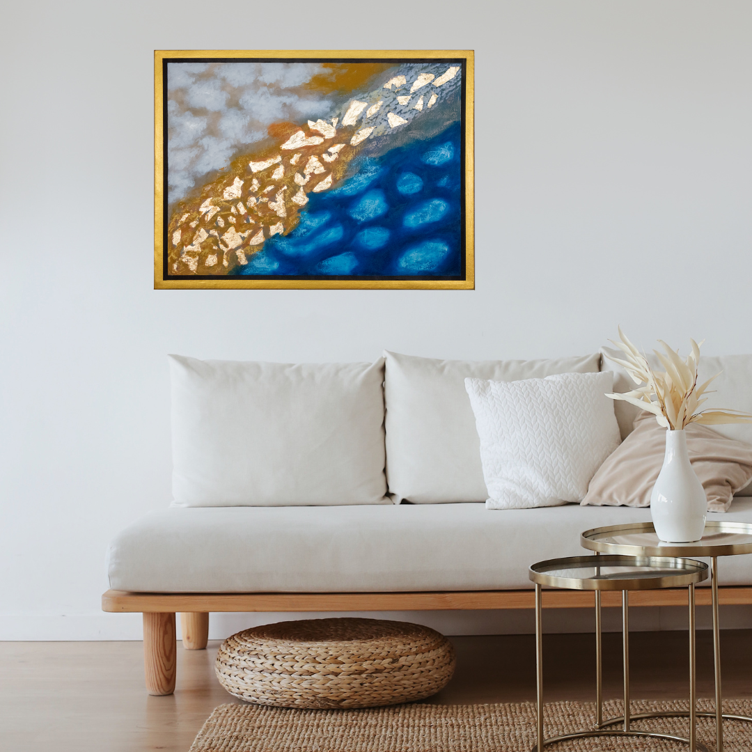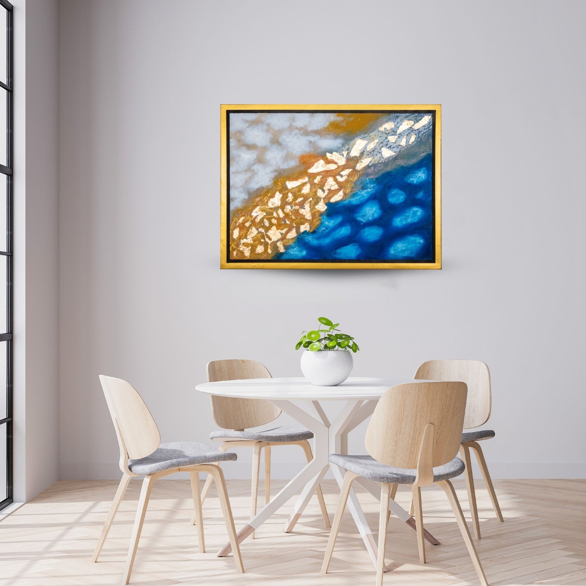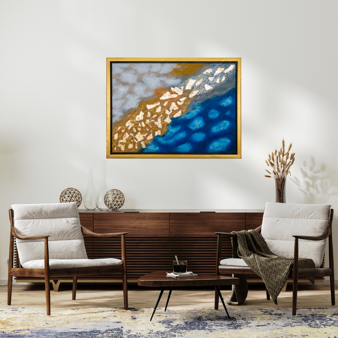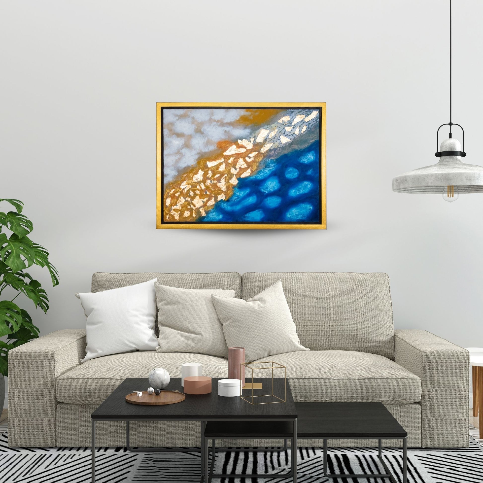 Cada pincelada y cada capa de esta pieza han sido meticulosamente elaboradas para evocar una sensación de dinamismo y una elegancia sin límites. Montado sobre un bastidor de madera de primera calidad, "Trilogía de Colores" no solo es una declaración artística, sino una pieza duradera y de alta calidad que transformará cualquier espacio. Sus colores vibrantes y la interacción de los materiales metálicos crean un punto focal innegable, añadiendo un toque de modernidad audaz y lujo inigualable a tu hogar u oficina.
