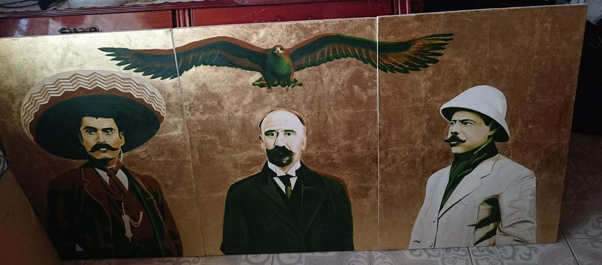 Mártires de la Revolución mexicana, Francisco I. Madero guiando con el águila revolucionaria a Emiliano Zapata a su derecha, y a su izquierda Francisco Villa. Tres modos de pensar diferentes con un objetivo común. Tríptico al oleo. Tres cuadros de 80 x 60 cms cada uno, hechos con óleo y lámina dorada, conforman el tríptico de Mártires que mide en total 80 x 180 cms.