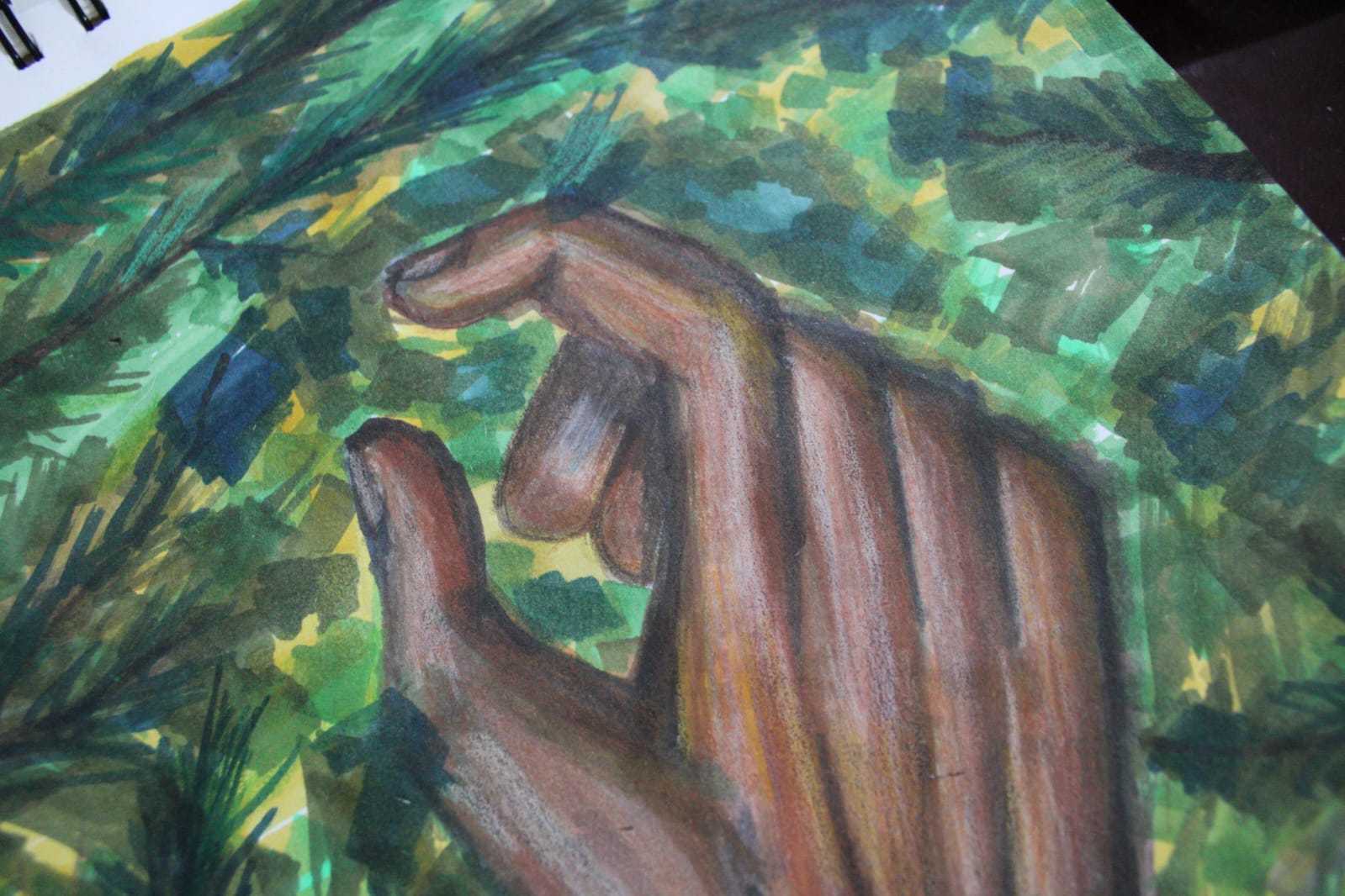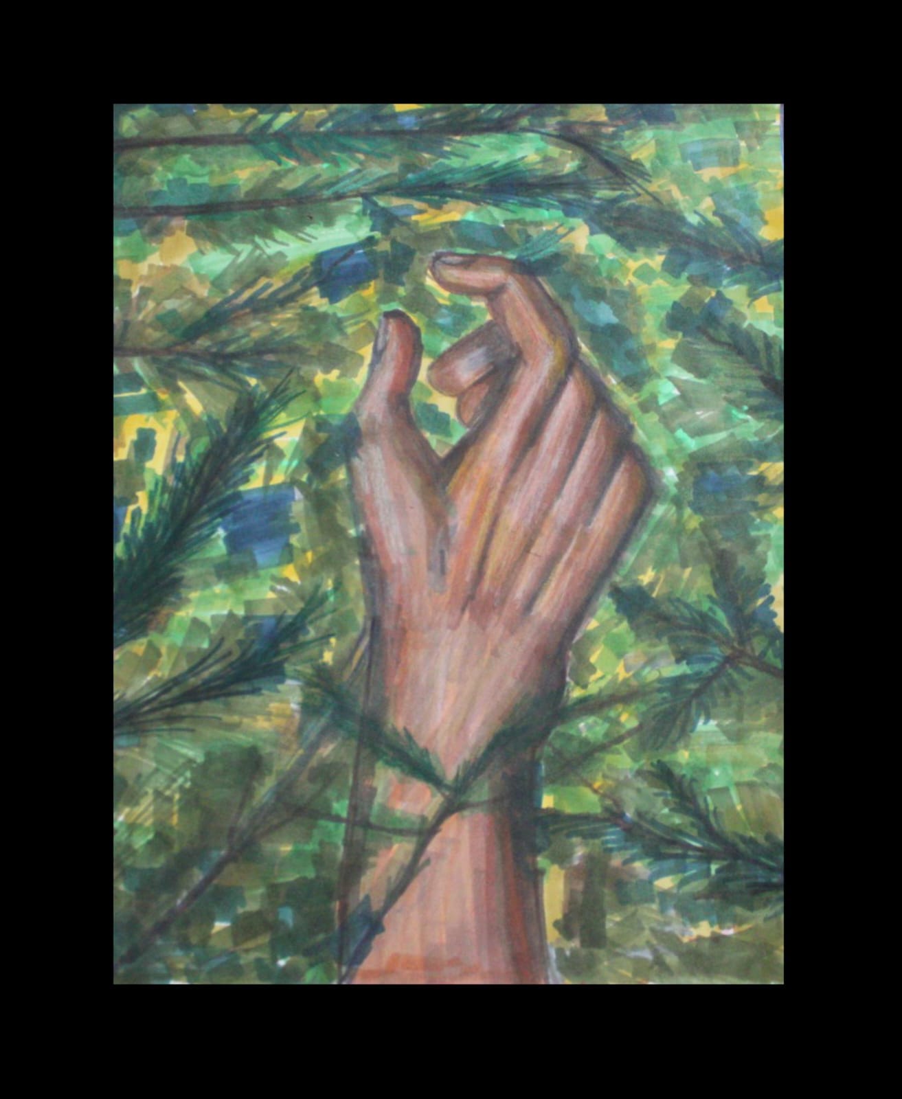La mano aparece atrapada entre ramas y hojas, no como un gesto de derrota, sino de resistencia silenciosa.