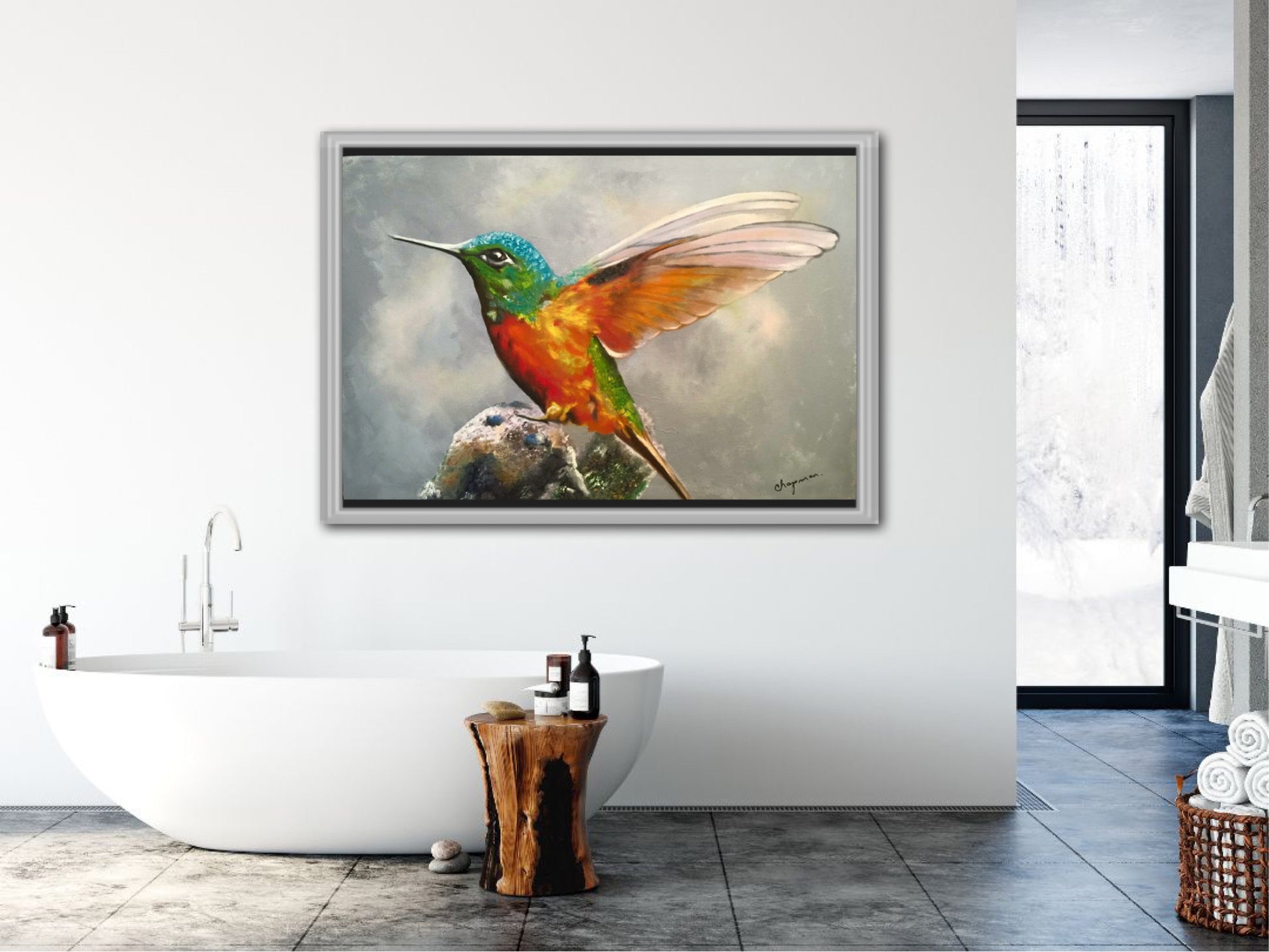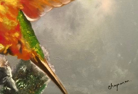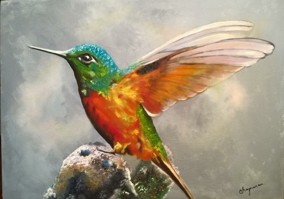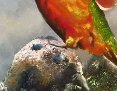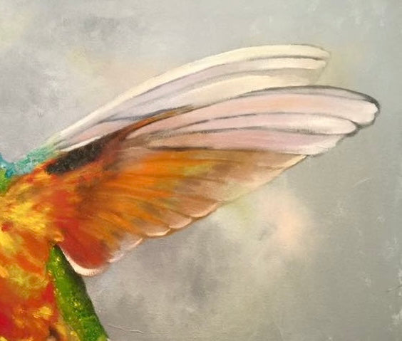 En el centro de la composición, un colibrí enérgico y vibrante se posa sobre una rama. Sus plumas brillan con tonos iridiscentes de y su pequeño cuerpo parece palpitar con vida. Las alas del colibrí están extendidas, como si estuviera a punto de despegar. Cada pluma está meticulosamente representada, desde las primarias hasta las secundarias, creando un efecto de movimiento y ligereza. Los ojos del colibrí son pequeños puntos oscuros, llenos de curiosidad y vitalidad. La rama en la que se posa el colibrí es rugosa y texturizada. Sus tonos marrones y grises contrastan con la vivacidad del ave. El nido, ubicado cerca del colibrí, contiene huevecillos. Los óvalos blancos y delicados representan la vida y la esperanza y con esto transmitir la fragilidad y la promesa de futura vida. El fondo es difuso y etéreo, como si la escena se desarrollara en un sueño. Los colores suaves y difuminados sugieren la conexión entre el mundo terrenal y el espiritual.
