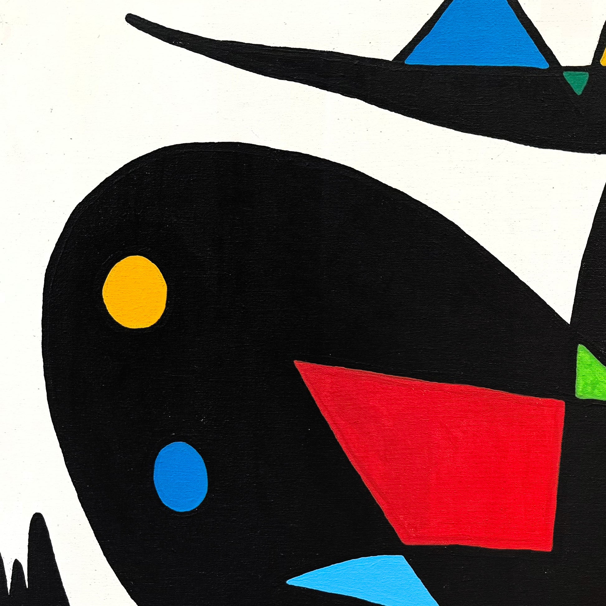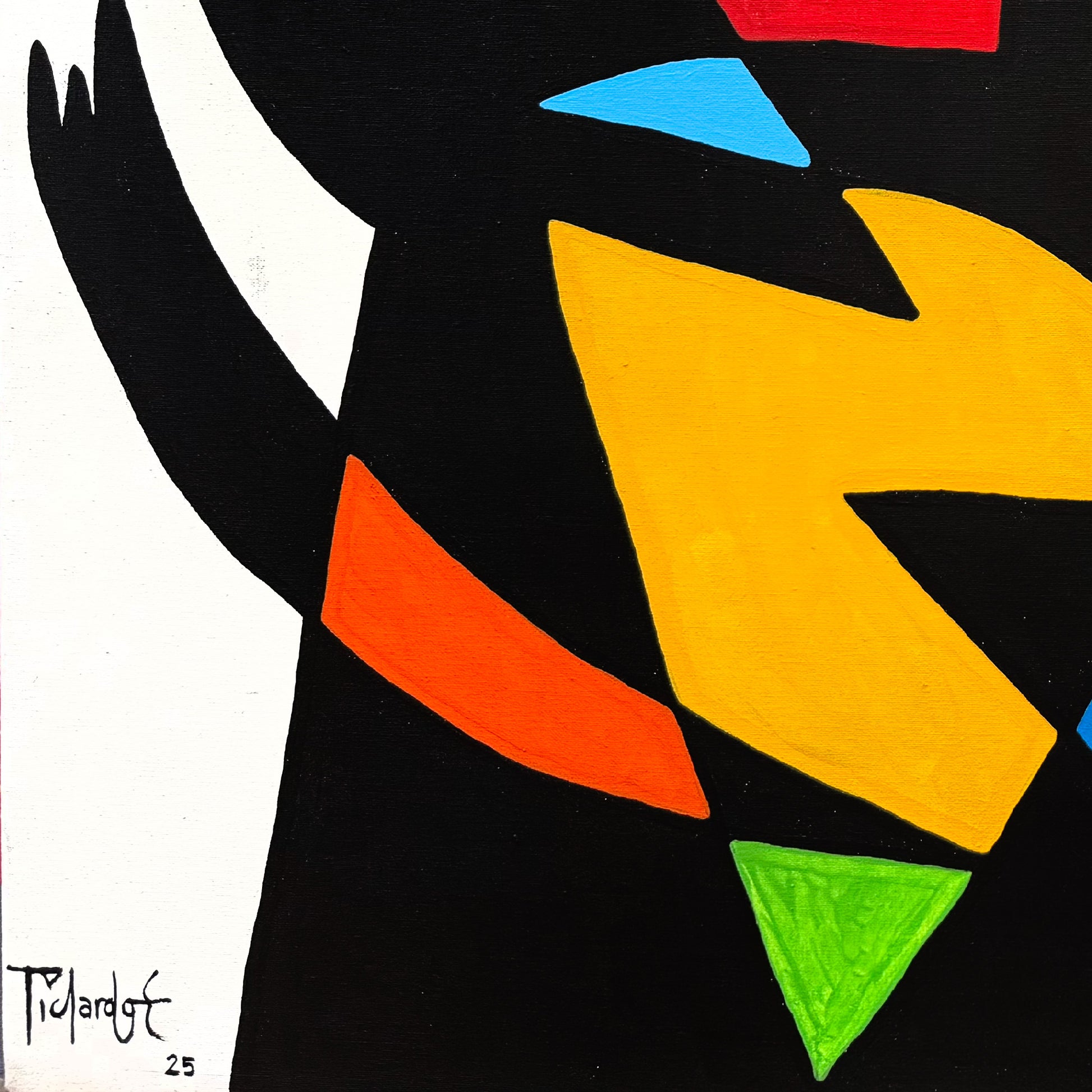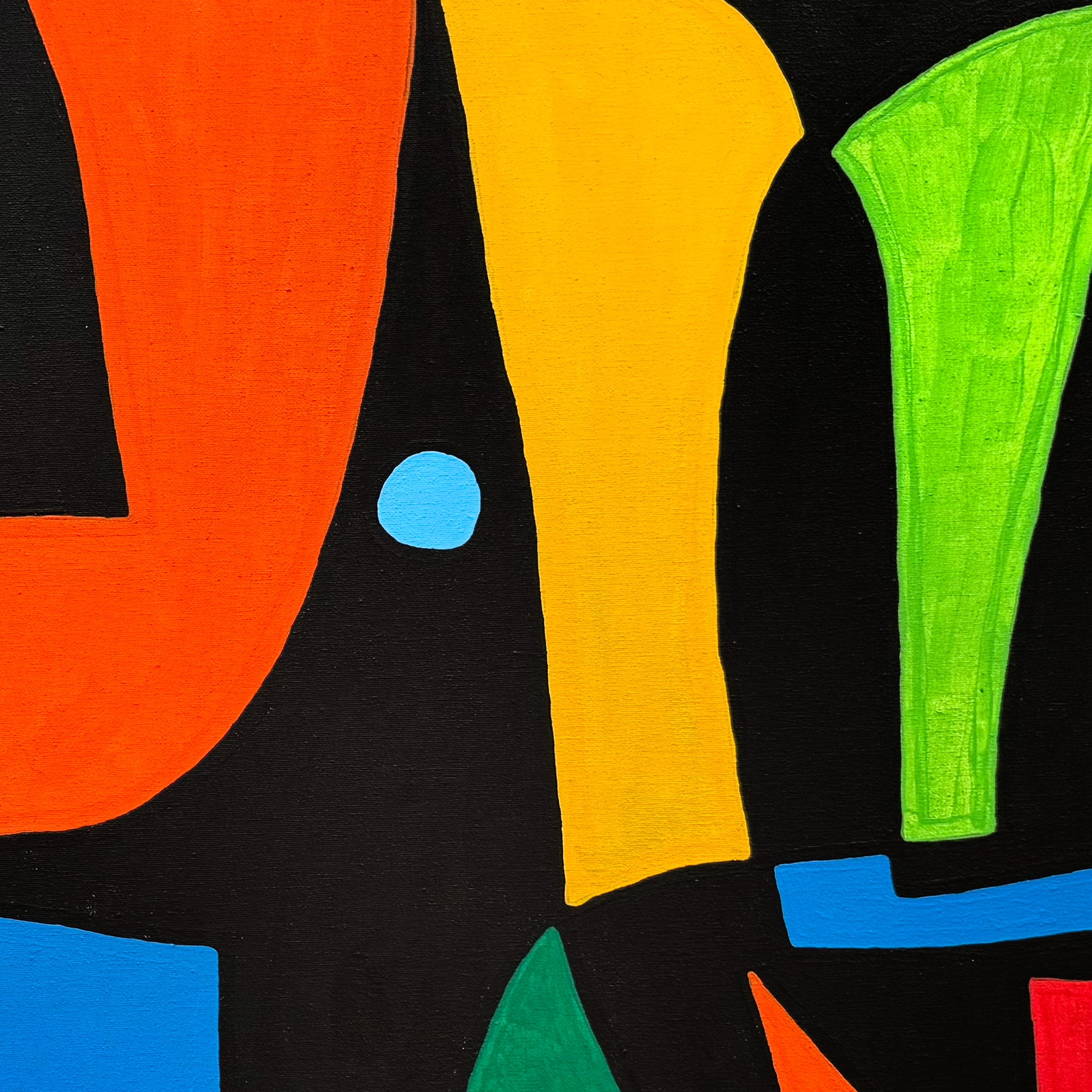 La pintura despliega un diálogo entre la geometría irregular y la armonía cromática, con zonas de color que alternan entre la saturación del rojo, el brillo del amarillo, el azul profundo y el verde intenso. Cada sección parece ocupar su propio territorio, generando una sensación de movimiento controlado. Este equilibrio recuerda la síntesis formal del modernismo europeo, en particular la obra de Fernand Léger y Joan Miró, pero reinterpretada con una energía mexicana contemporánea. El resultado es una composición visualmente contundente, que combina abstracción lírica y precisión compositiva.