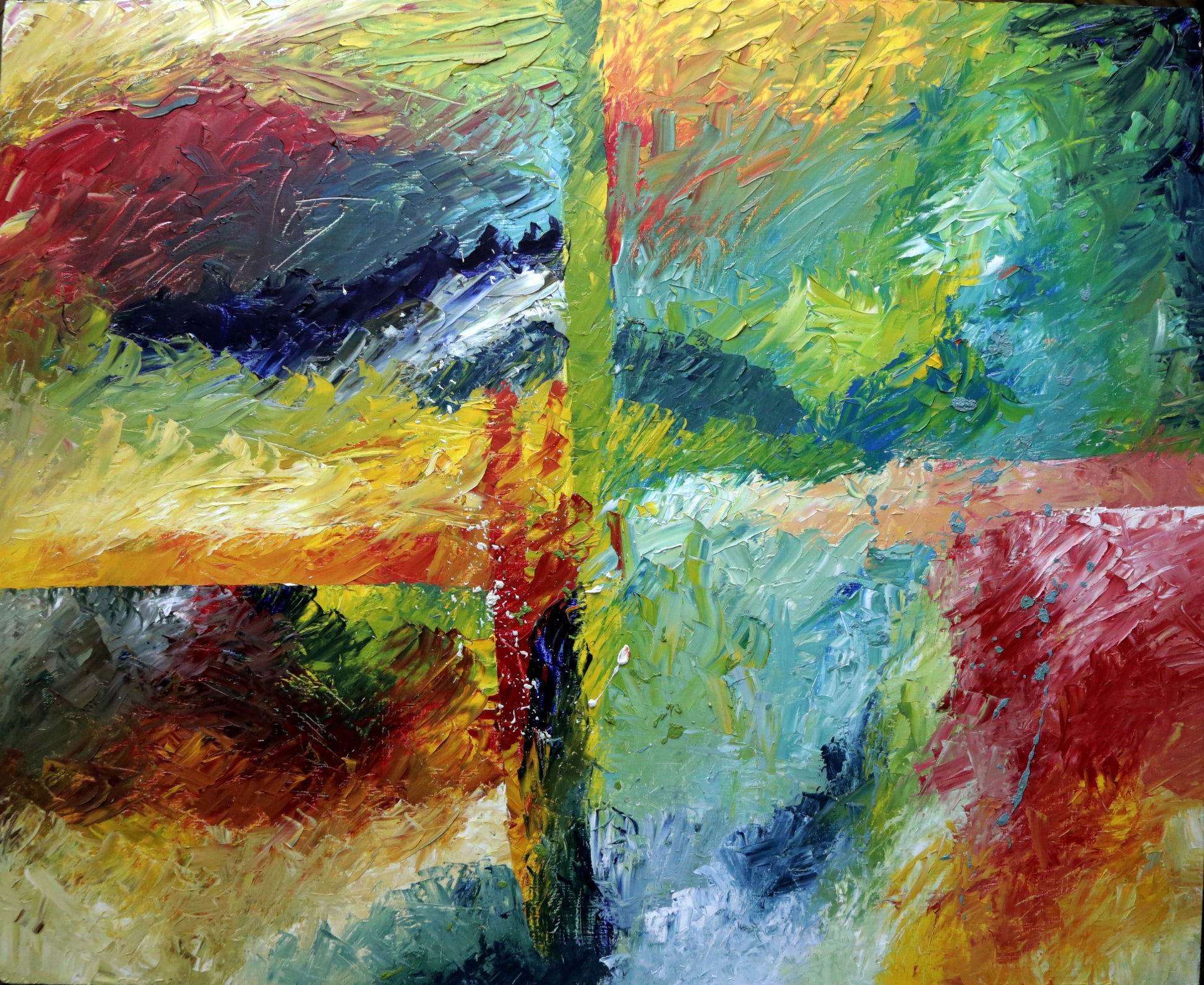 "Cuatro rumbos" es una obra de la colección "Paisajes Sonoros", realizada en óleo sobre madera, con dimensiones de 70 x 100 cm. Esta pieza explora la interacción dinámica entre formas y colores en un formato expansivo. El lienzo está dividido en cuatro secciones que sugieren distintos puntos cardinales, cada una con una paleta de colores vibrantes y contrastantes que se entrelazan y se superponen, creando un efecto visual de movimiento y energía.
