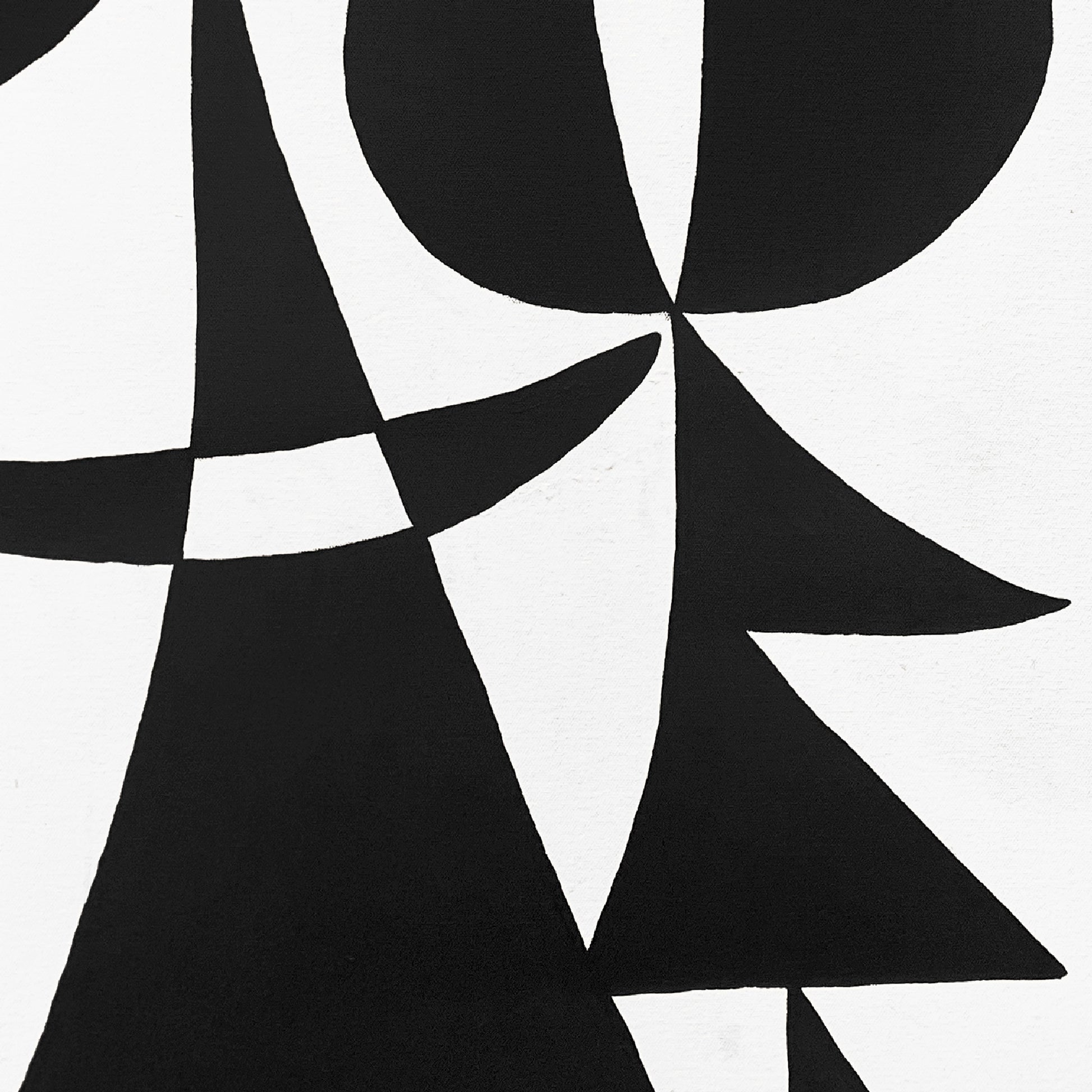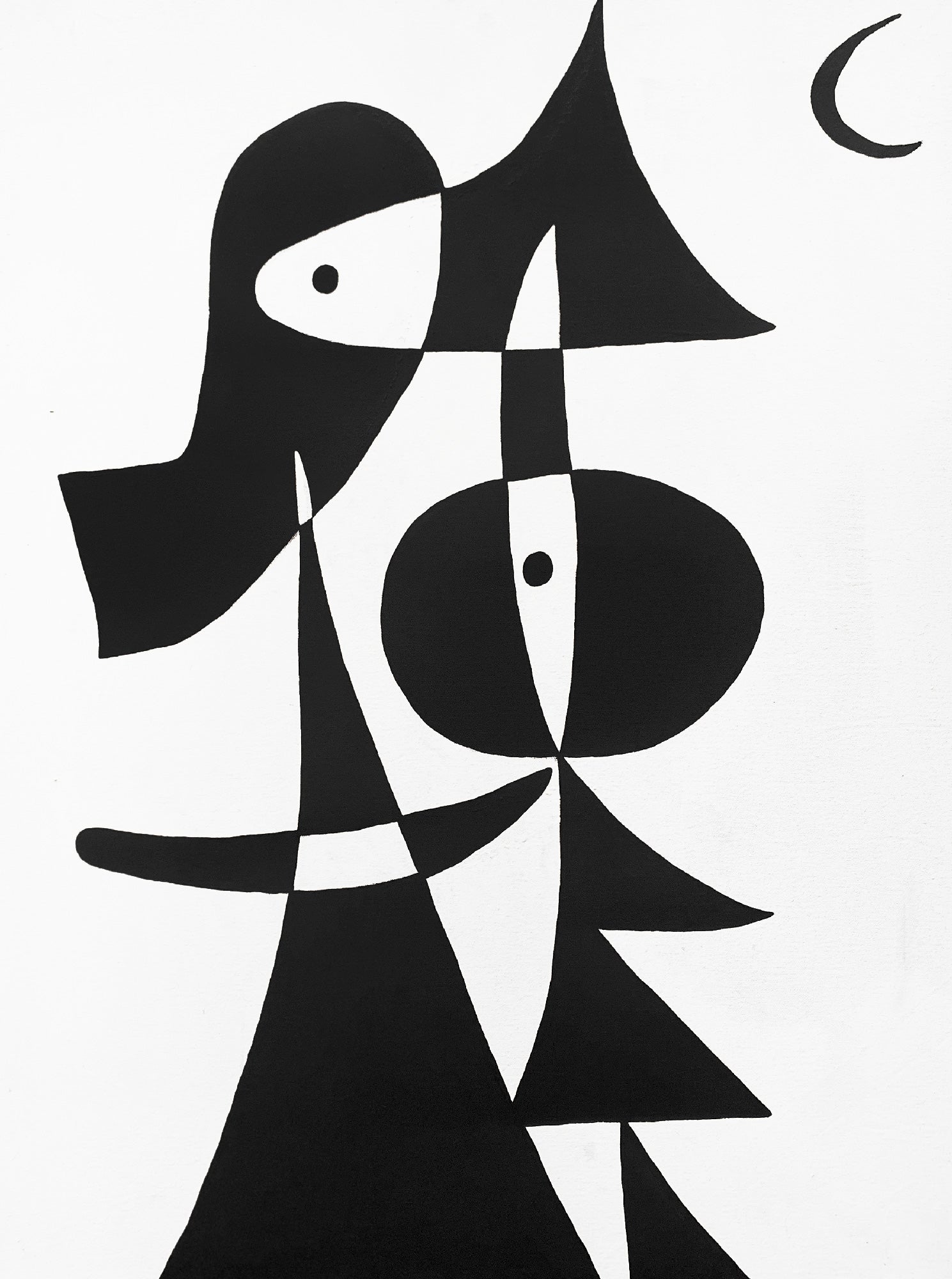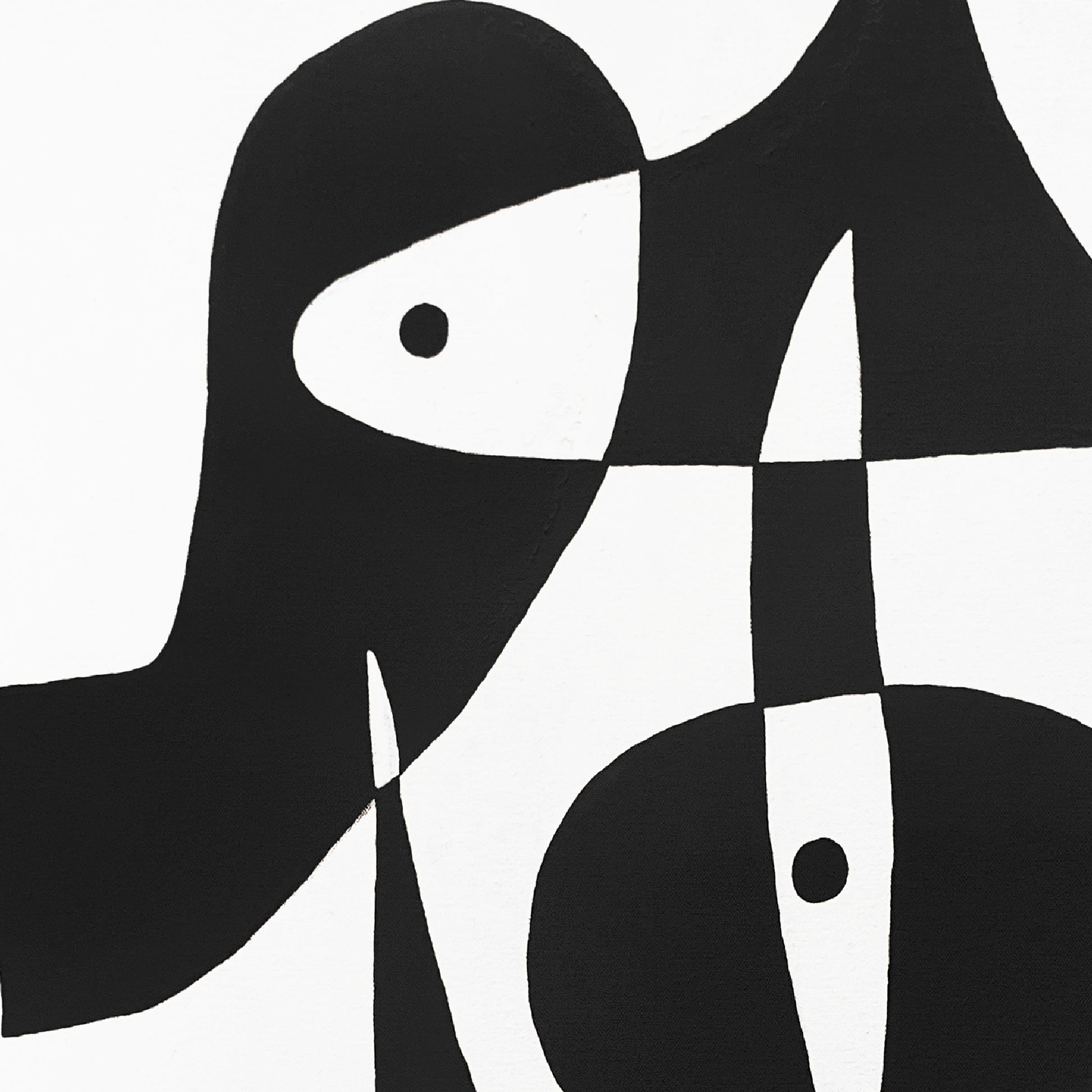 A través del blanco y el negro, Pichardo crea una atmósfera vibrante que contrasta con la sencillez de los recursos técnicos. Esta vitalidad, lejos de ser discreta, se expande desde las figuras que habitan el lienzo. Por medio de una mano ligera y una mirada inquisitiva, el artista redefine la profundidad sobre un plano, generando matices emocionales. Como resultado, la pieza remite a la alegría, al vigor y al regocijo de la vida.
