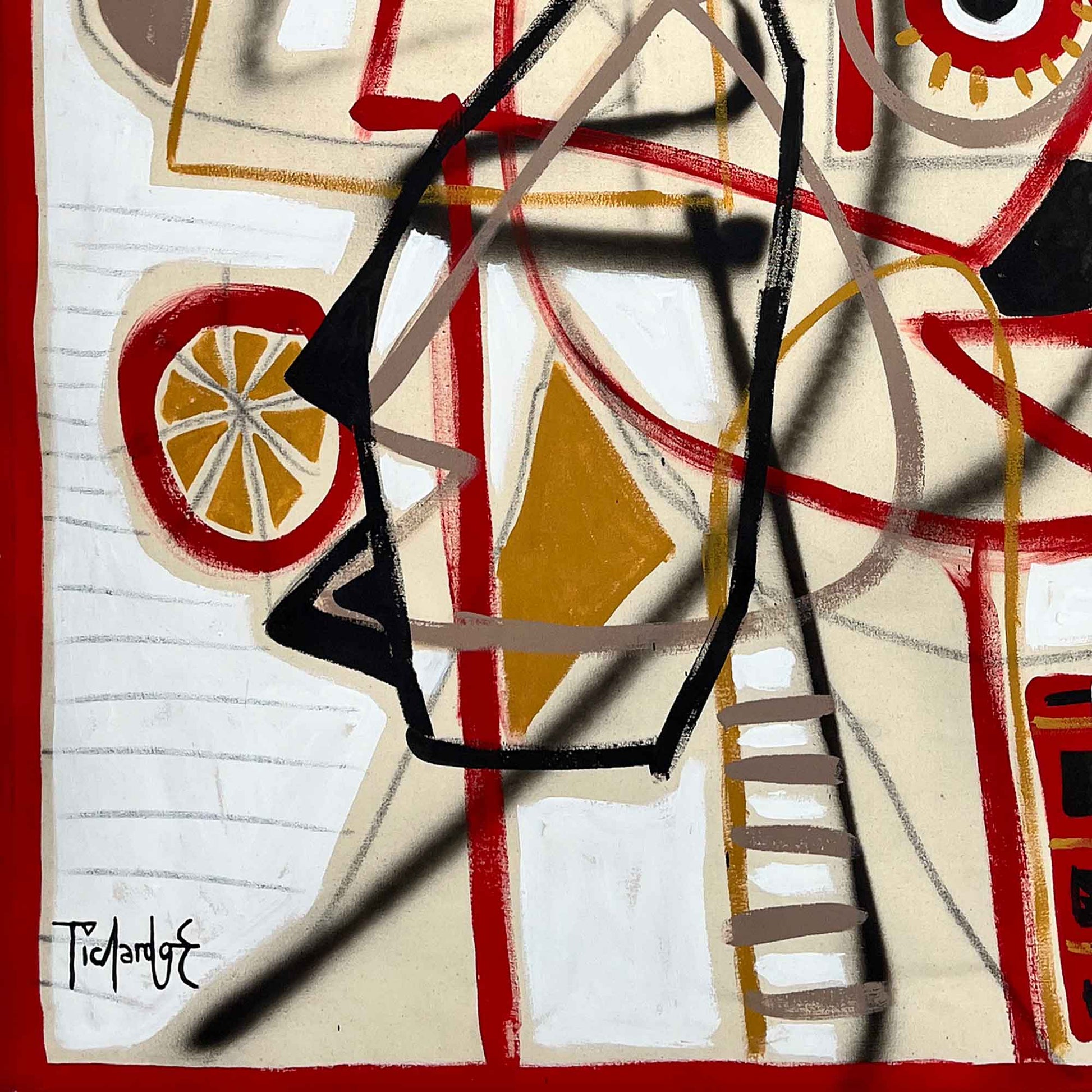 La silueta principal emerge de contornos que envuelven rojos intensos, amarillos brillantes, verdes vibrantes y azules profundos. Cada fragmento cromático actúa como una capa emocional que sugiere presencia y movimiento. La forma mantiene un equilibrio entre estructura y libertad, permitiendo que el dinamismo habitual en la obra de Pichardo se manifieste con claridad.