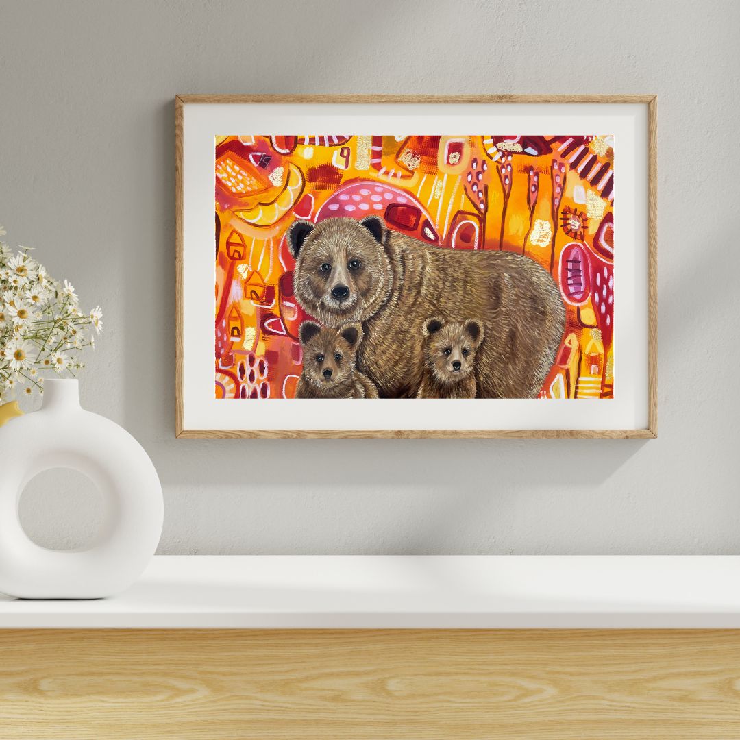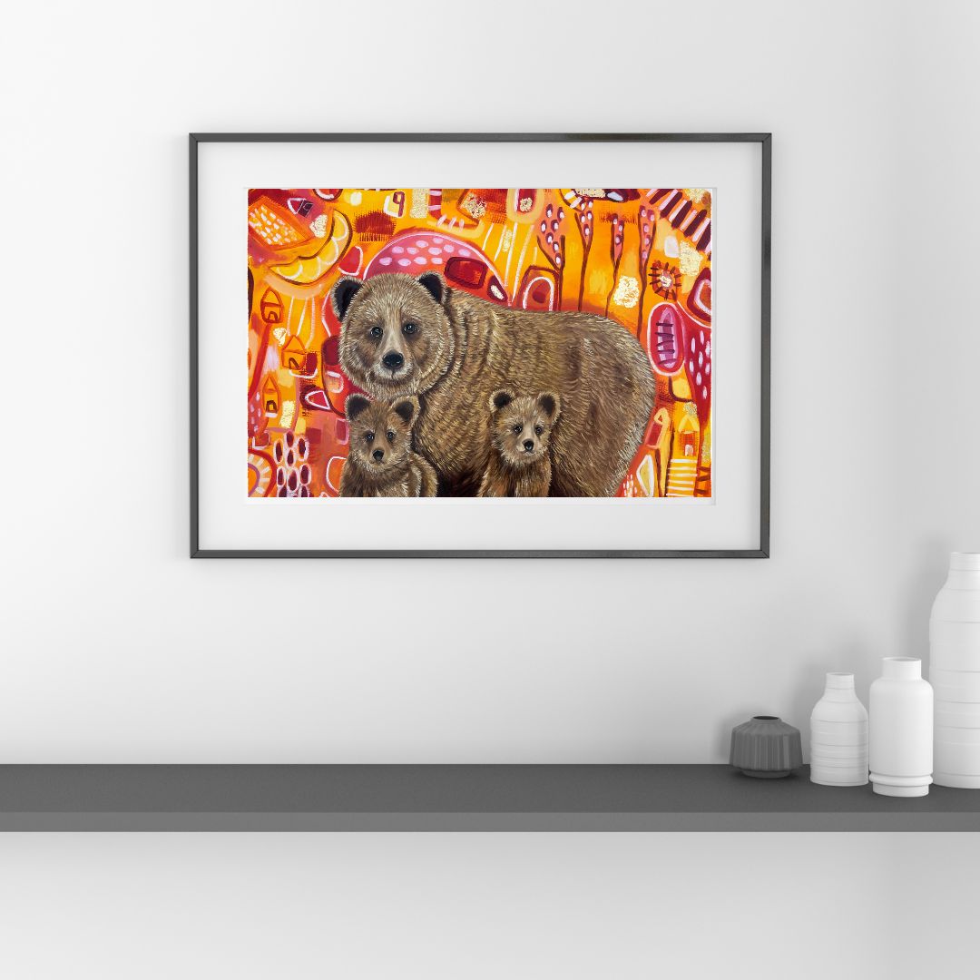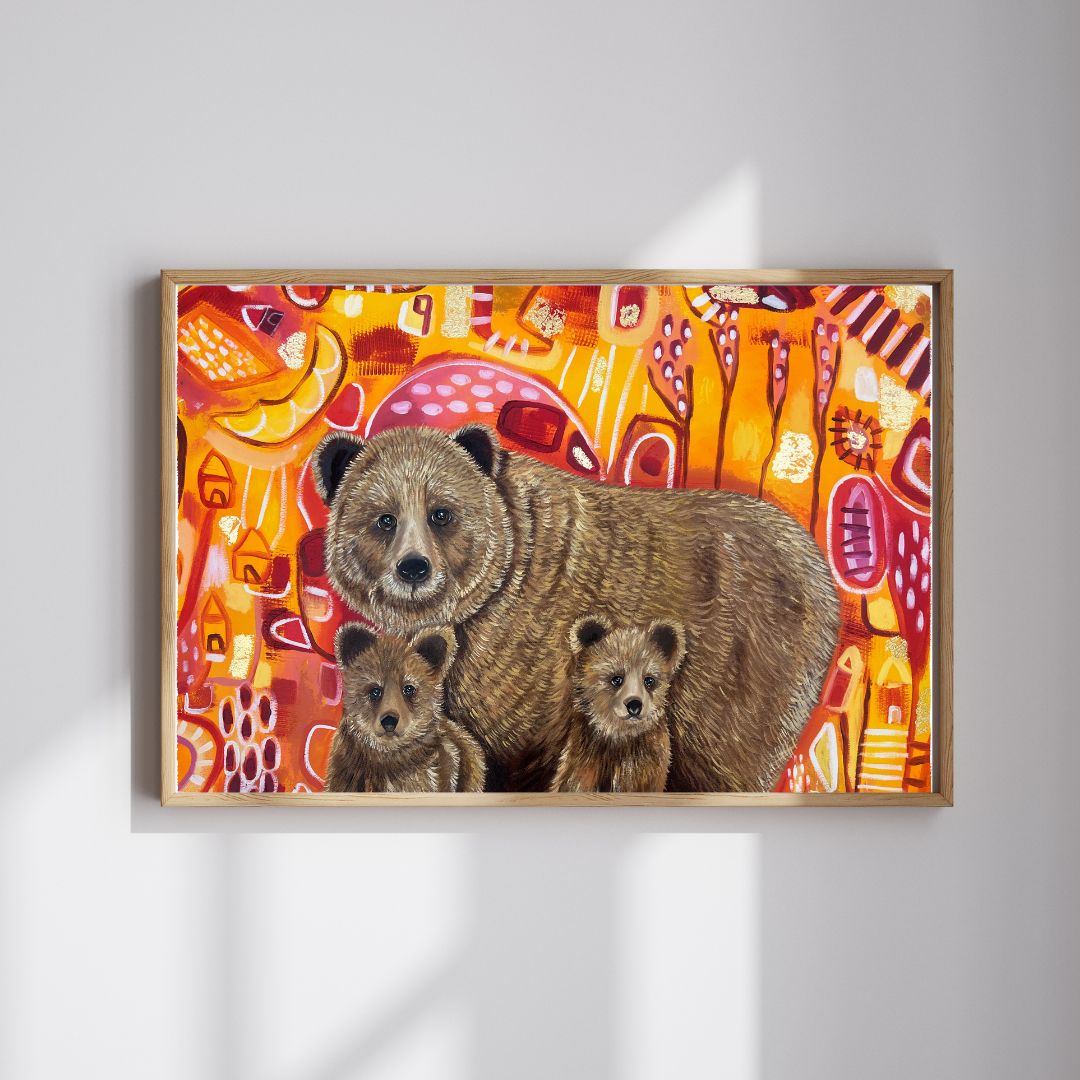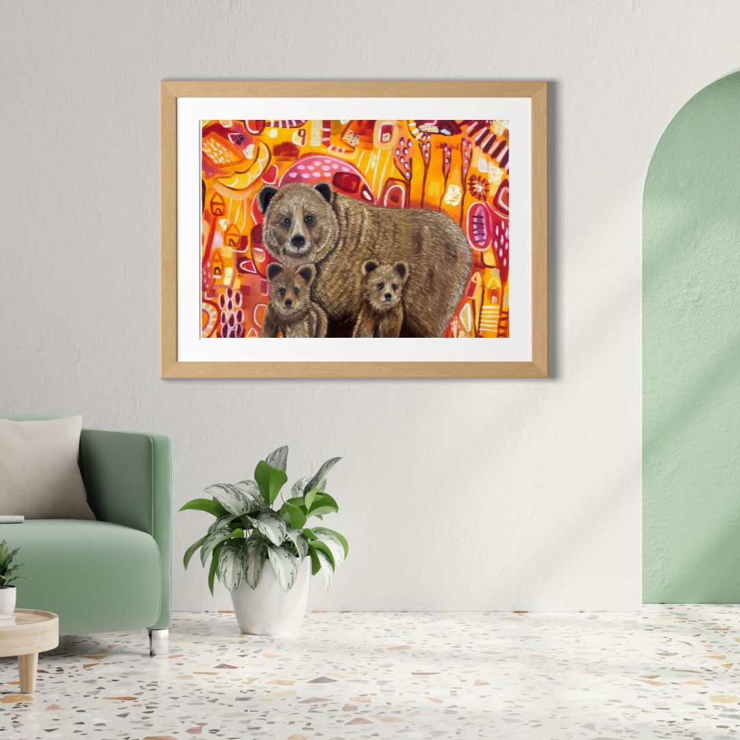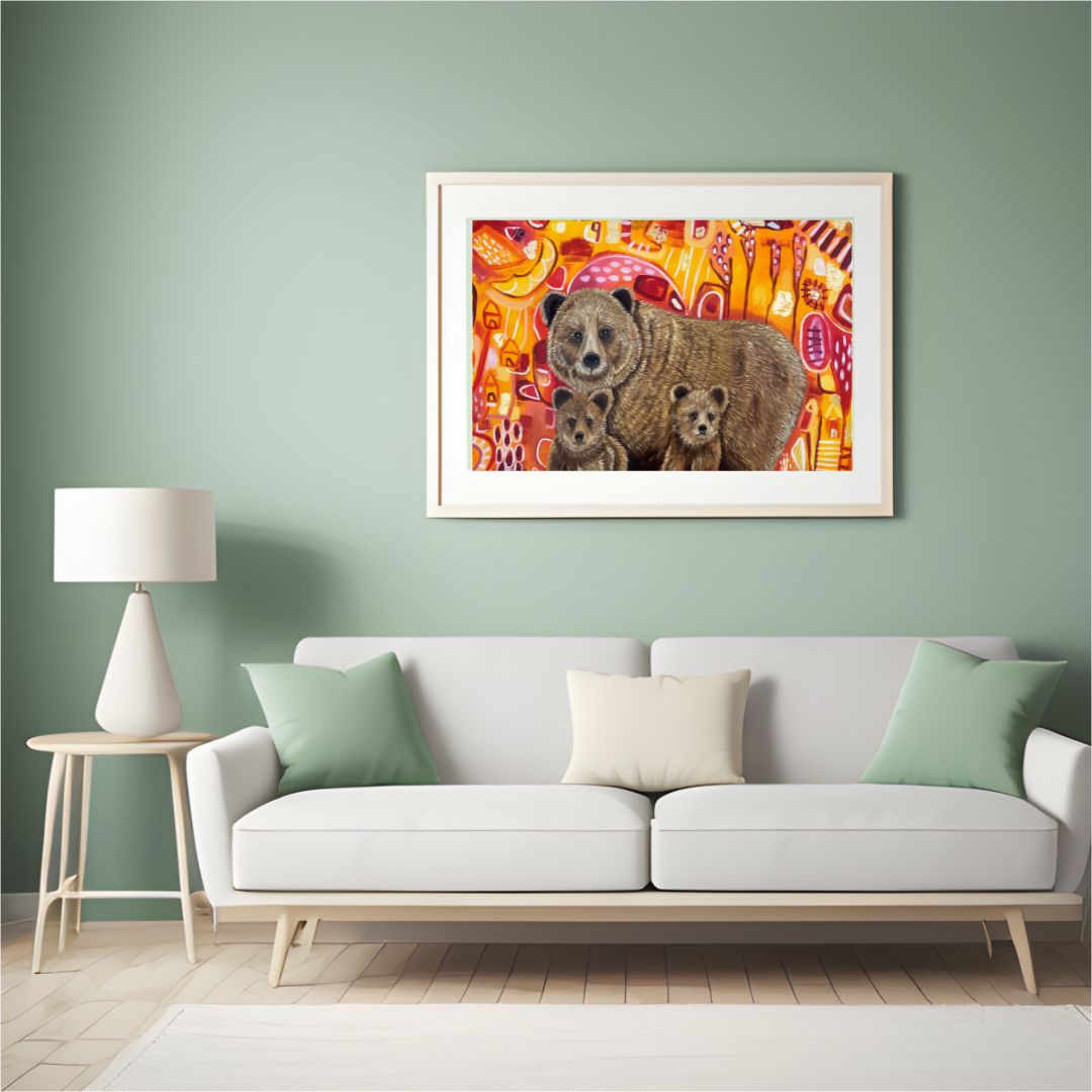 "Curious Little Bears". La belleza de la familia de osos con un fondo de colores llamativos que representa la expectativa de lo que viene, de lo que es el siguiente paso.