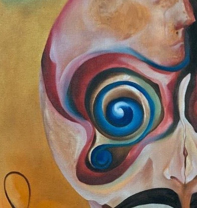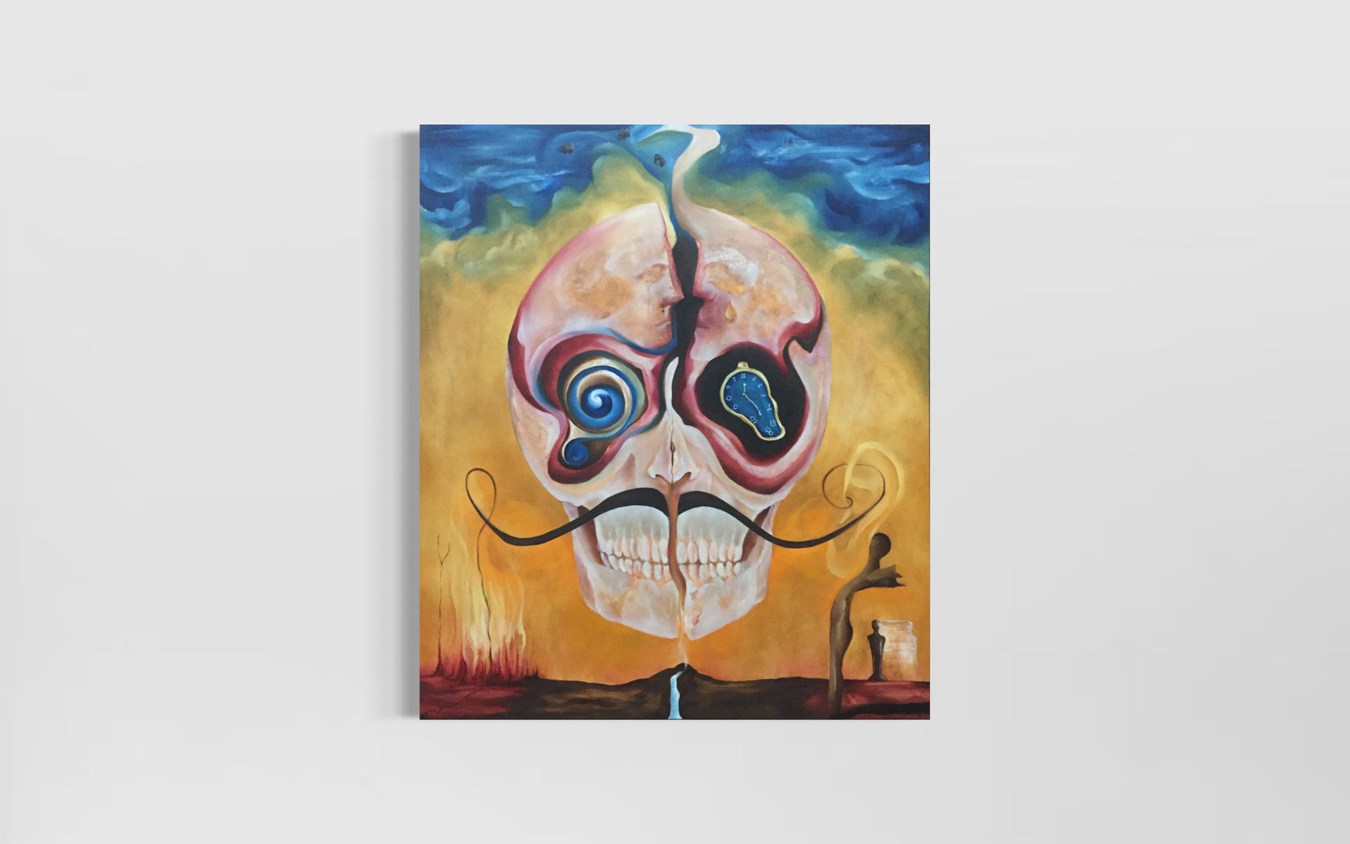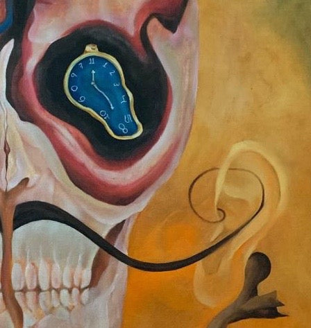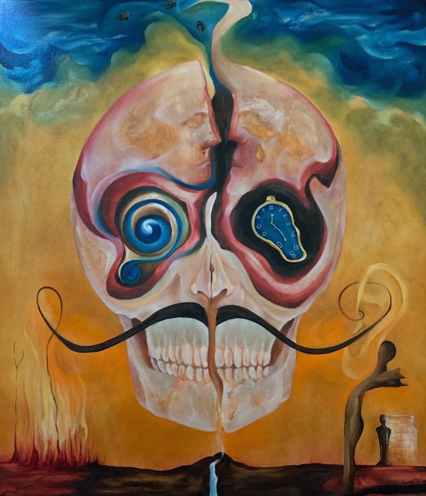 El catrín Dalí flota sobre un fondo anaranjado con sus respectivas referencias a la obra del pintor Salvador Dalí