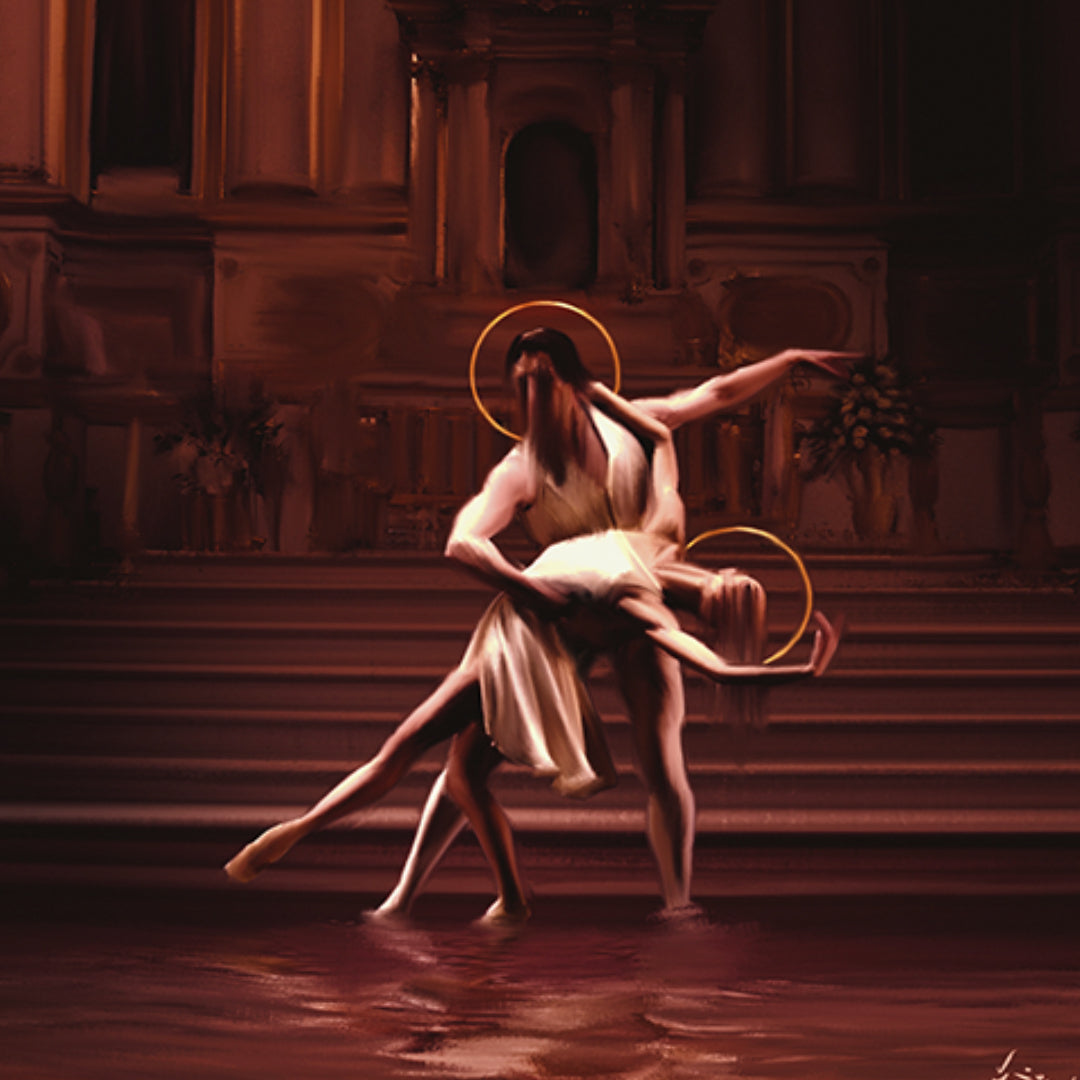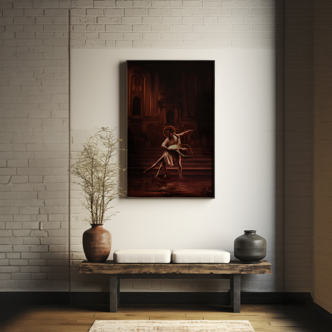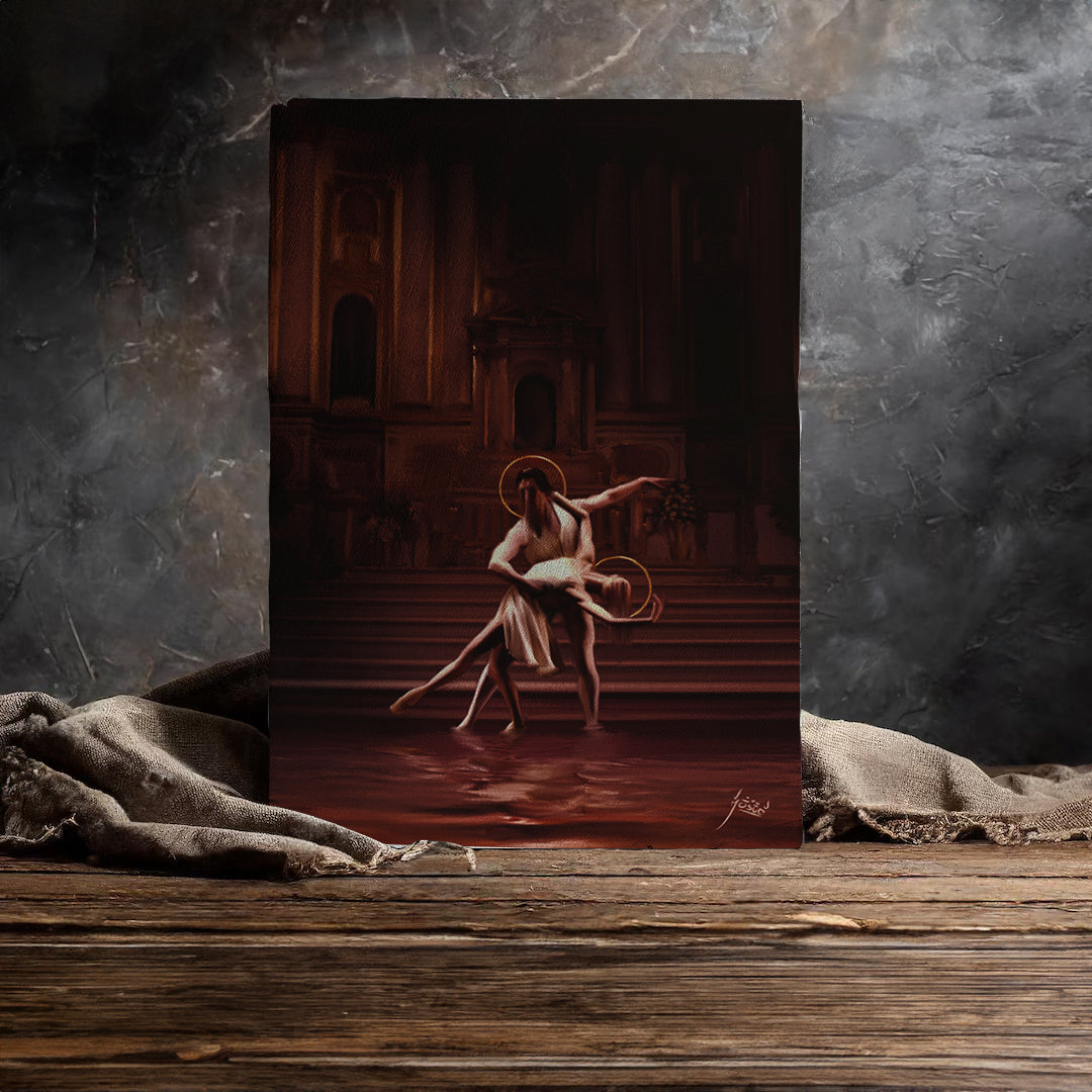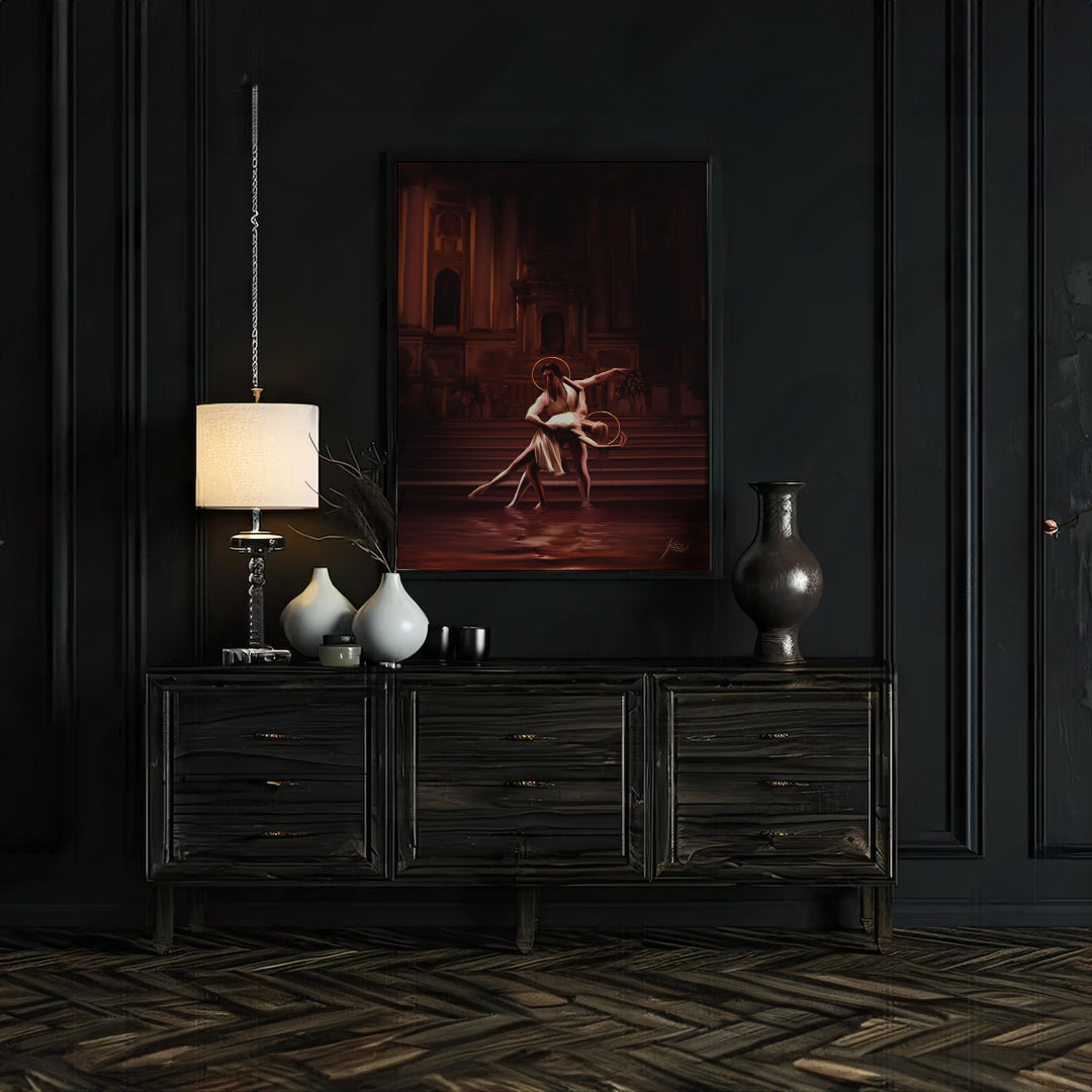 Esta obra, evocando el estilo de Rembrandt, presenta una atmósfera descarnada y oscura, cargada de dramatismo y tensión. Los protagonistas son los Reyes blancos del ajedrez, quienes se preparan para la batalla en una danza solemne y elegante. La luz cálida que los envuelve contrasta con la profunda oscuridad que domina el resto de la escena, creando un ambiente lúgubre y ceremonial.