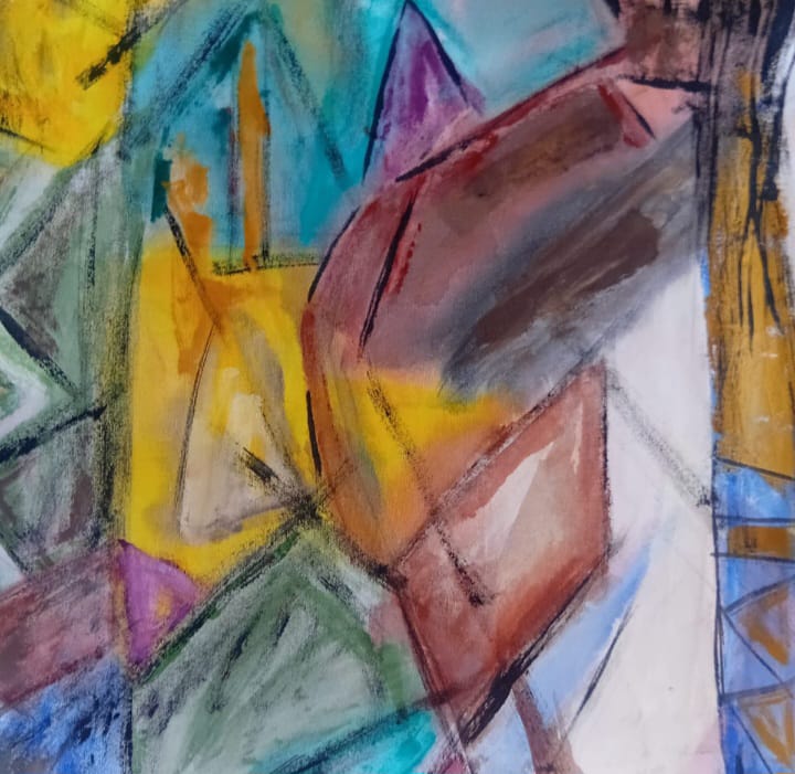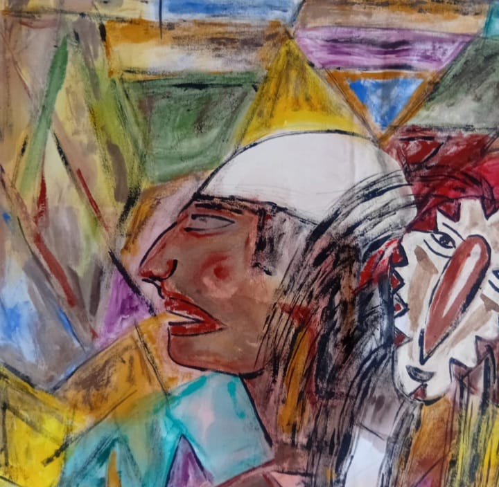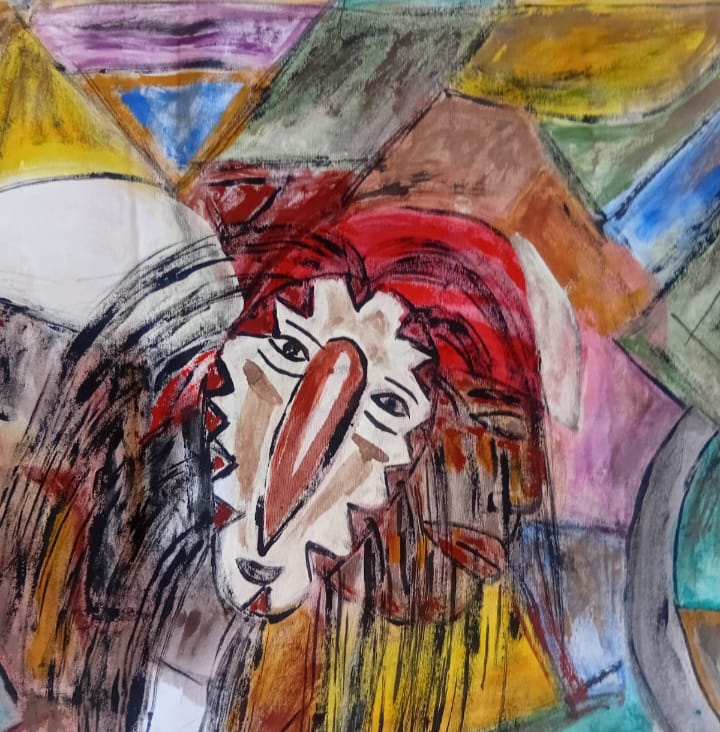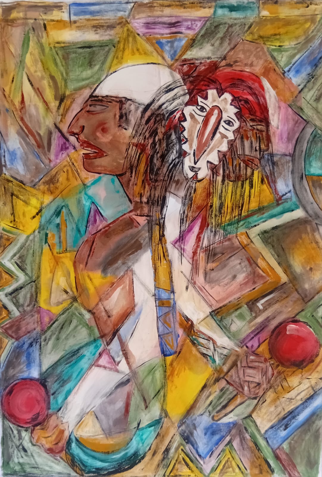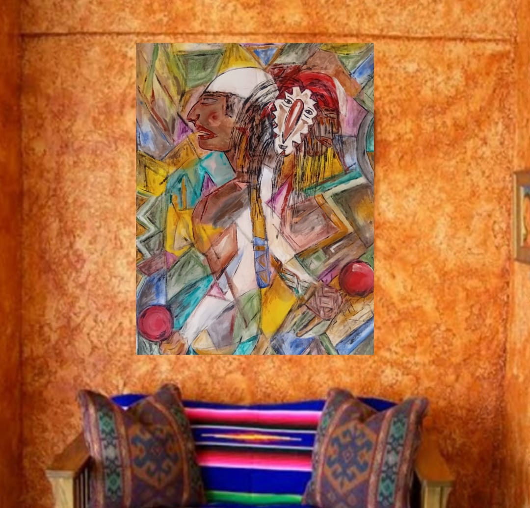La obra creada en acrilicos en diferente colorido da importancia al pascola que se coloca la mascara en un costado de la cara, el soporte poliester permite doblar la obra para trasportarla con comodidad.