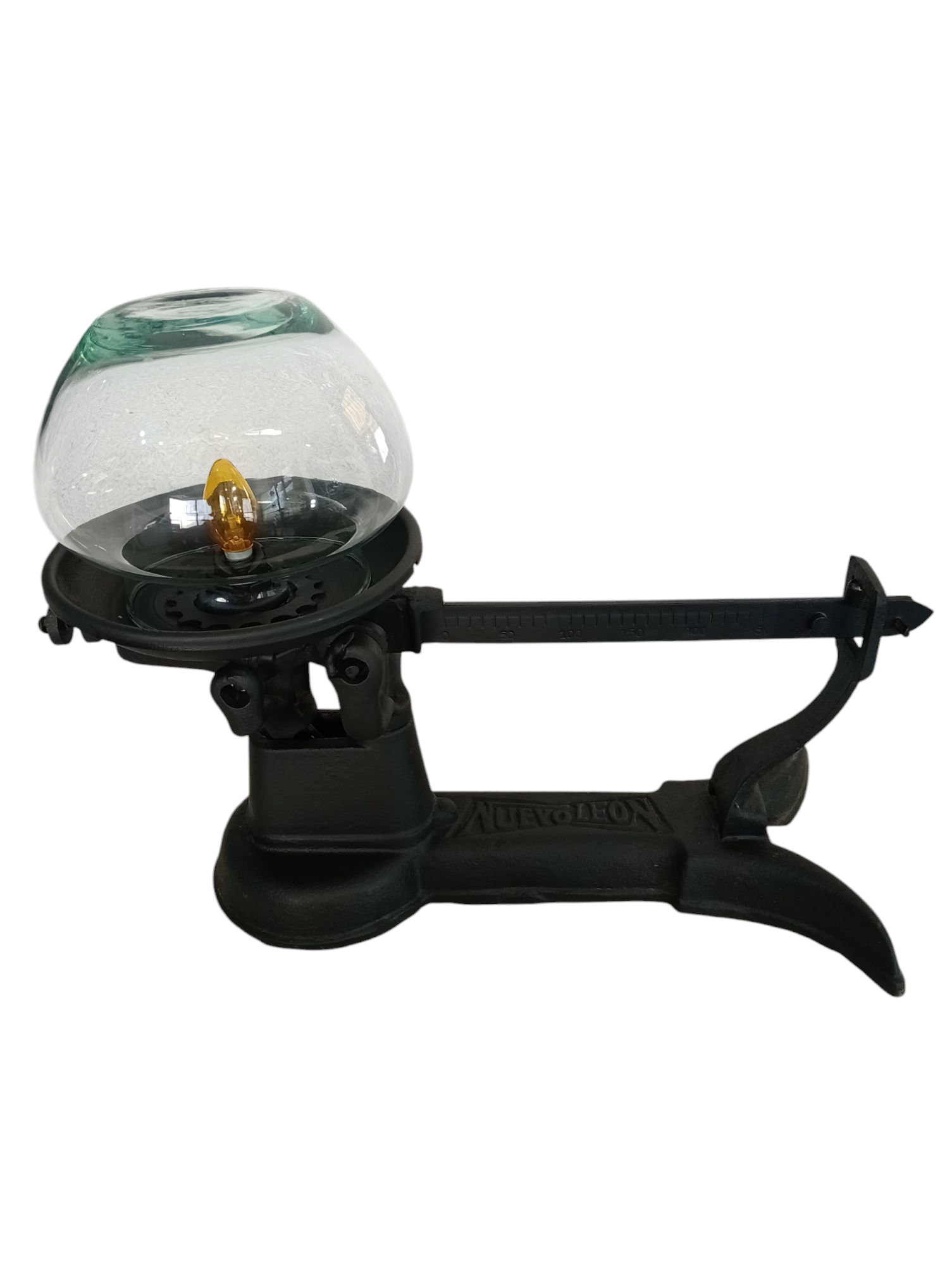 Una obra que reinterpreta el equilibrio entre función y arte. Esta lámpara fue creada a partir de una báscula mecánica de hierro fundido “Nuevo León”, símbolo del comercio tradicional mexicano, transformada en una pieza lumínica. El platillo ha sido reemplazado por una estructura metálica y una cúpula de vidrio reciclado soplado, que encierra una luz tipo vela. Una fusión de nostalgia, oficio y sustentabilidad que convierte el peso del pasado en una luz viva del presente.