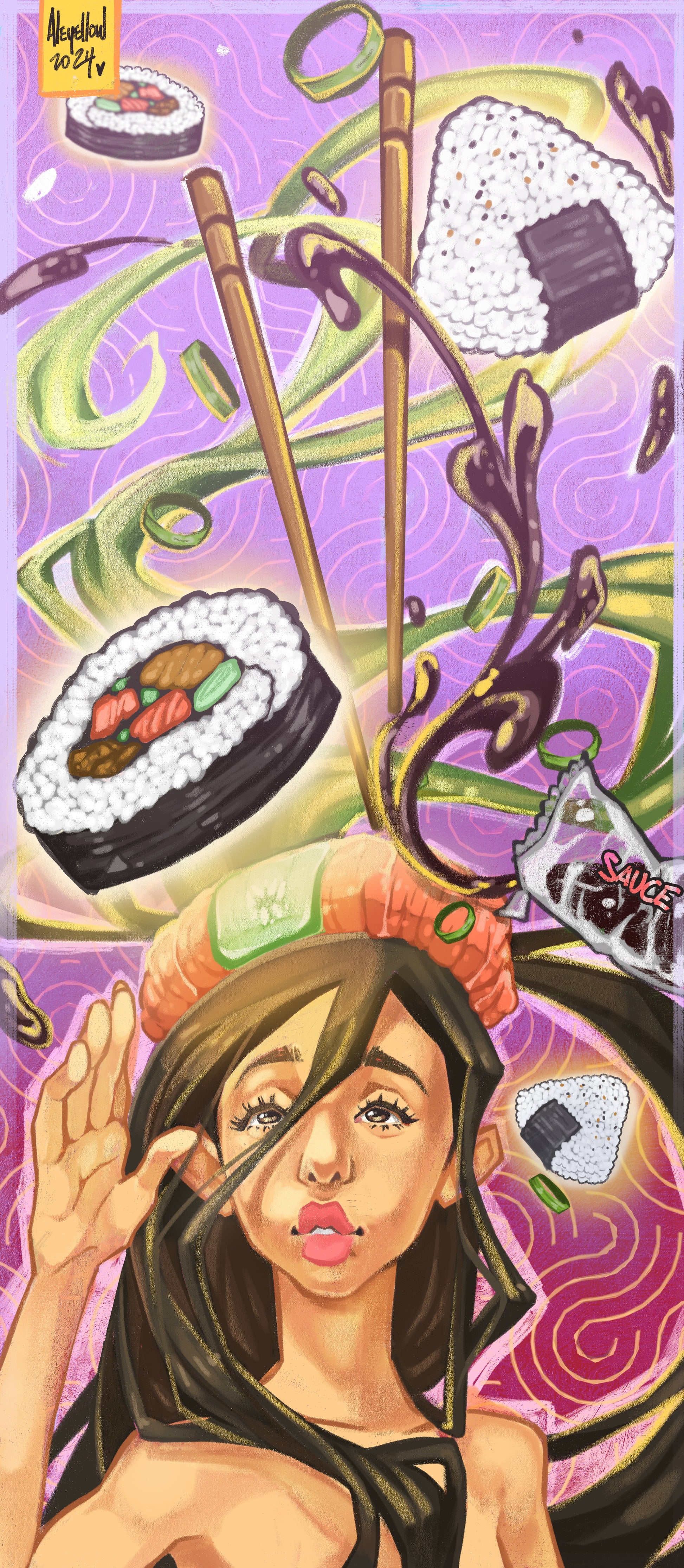 Sushi Girl es una ilustración que fue inspirada en la gastronomía japonesa, ya que me encanta mucho el sushi y me apasiona retratar chicas por lo que la mezcla de ambas hizo surgir este diseño de personaje