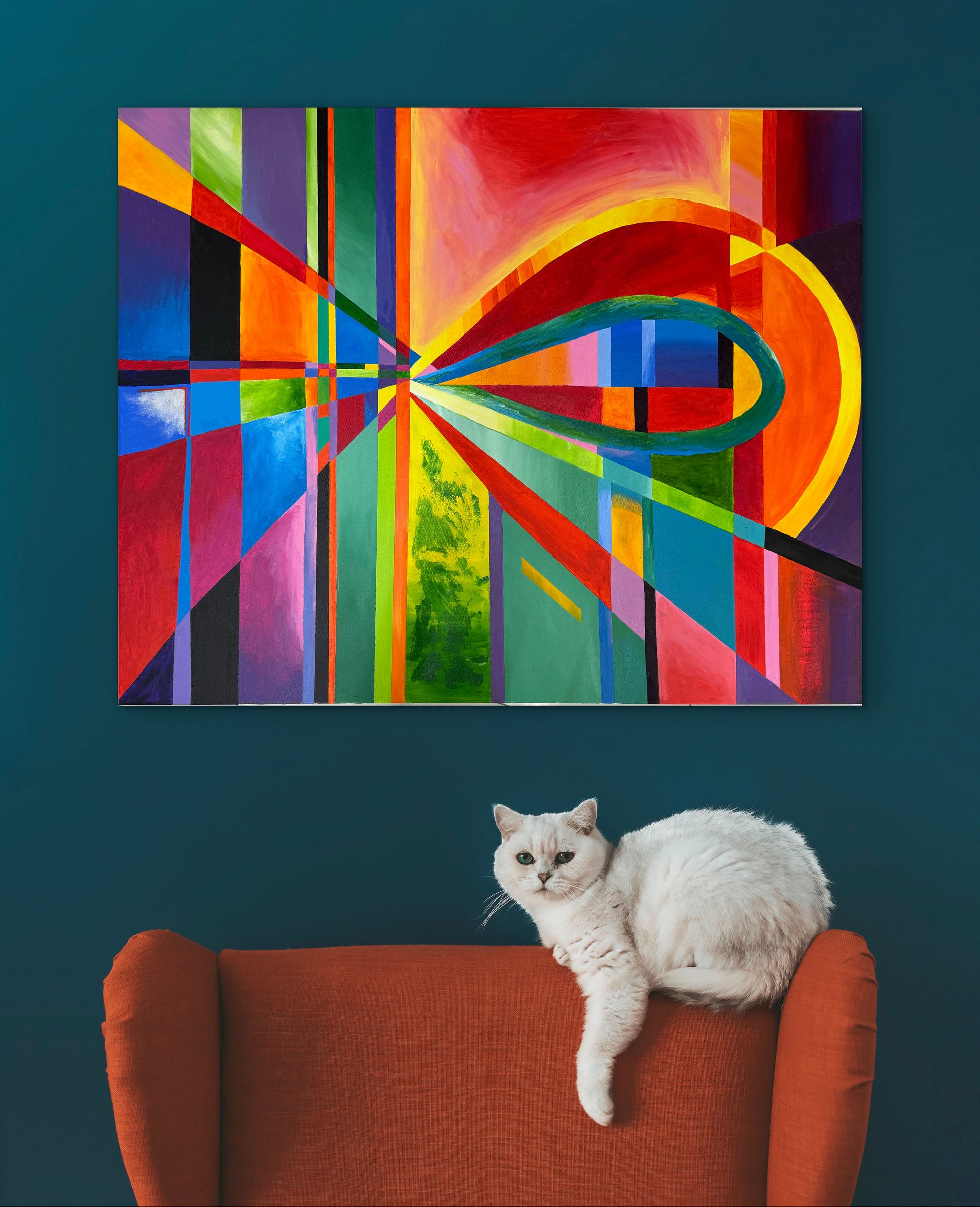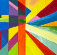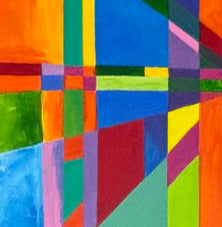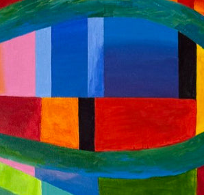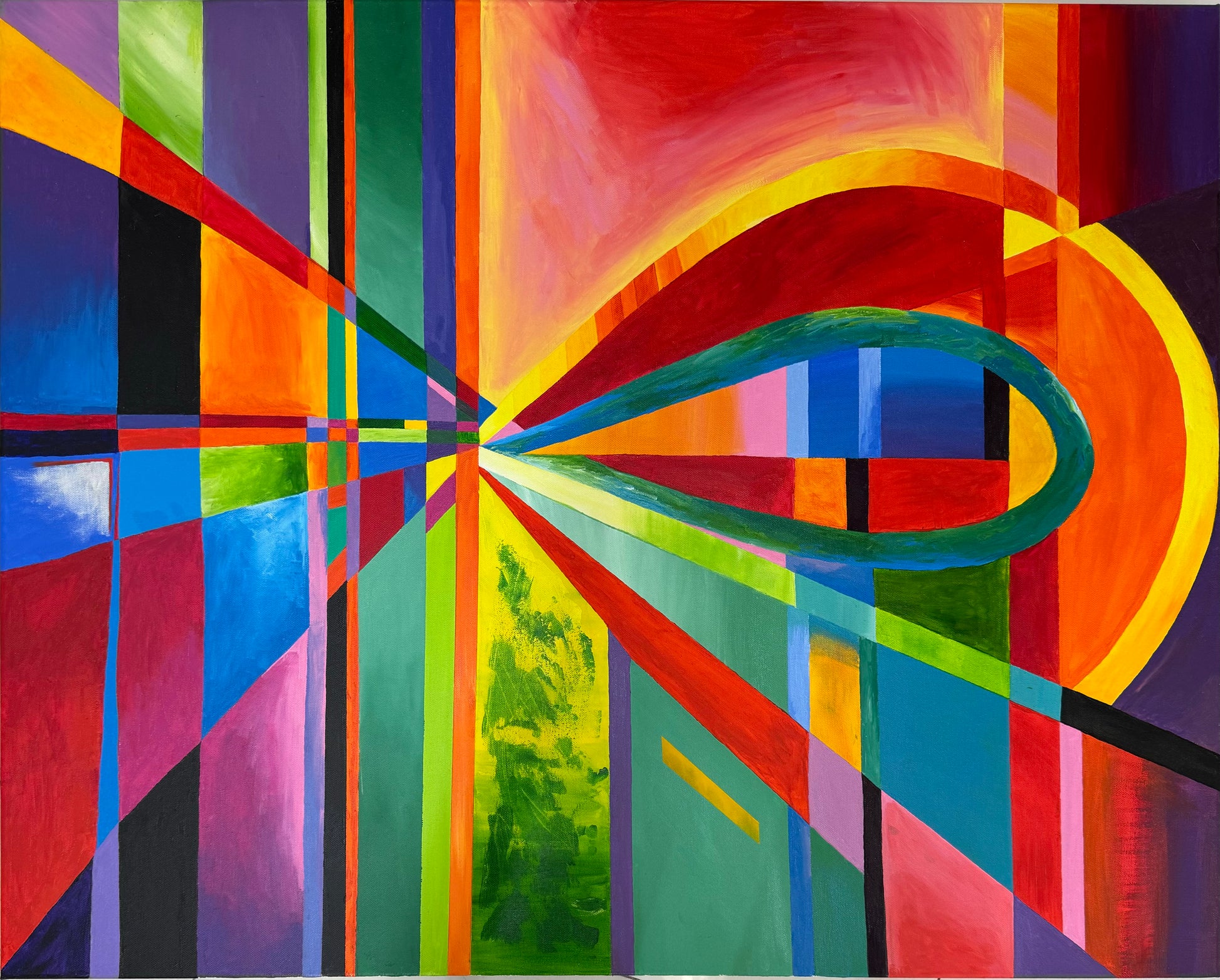 Obra moderna con uso de la geometría que conduce la mirada hacia el centro de la obra. Sus colores contrastantes realzan las diferentes posiblidades de observar esta obra, ya sea en forma lineal o a través de curvas. Juego interesante de perspectiva.