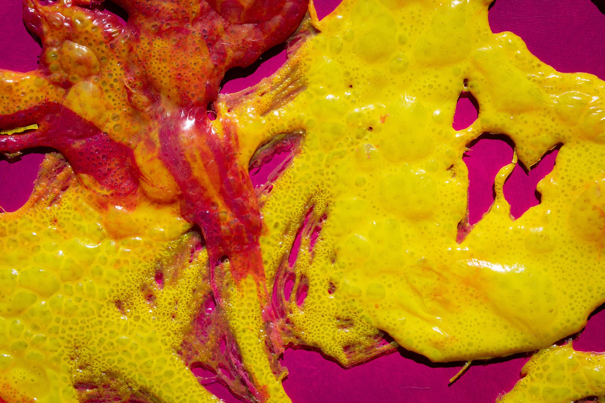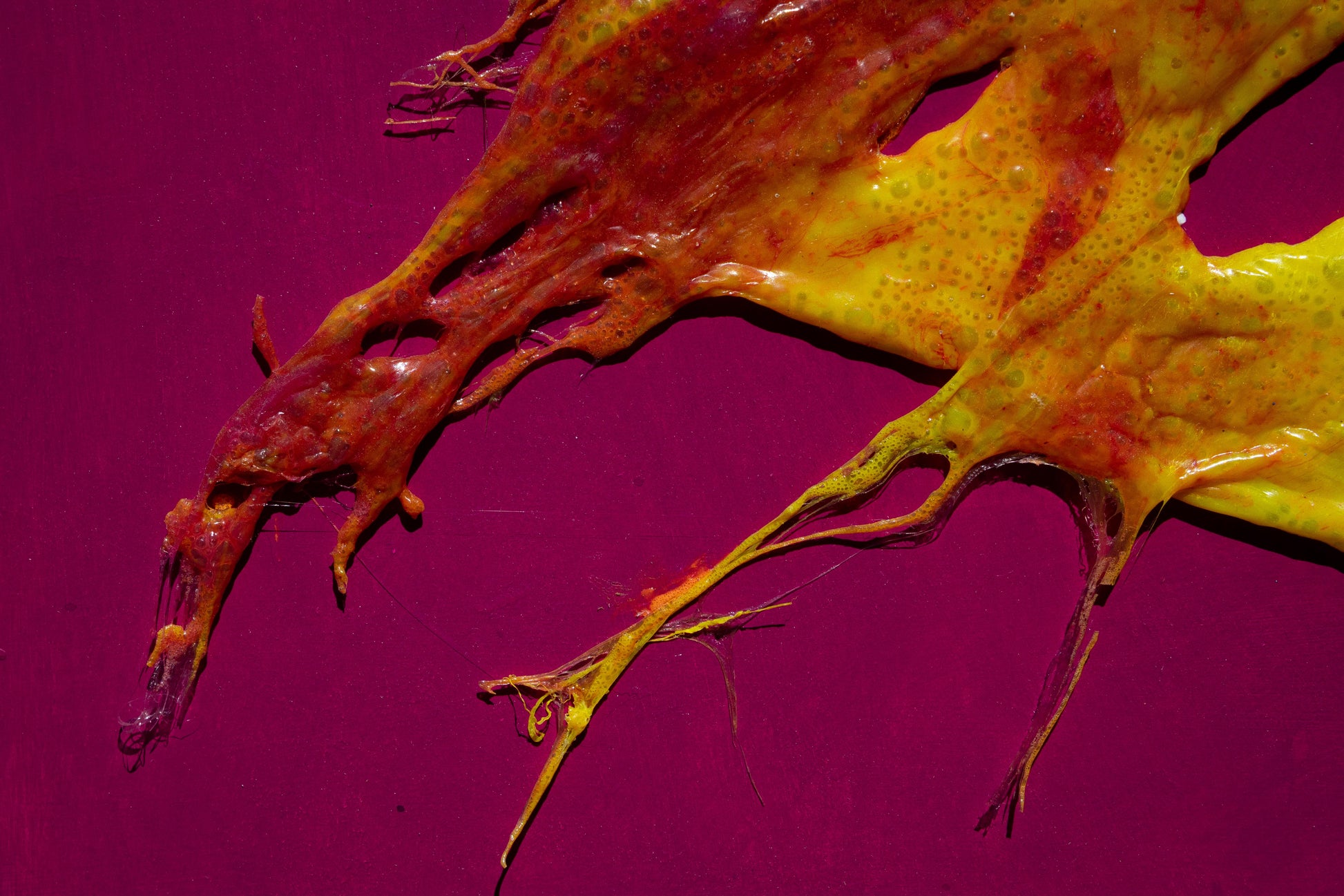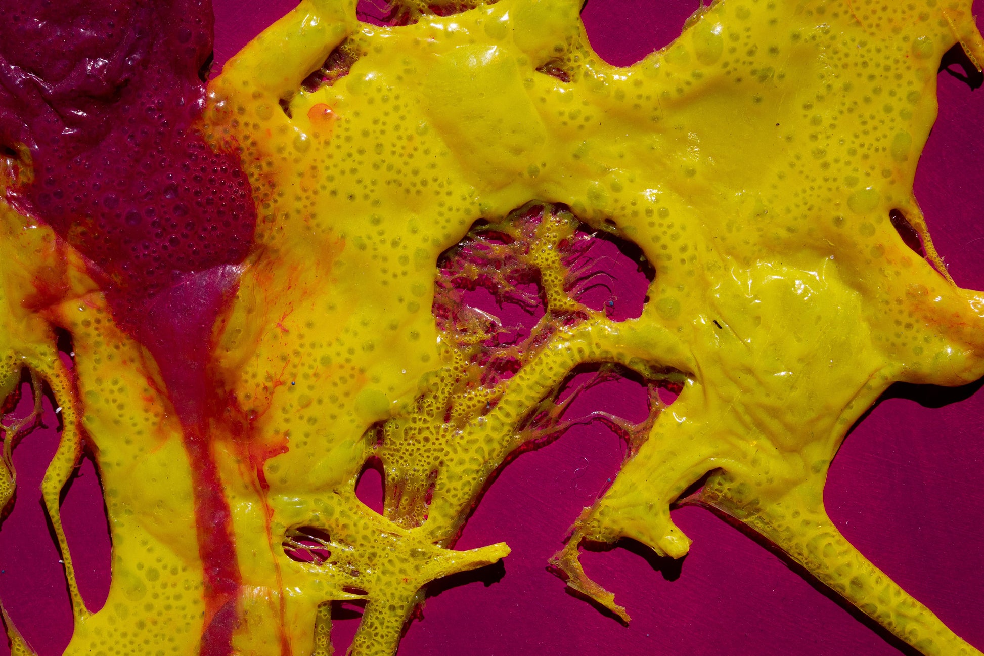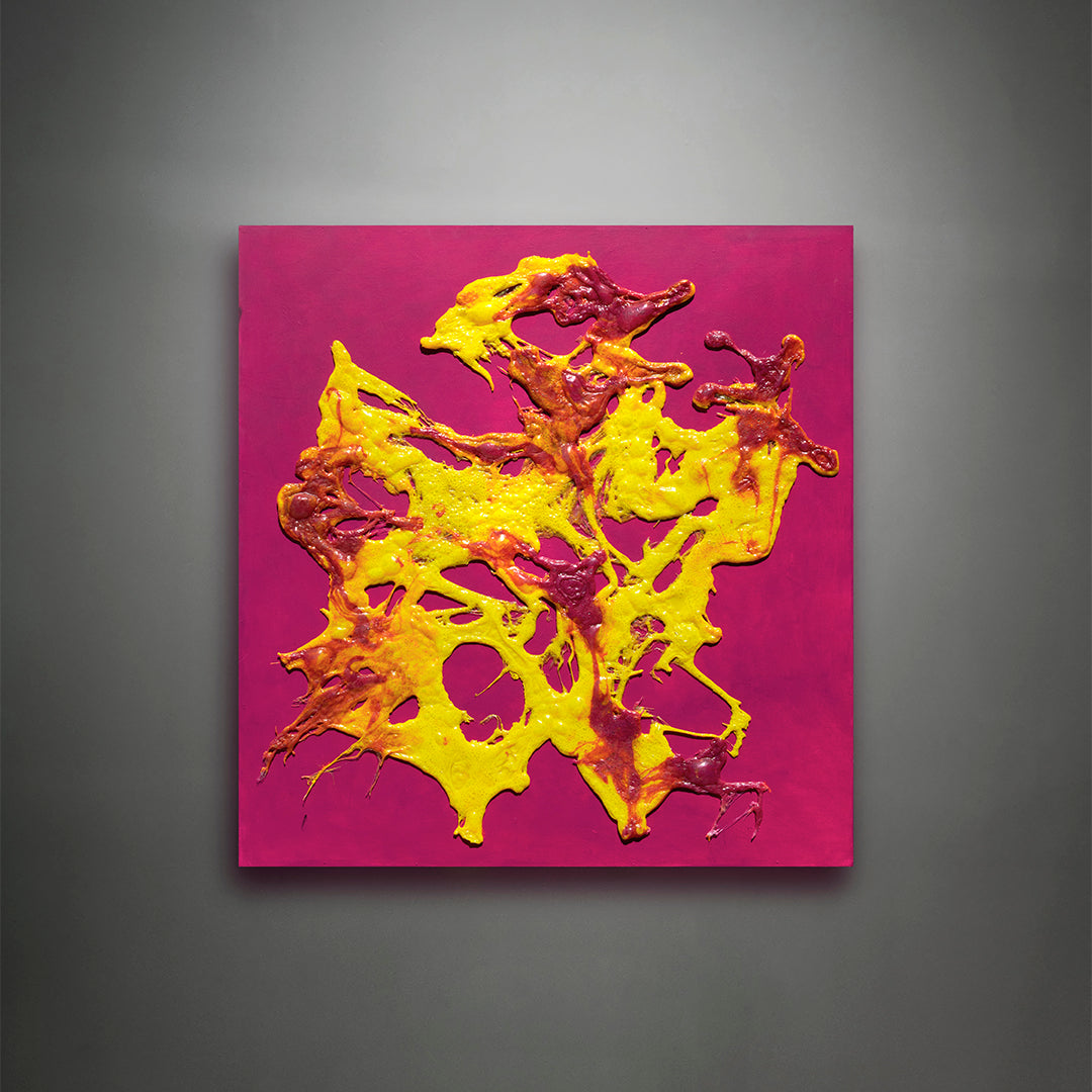 "Mancha 1" fue la primera pieza que hice en 2023 con esta técnica de derretir el unicel (poliestireno). Para esto usé el amarillo para cubrir en su mayoría la extensión del plástico y un poco de magenta para crear acentos en la figura y que al mismo tiempo se fundiera con el fondo, que también es magenta.