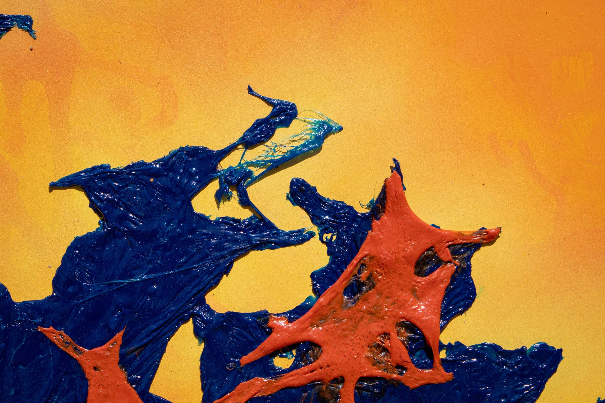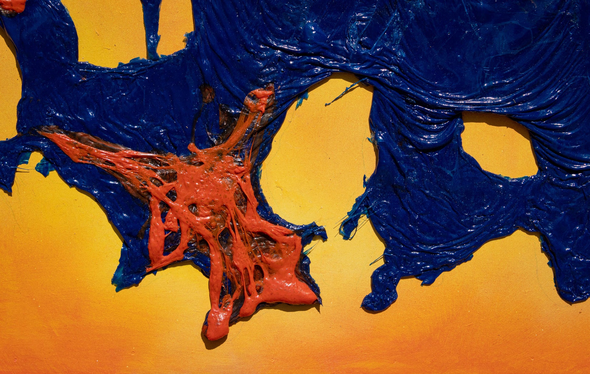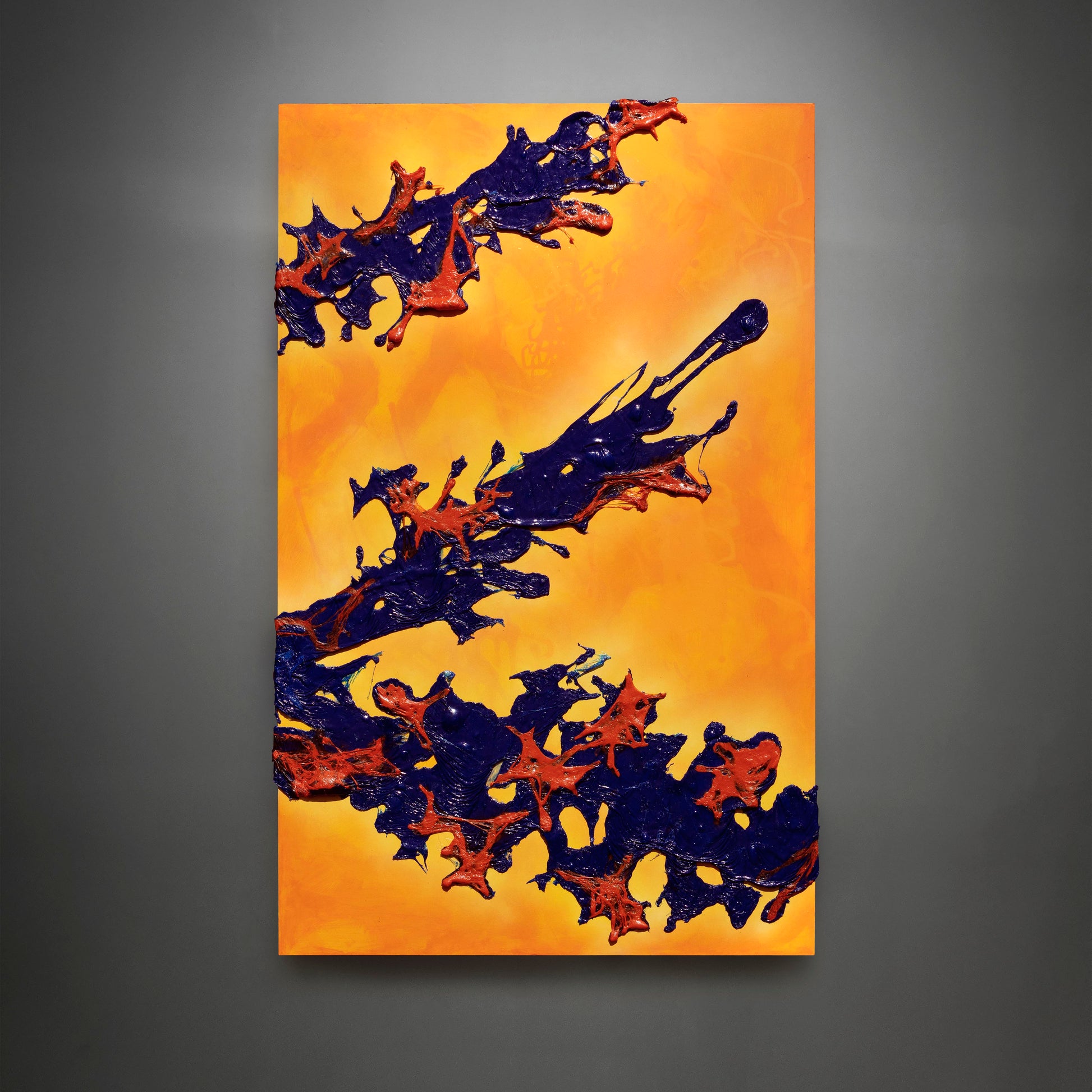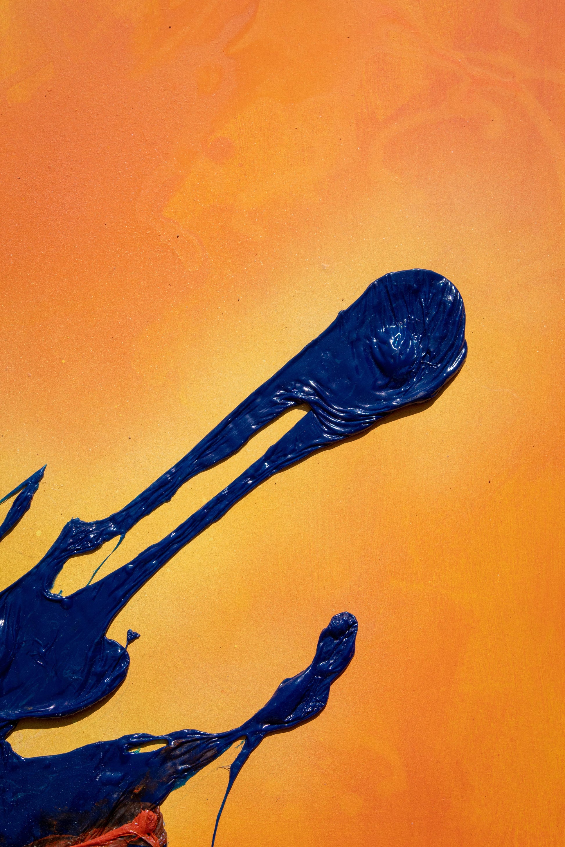 "Mancha 3" es la tercera pieza de esta serie en proceso. En esta obra también quería jugar con diferentes formas para el fondo y agregar una suave iluminación que rodeara a la mancha azul. La textura que me dio esta mancha es diferente a las anteriores, ya que el plástico está totalmente pigmentado y por ello no permitió la transparencia ni las pequeñas burbujitas que se forman dentro, además, antes de que secara la incliné un poco para que en el plástico se formaran pequeñas ondas y diera una sensación de que se está escurriendo la mancha.