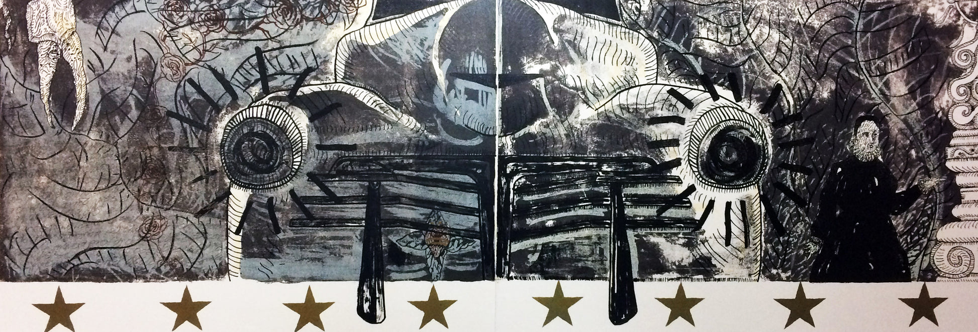 Díptico de 1990, litografía y serigrafía que representa el poder que se deposita en objetos y símbolos un poder oculto místico, en iconografías que se empolvan con el tiempo y se vuelven mágicas