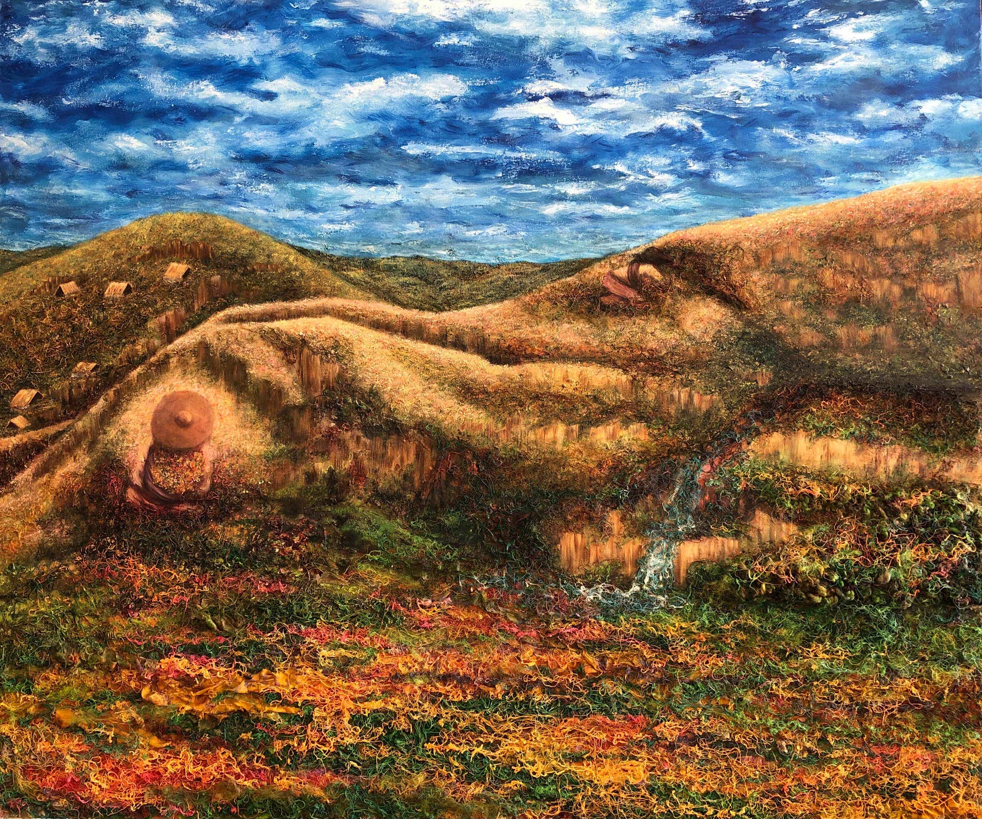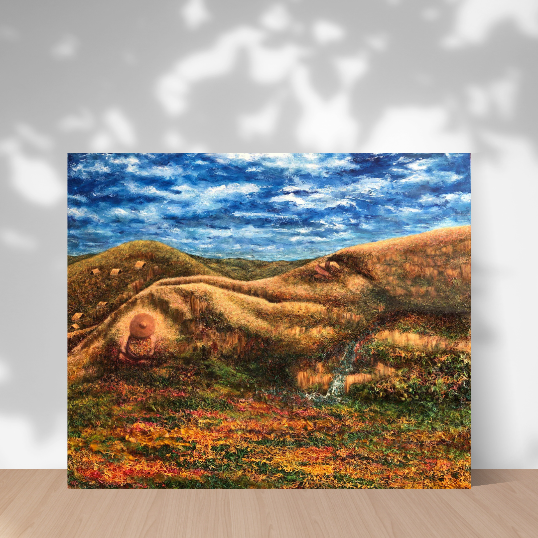 El uso de materiales y texturas crea un efecto orgánico, como si los elementos de la pintura estuvieran en constante transformación. Asi mismo, la agua que serpentea entre las colinas actúa como un hilo conductor, un símbolo de flujo, fertilidad y renovación.