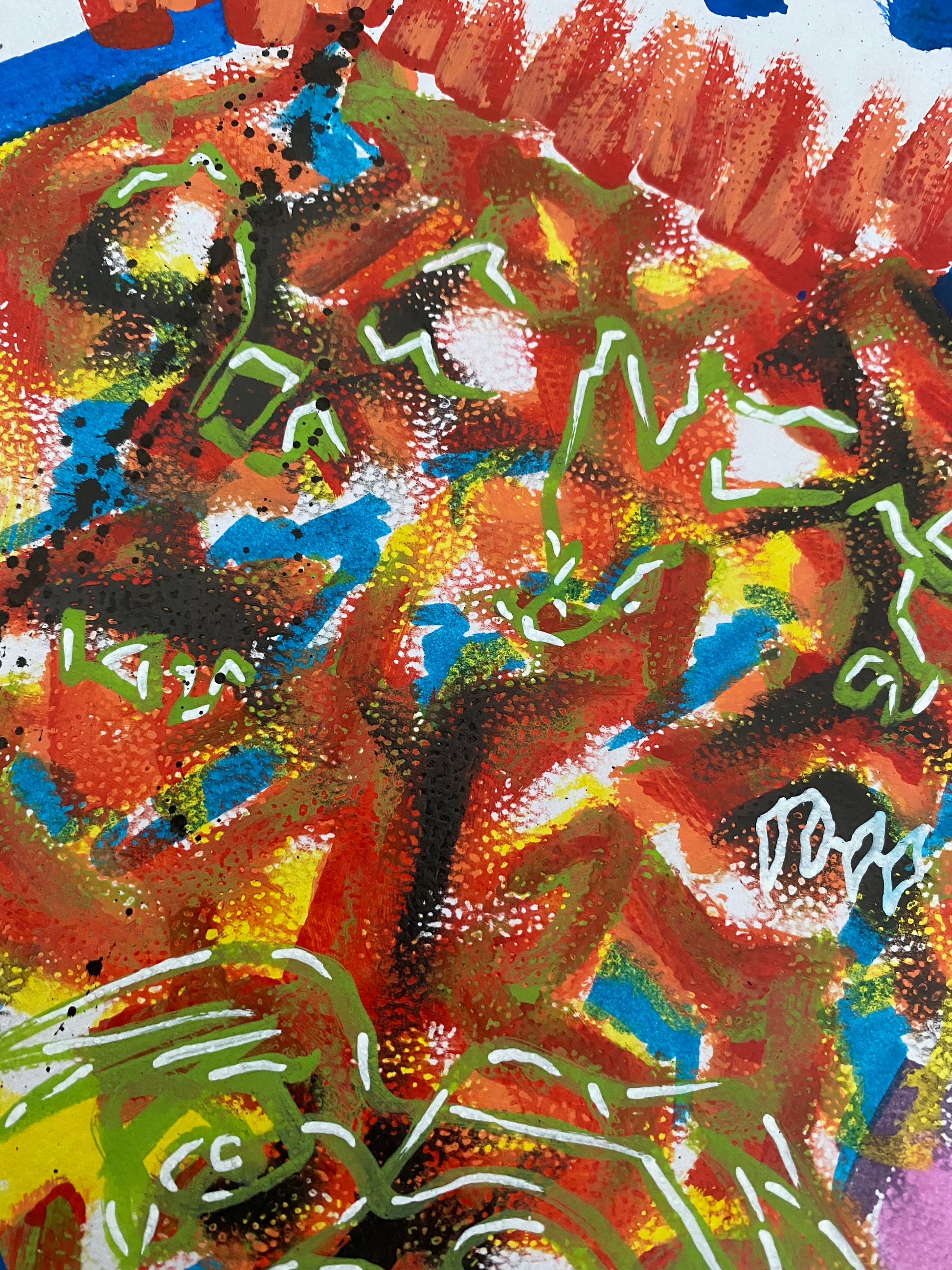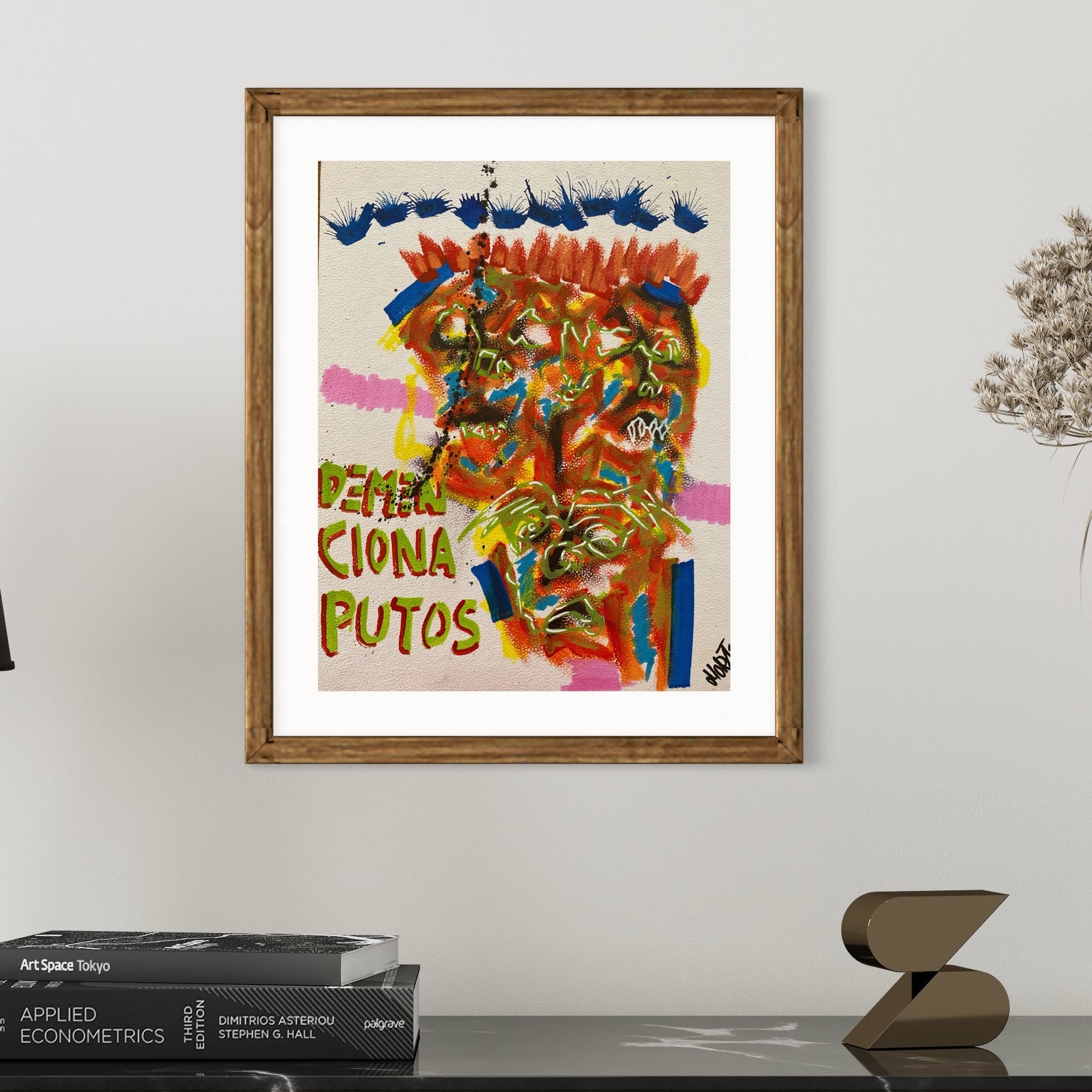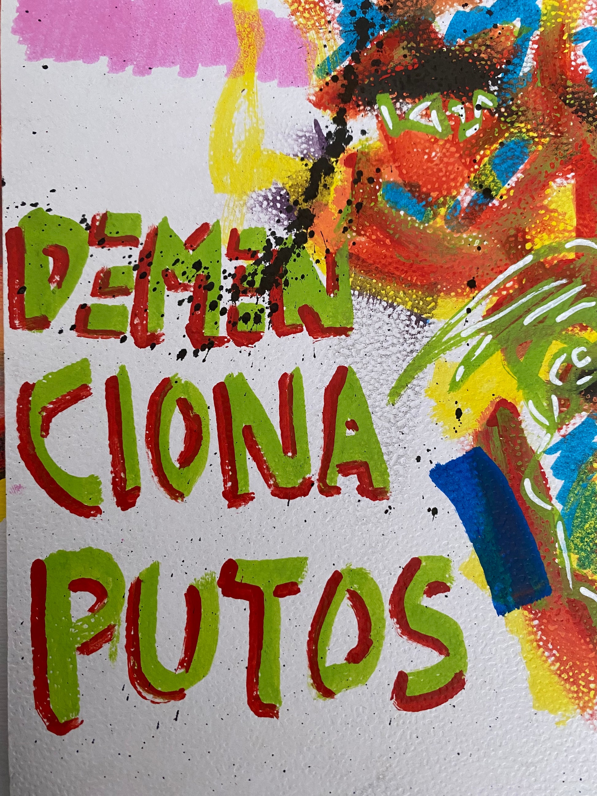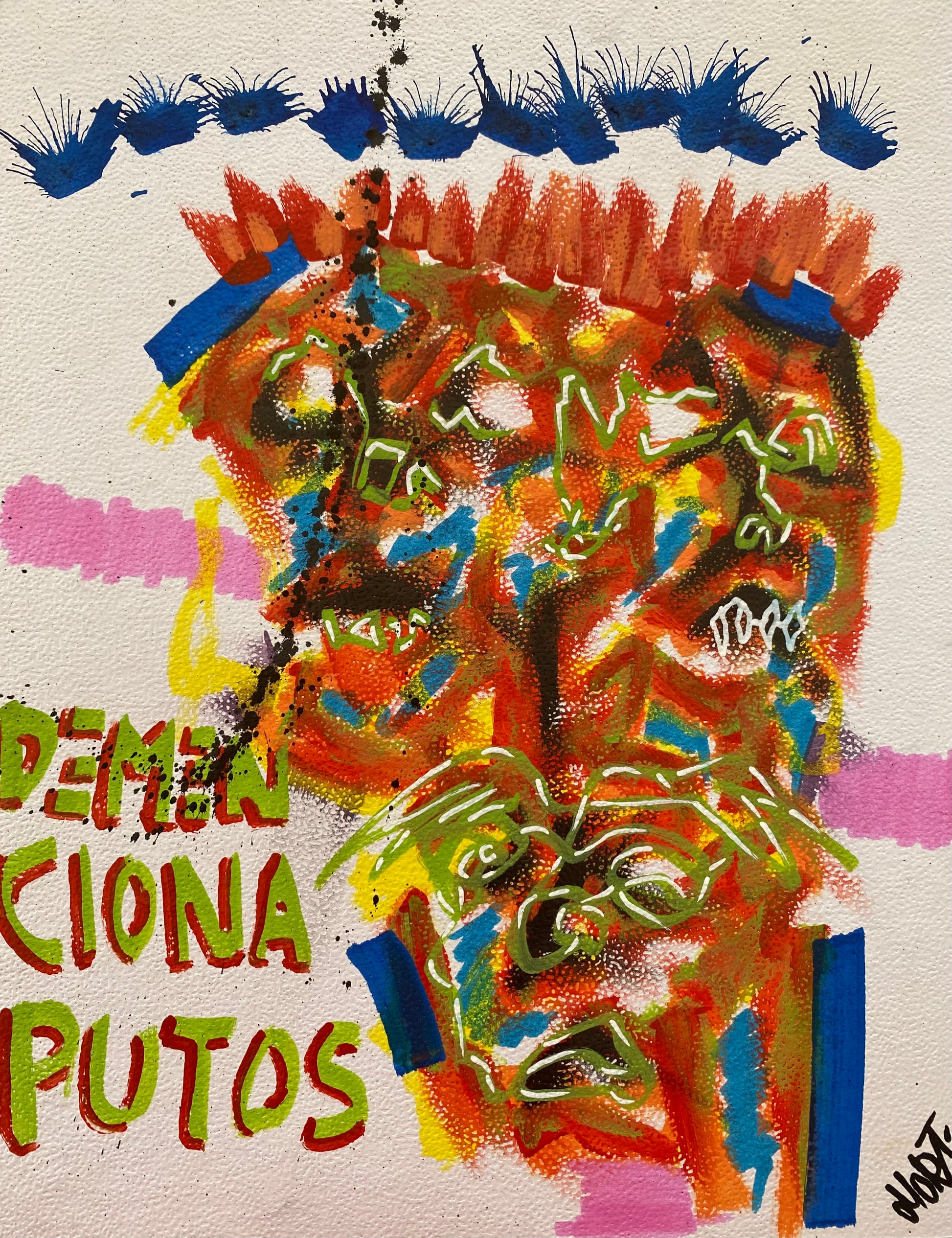 Es una pintura cruda y visceral que explora la desesperación y el agotamiento de un individuo privado de descanso y alivio en un ambiente psiquiátrico. A través de colores primarios intensos y una figura distorsionada, la obra refleja la tensión interna y la frustración de una mente en busca de calma. La obra es un testimonio de la resistencia humana ante el conflicto entre lo que el sistema prescribe y lo que el individuo percibe como alivio.