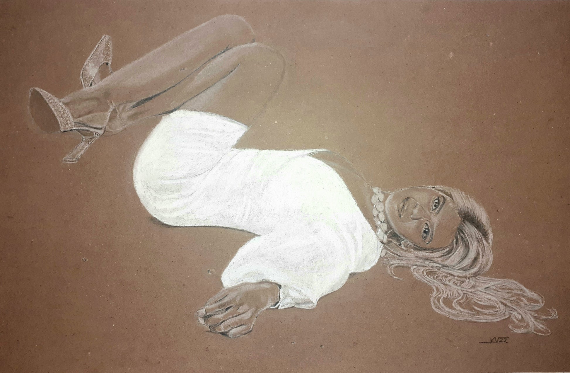 Dibujo de modelo en grafito y carboncillo sobre papel craft.