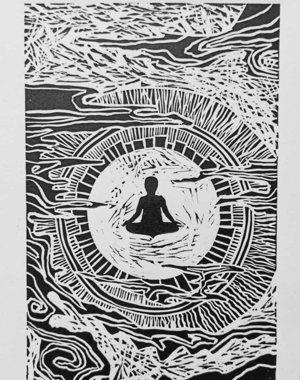 Esta obra representa la desconexión que tenemos que hacer del mundo en ciertas ocasiones para poder volver a conectar con nuestro propio fuego interno, con todo lo que somos, con nuestro mas profundo ser; siempre volviendo a nuestra naturaleza de raíz.