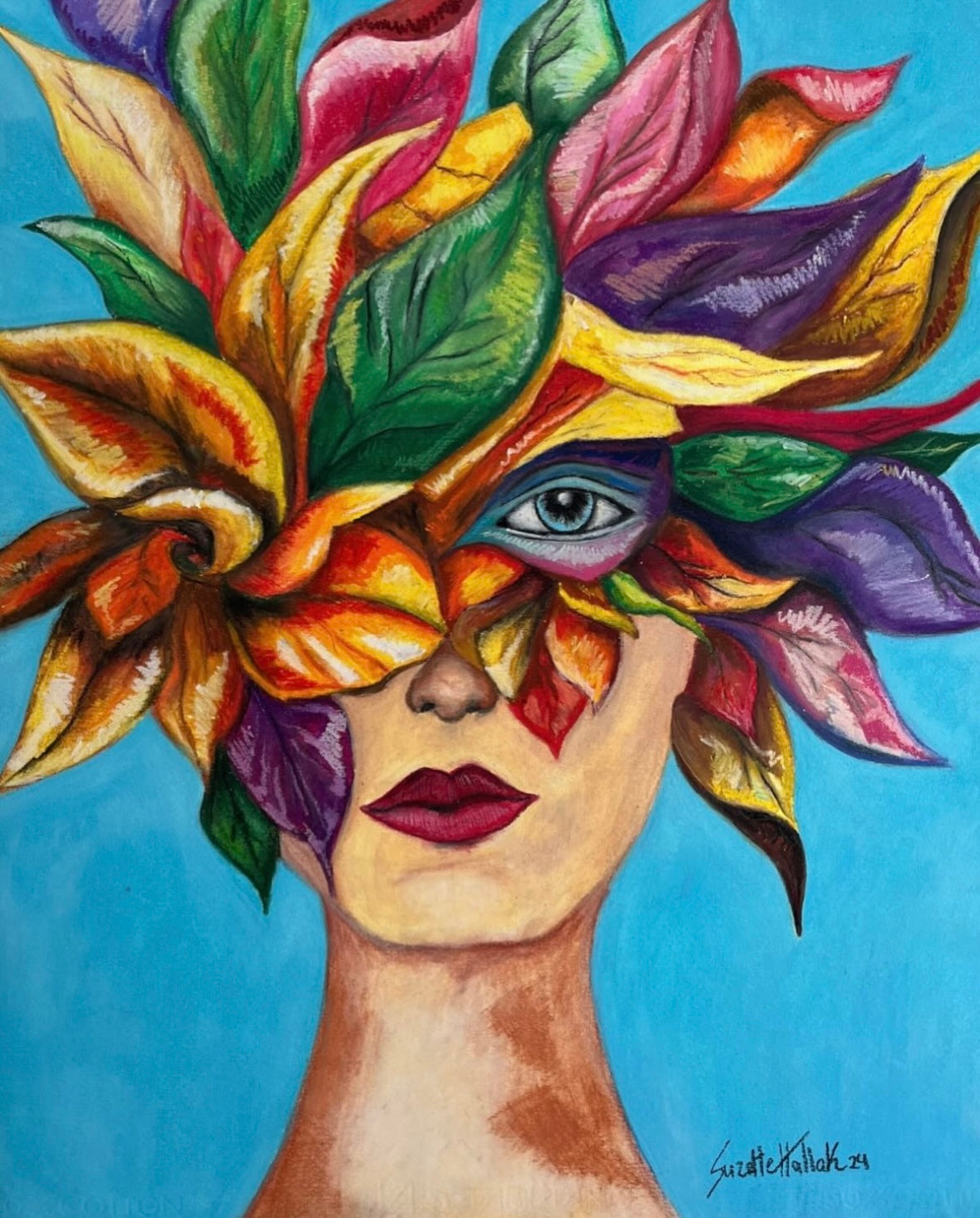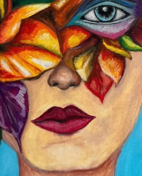 Obra que representa el florecimiento interior. Entre hojas y colores surge el rostro del deseo: una mirada que germina, se expande y se atreve a renacer. Los pétalos simbolizan pensamientos que florecen desde la emoción, mientras la intensidad cromática evoca vitalidad, transformación y belleza consciente.