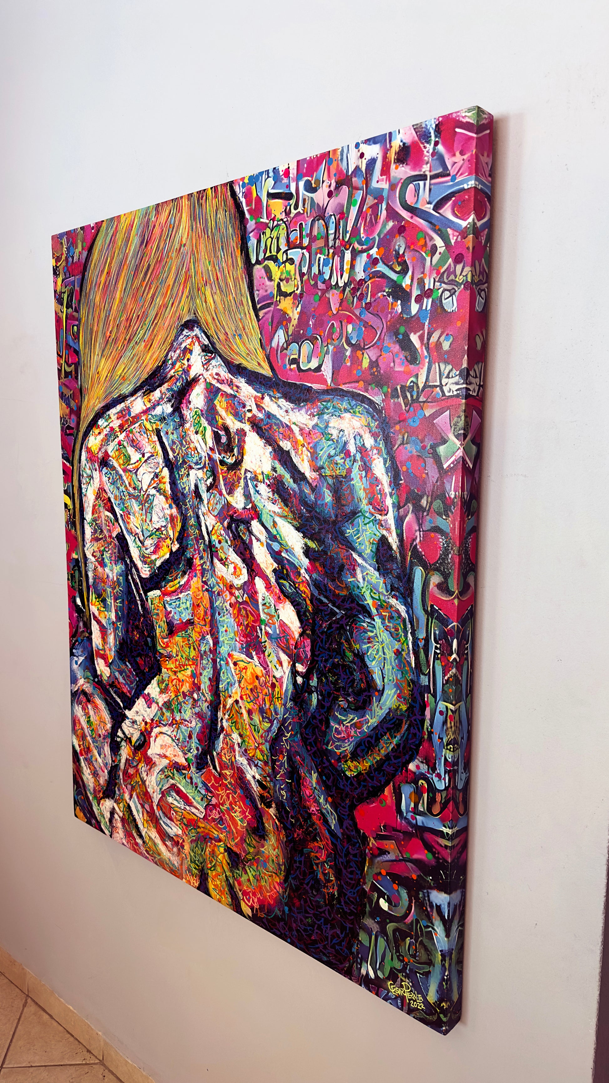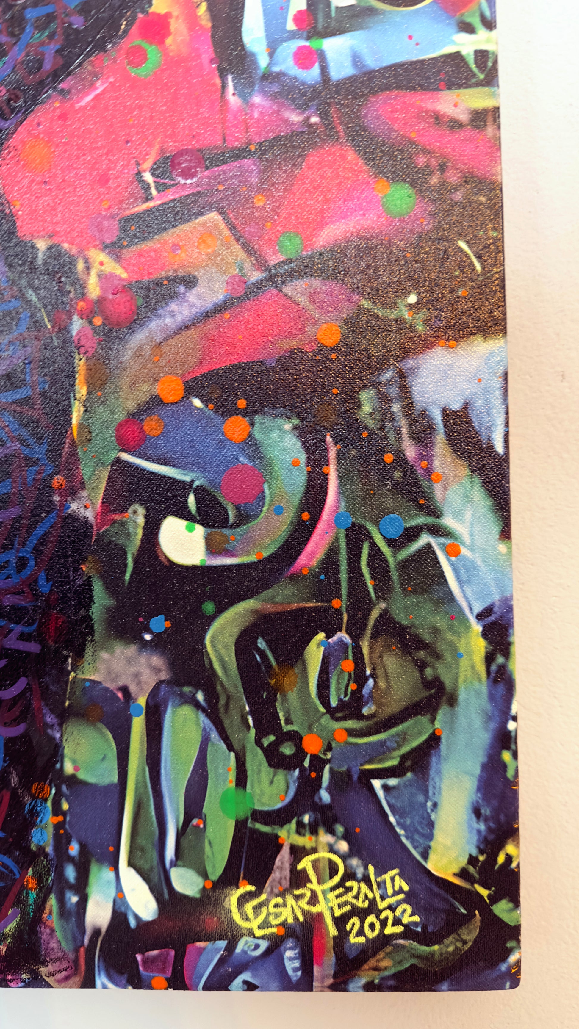 Esta obra es parte de mis trabajos de arte híbrido, una fusión de arte digital con arte tradicional, en este caso pintura. Estas obras llevan tres procesos: primero, una ilustración digital realizada en medios electrónicos como tableta y computadora. Luego se imprime, y utilizo diferentes materiales, desde lienzo hasta metal; en este caso, es lienzo. Ya impresa y montada sobre un bastidor de madera, la llevo a mi taller donde la intervengo con pintura acrílica, añadiendo detalles, luces, sombras, texturas, etc. Al terminar este proceso, regreso a mi computadora y realizo una animación digital de la obra, la cual podrá ser vista a traves de tu telefono o tableta.