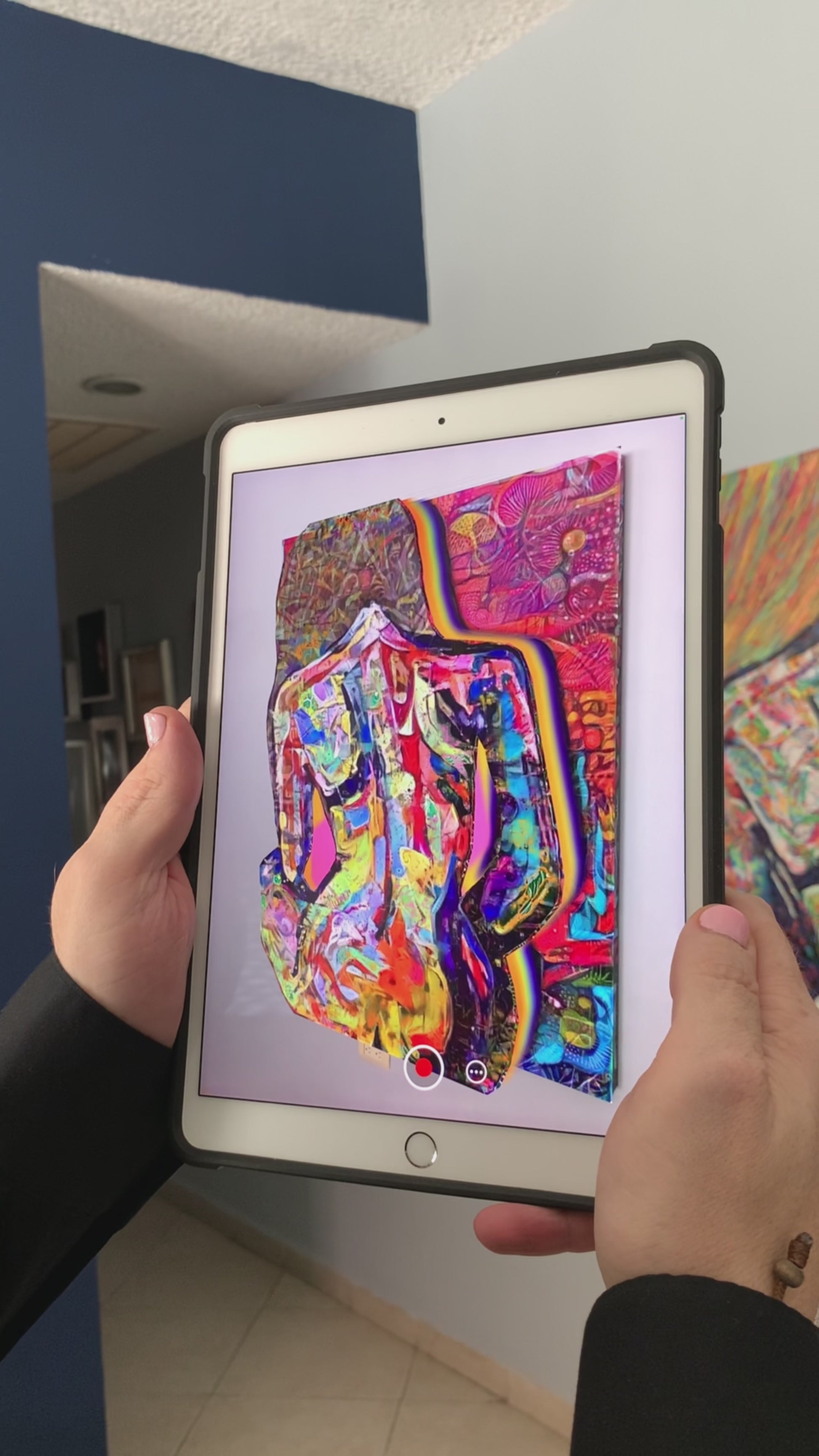 Ilustración digital impresa sobre lienzo, intervenida con pintura acrílica y realidad aumentada 3D
