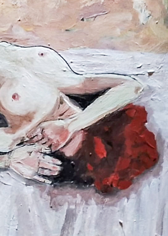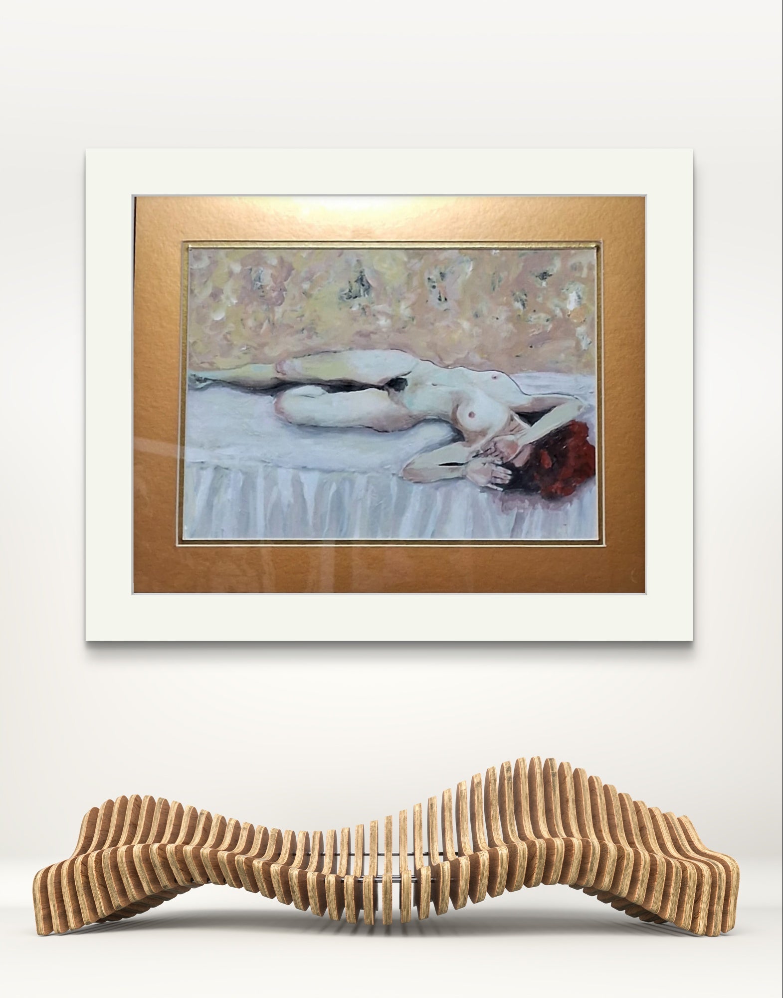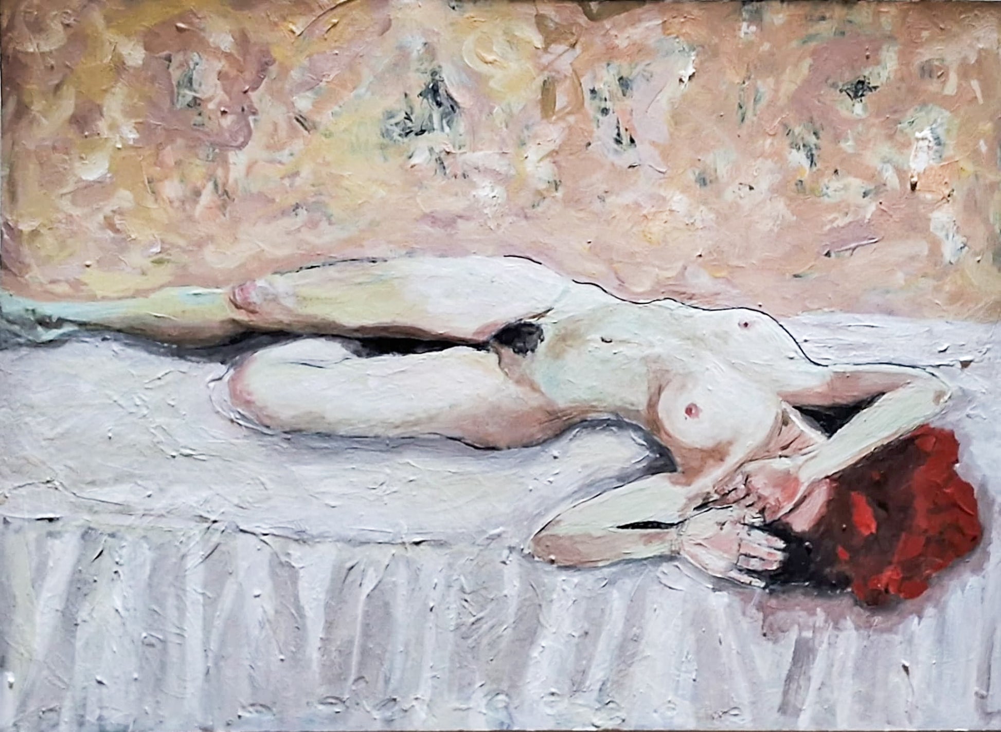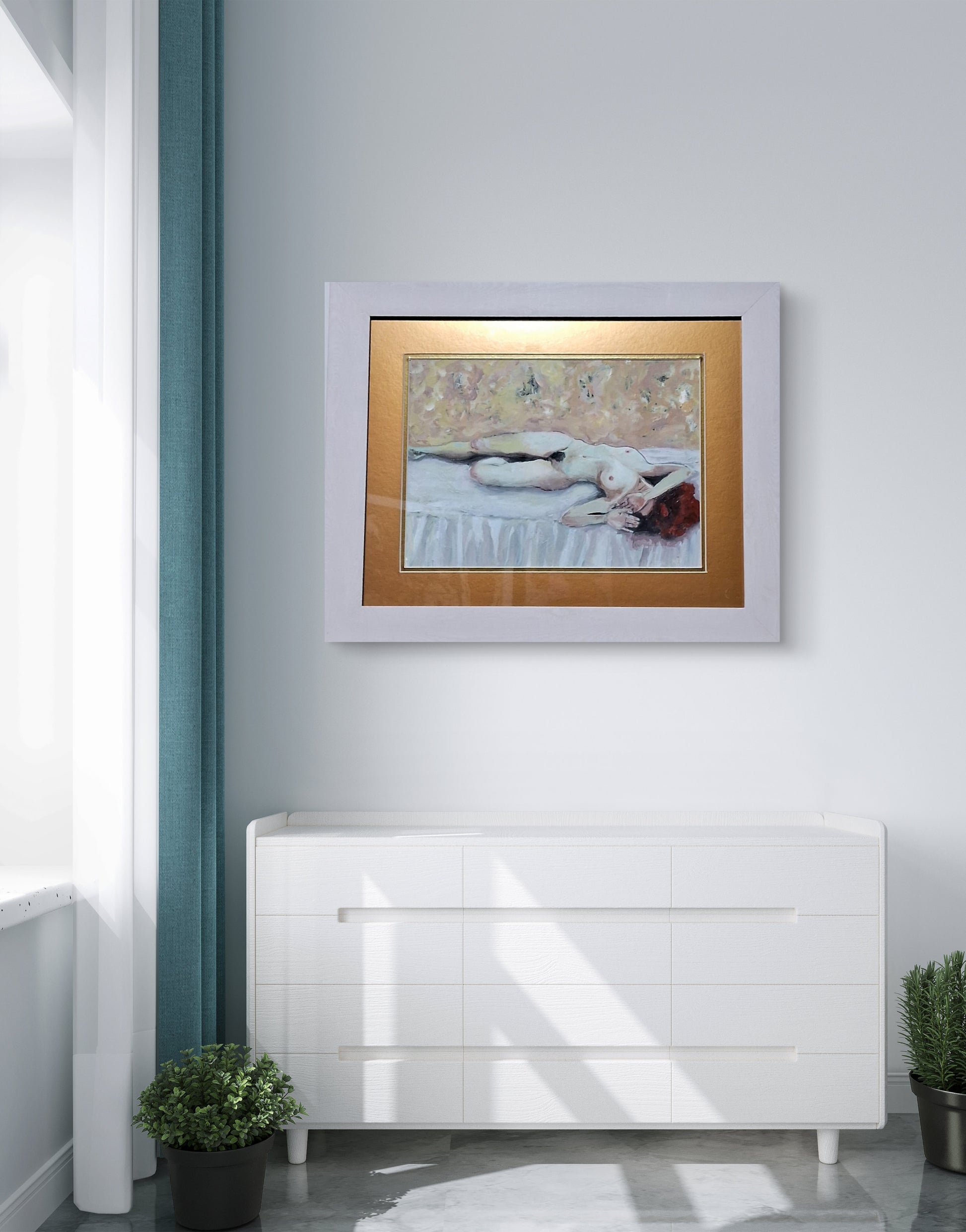 La obra presenta a una mujer desnuda en una posición de sueño o reposo. El fondo de la imagen tiene una textura difusa con tonos cálidos, principalmente marrones suaves. La mujer tiene el cabello rojizo y está parcialmente cubriendo su rostro con el brazo, lo que añade un aire de misterio e intimidad. El cuerpo parece suavemente iluminado, resaltando su piel clara y las sombras en los contornos de su figura.