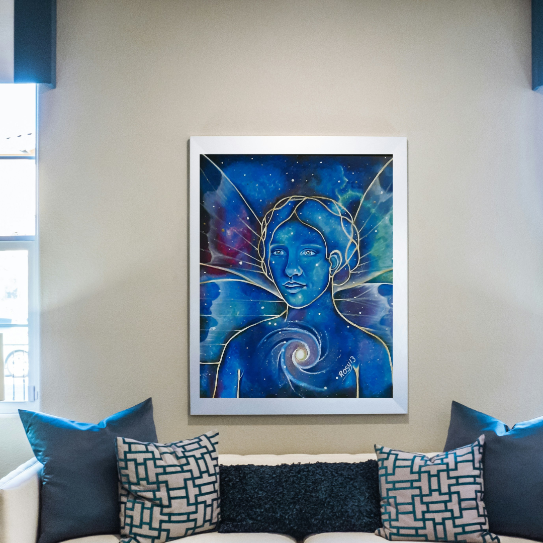 Despertar es mi primera pintura al óleo sobre tela trabajada en transparencias azules cuya temática habla del conocimiento y la unión del ser con el cosmos. Es el busto de una mujer de fisonomía fuerte, serena y segura. Su frente prominente refleja sapiencia. Sus ojos grandes y su mirada profunda transmiten grandeza. Su nariz prominente inhala y exhala fuerza vital. Sus labios carnosos proyectan poder y control. Su cabellera abundante va trenzada alrededor de su cabeza. Es el retrato de la mujer de aquí y de allá; la mujer de hoy y de siempre. Lleva unas alas de mariposa en la espalda que transparentan el espacio y algunas nebulosas en azul turquesa y color magenta. En su garganta se encuentra la vía láctea con un centro luminoso rodeado de un tono violeta. El movimiento de la galaxia va en el sentido de las horas del reloj.