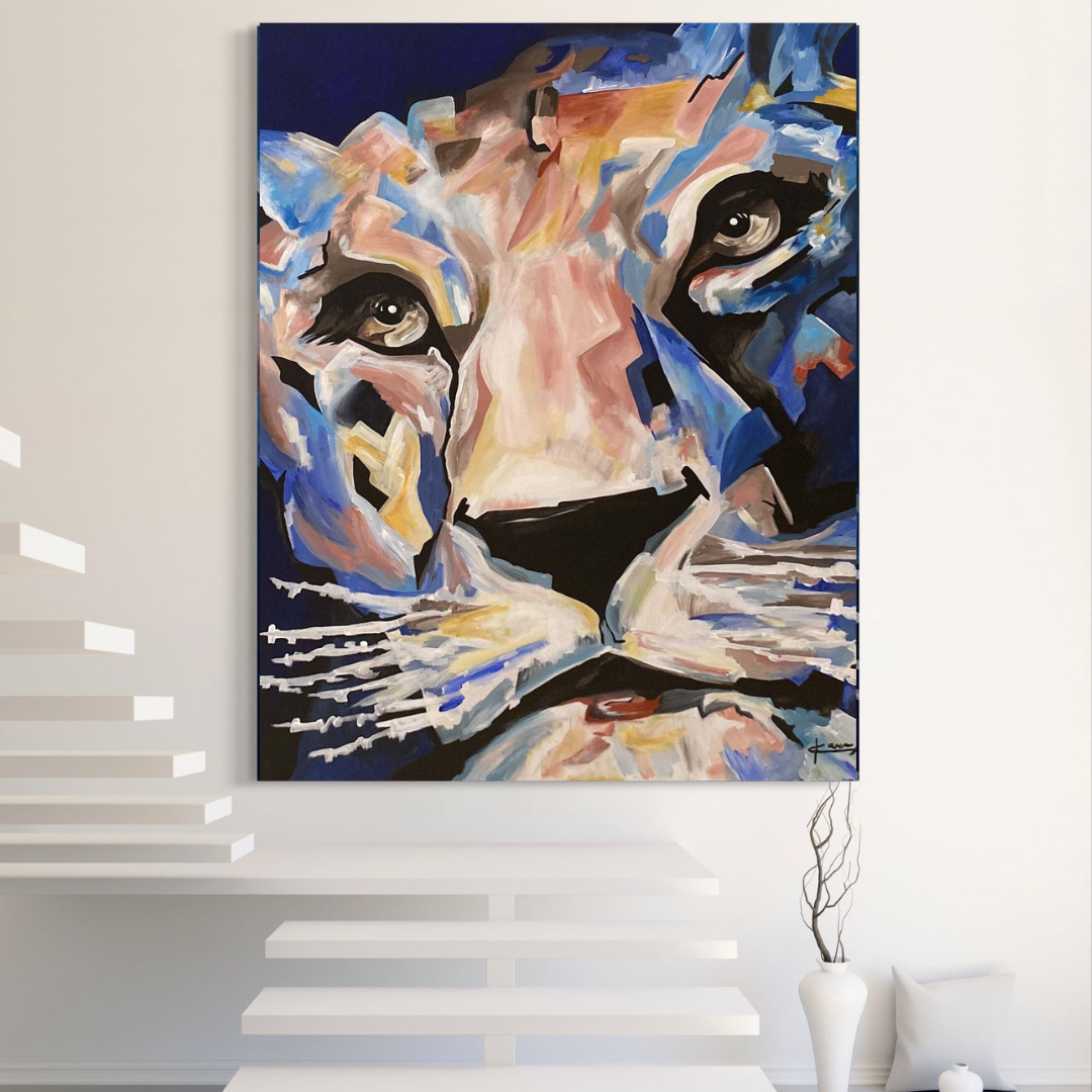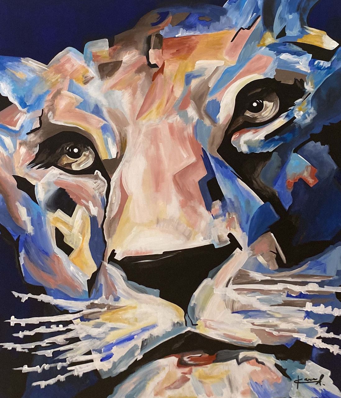 “Entre el azul añil y los matices suaves, el felino de ‘Destellos de vida salvaje’ emerge con una mirada que captura la esencia de la vida salvaje: intensa, profunda y serena, un reflejo de nuestra propia dualidad interior.”