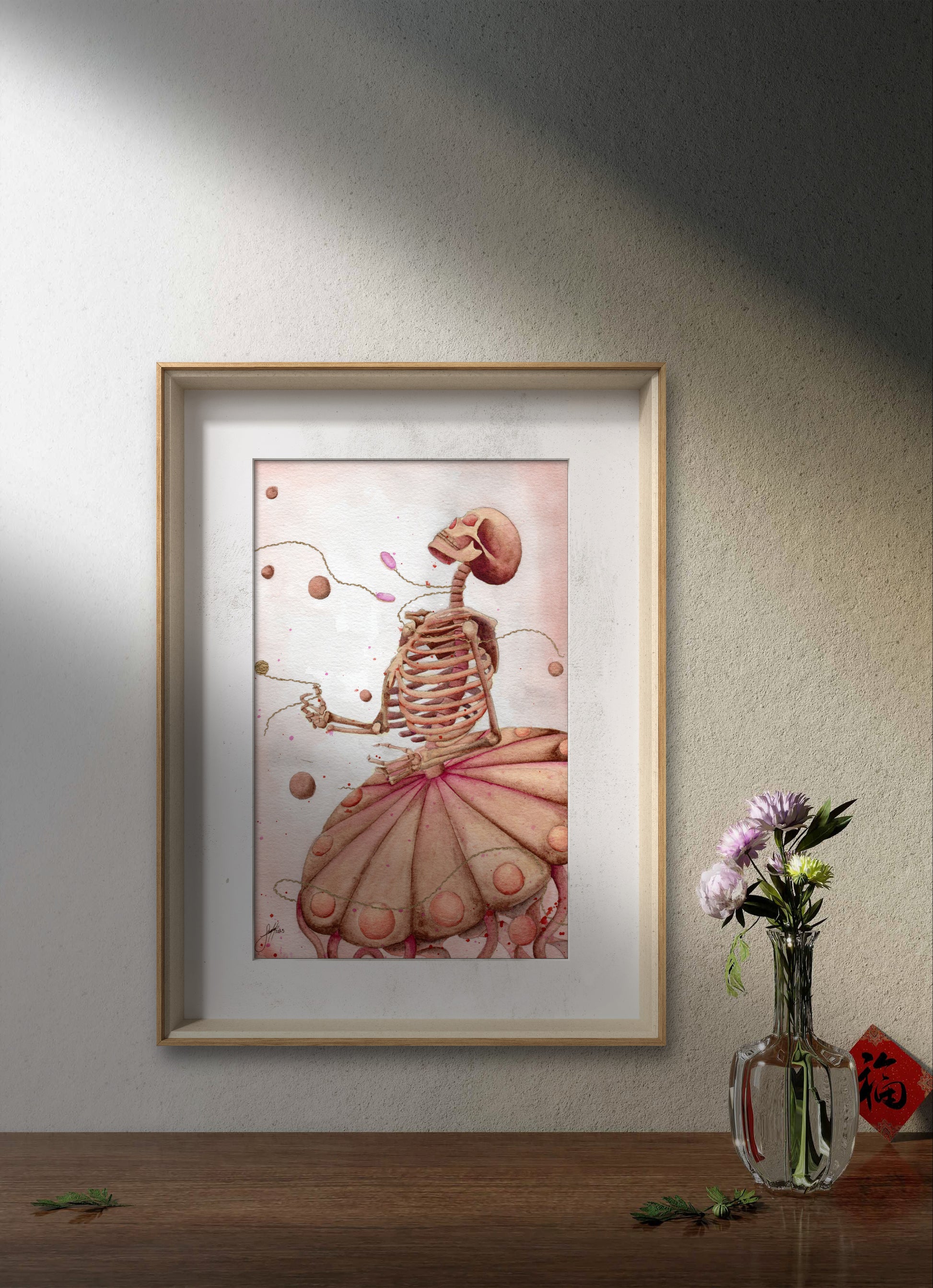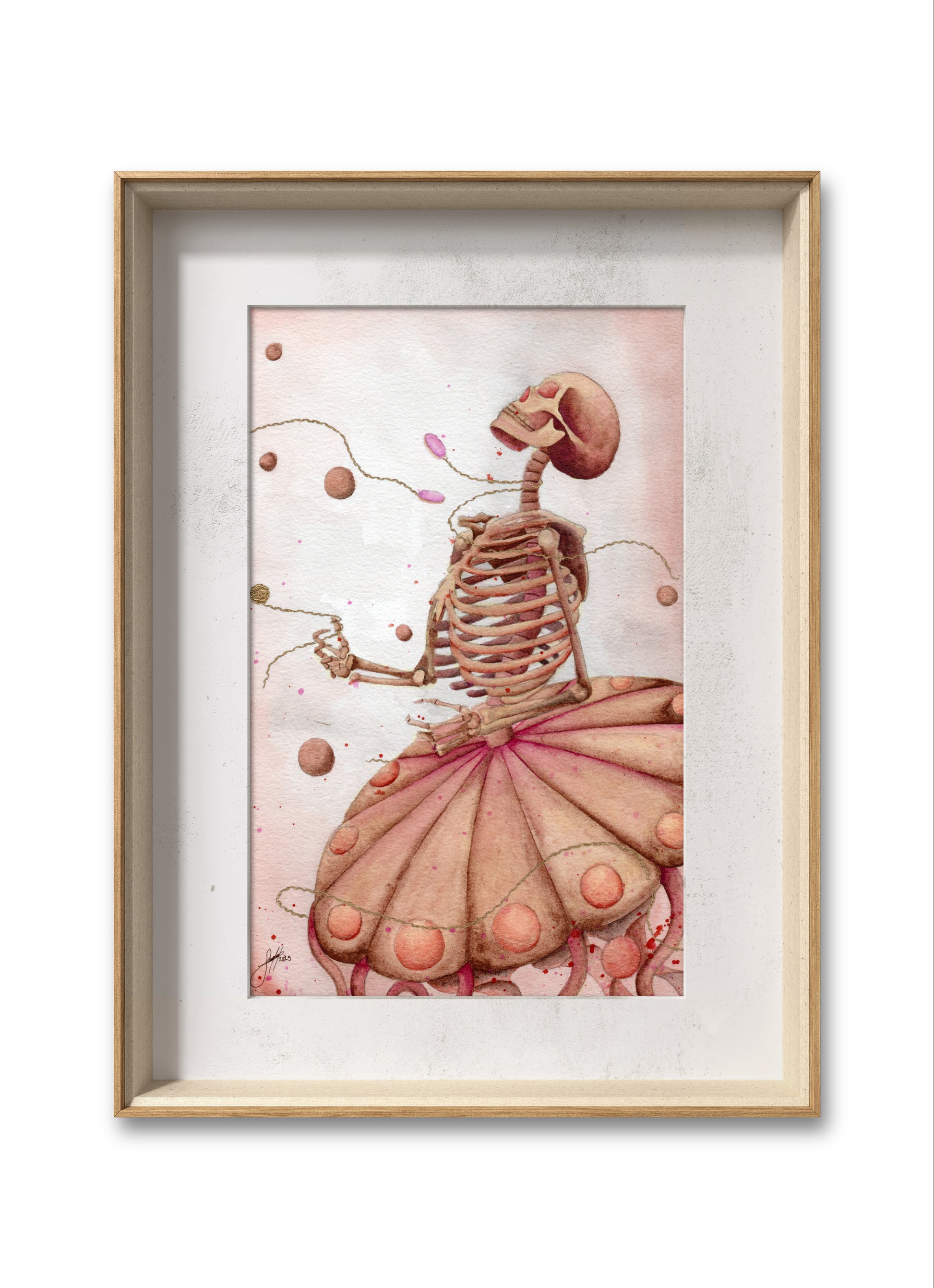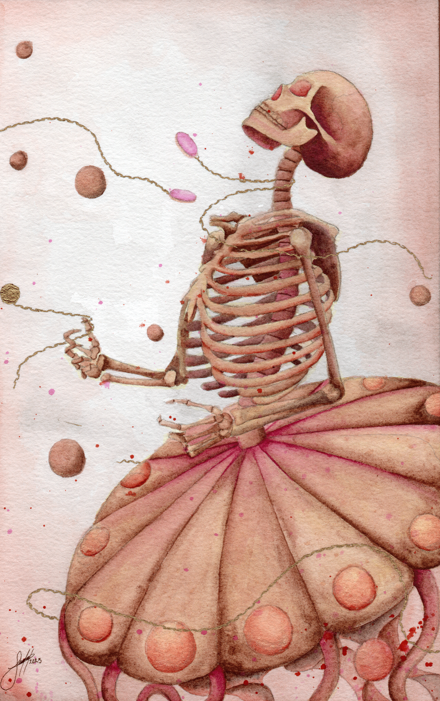 Esta pieza forma parte de una colección de cuatro acuarelas de formato pequeño, en las cuales el autor presenta un esqueleto completamente formado, cuyos huesos parecen hechos de pura luz y sus cavidades resplandecen con un brillo hipnótico. Este ser anatómico está cubierto por una exquisita colección de joyas que parecen fusionarse con su estructura ósea, creando un contraste fascinante entre la fragilidad humana y la eternidad que simbolizan las gemas. Realizada en junio del 2023, es una obra 100% original del artista. Acuarela sobre papel fabriano, (no incluye marco).