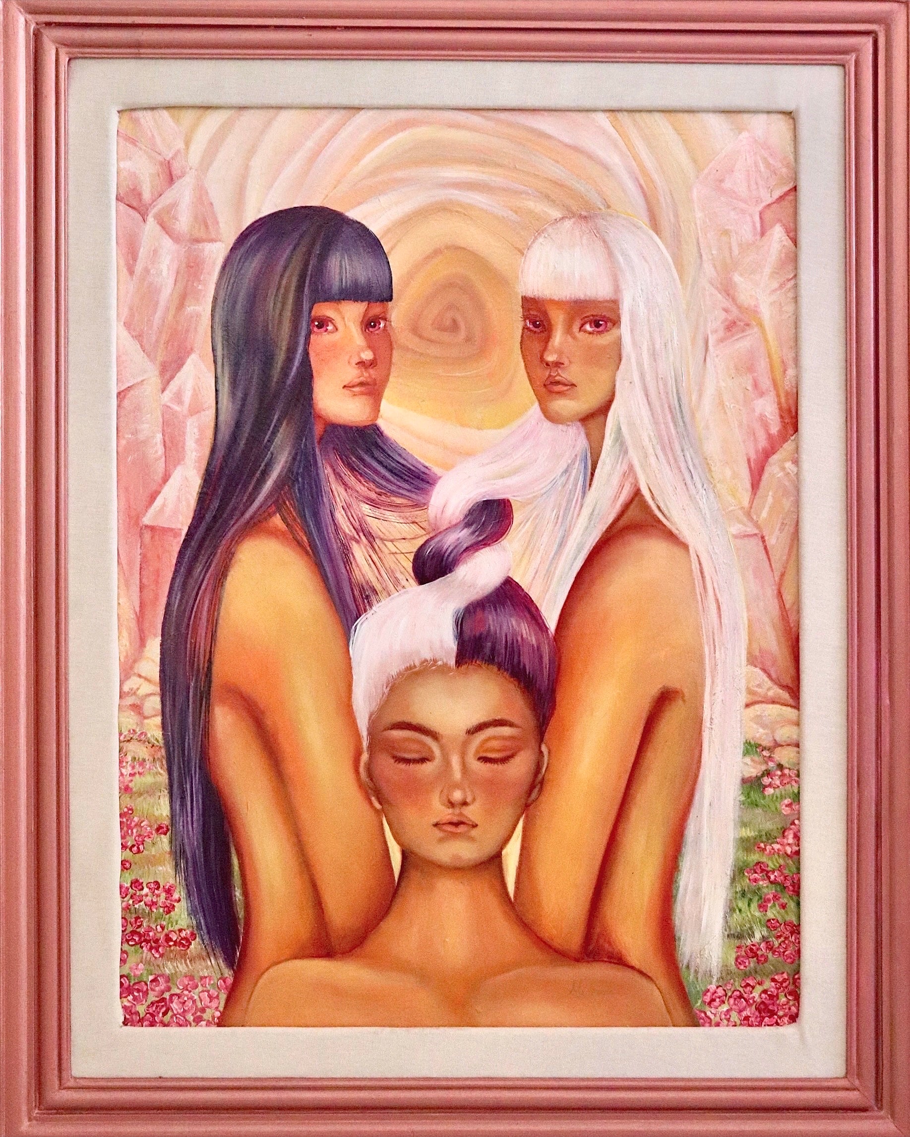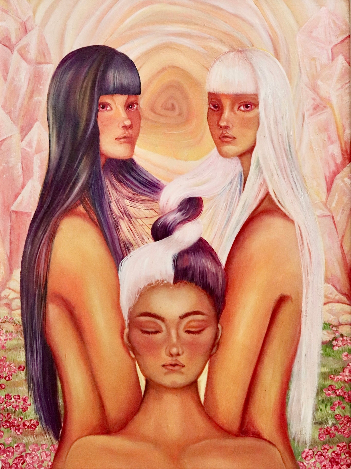 En física, un dipolo es la unión de dos polos opuestos que coexisten en equilibrio. Esta obra representa esa dualidad: luz y sombra, consciente e inconsciente, lo opuesto que, al entrelazarse, forma una sola esencia. El cabello compartido simboliza esa fusión, mostrando que en cada extremo habita su contrario, y en el centro, la unidad. Como en el Yin-Yang, la tensión entre los opuestos no divide, sino que da sentido a la existencia.