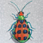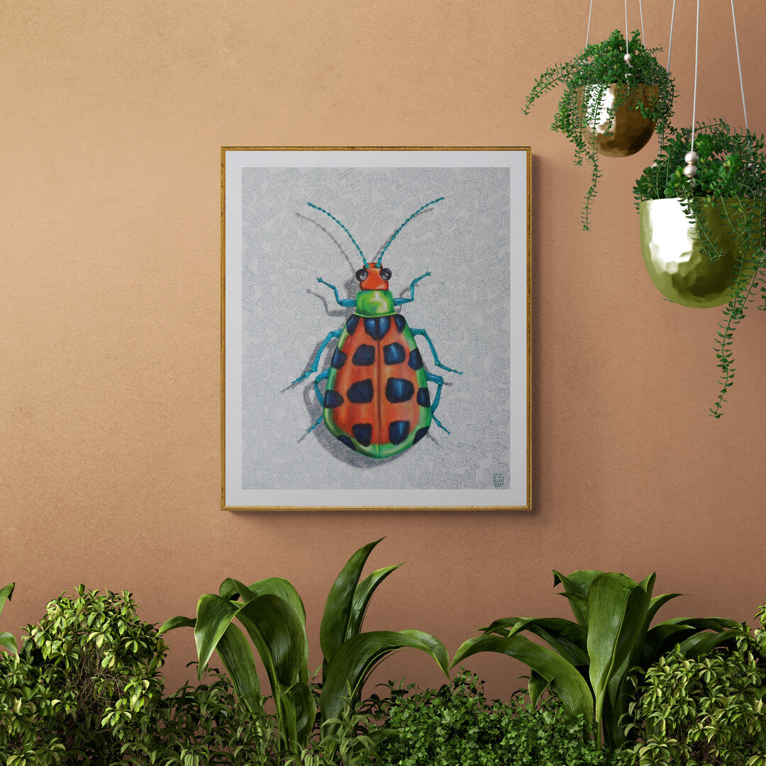 Esta obra es un insecto de la variedad disonycha, suelen encontrarse en hojas trepadoras y sus colores son variados; su tamaño y los puntos en sus elitos me recuerdan a los bloque lego por lo que su fondo gráfico es este.