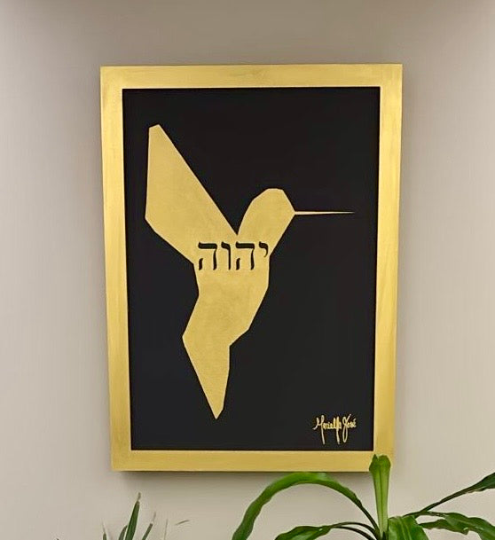 Pintura en acrílica metálica en oro sobre lienzo y marco de MDF en oro. 56 de base por 76 de altura. Este colibrí nos trae el primer nombre de Dios para recordarnos nuestro origen y destino.