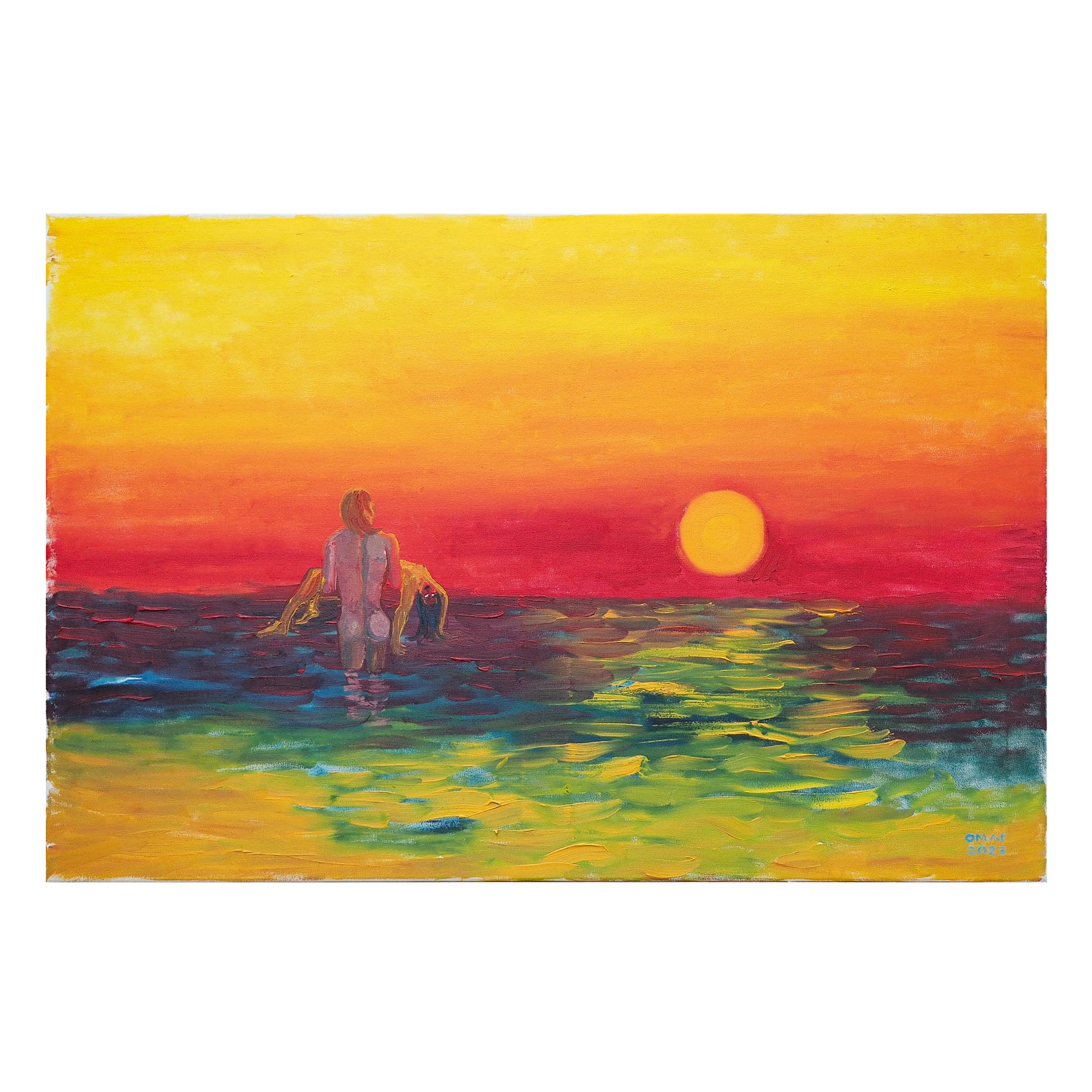 En el crepúsculo, un hombre camina al mar, sosteniendo el cadáver de su amor perdido. Los últimos rayos dorados del sol se reflejan mientras la tristeza lo inunda. Con manos temblorosas se va perdiendo en el océano, que parece susurrar palabras de despedida mientras el sol se despide con su luz efímera.