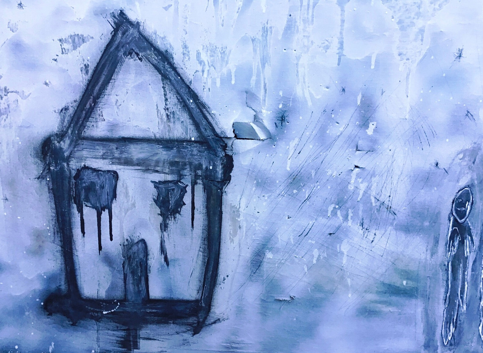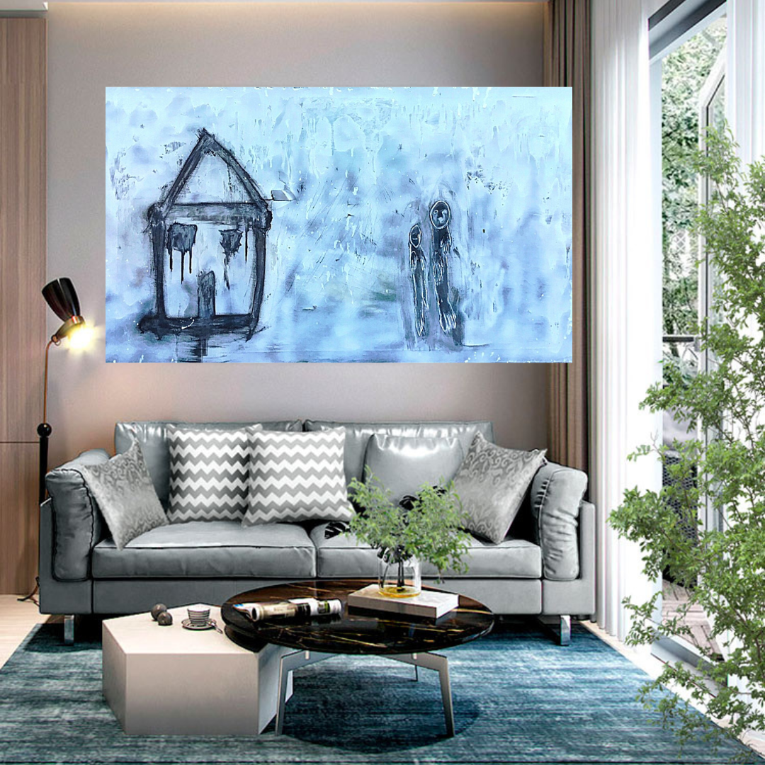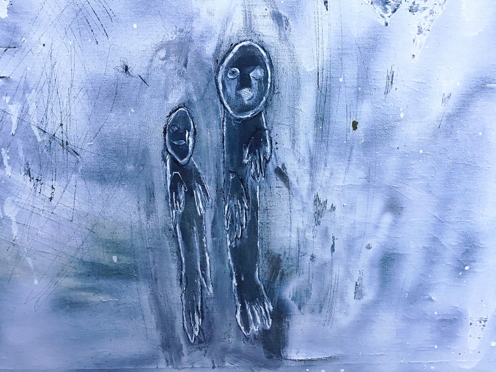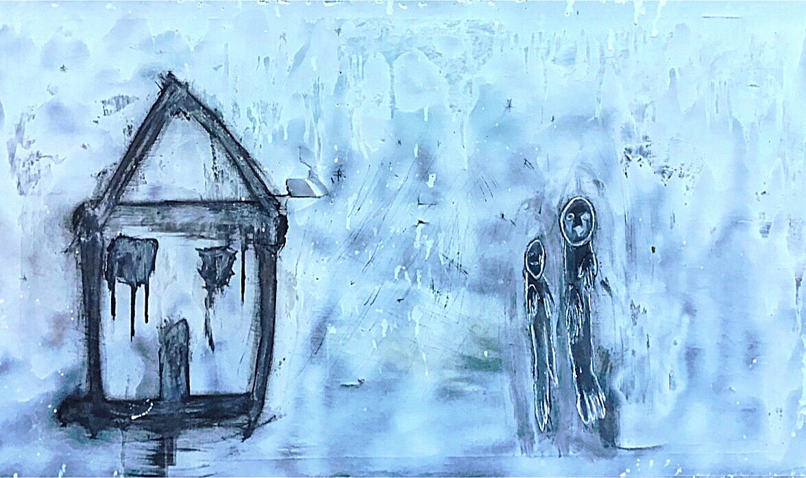 Título de la obra: "dos figuras en la nieve en busca de refugio"