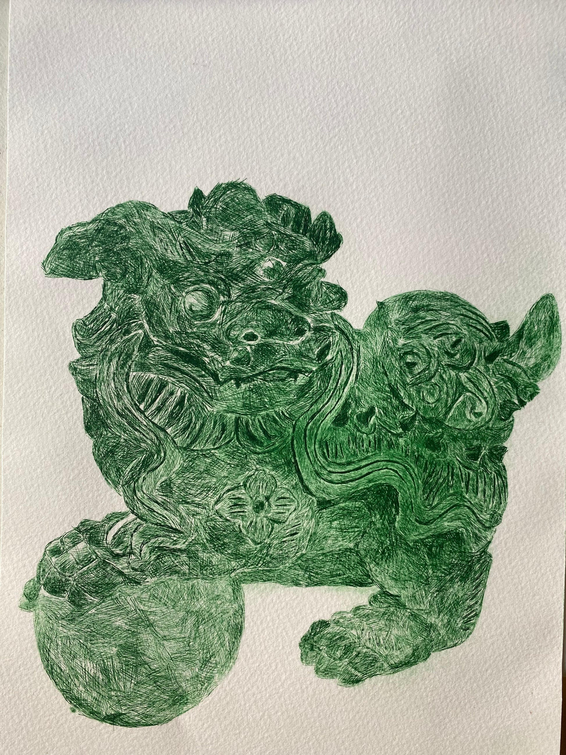 Dragón de jade es un grabado en punta seca que celebra la belleza de las esculturas de la antigua China.