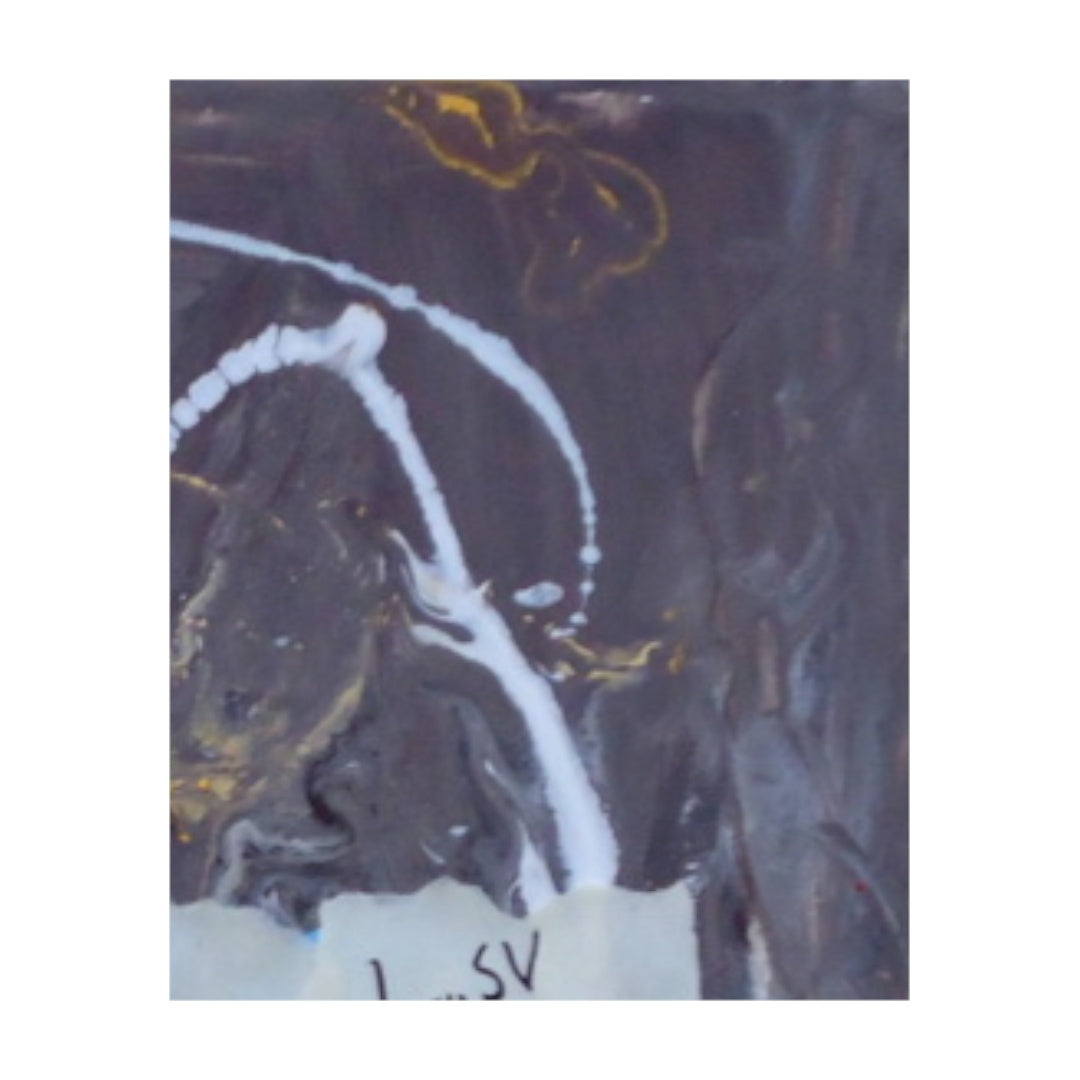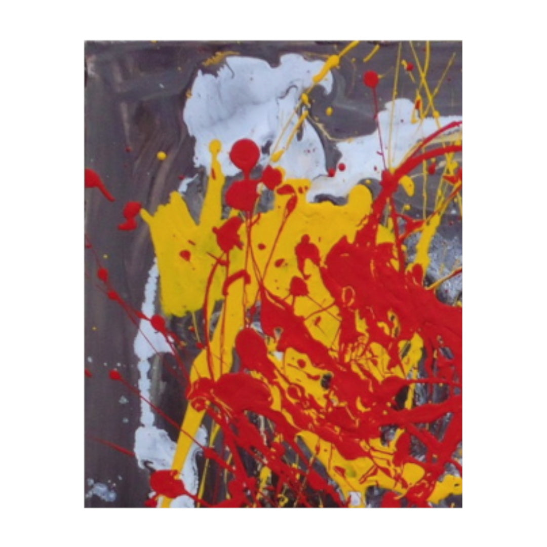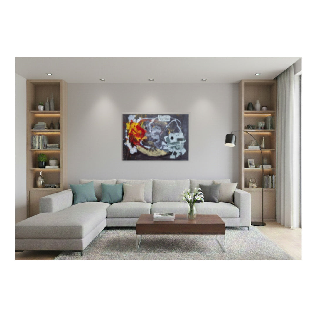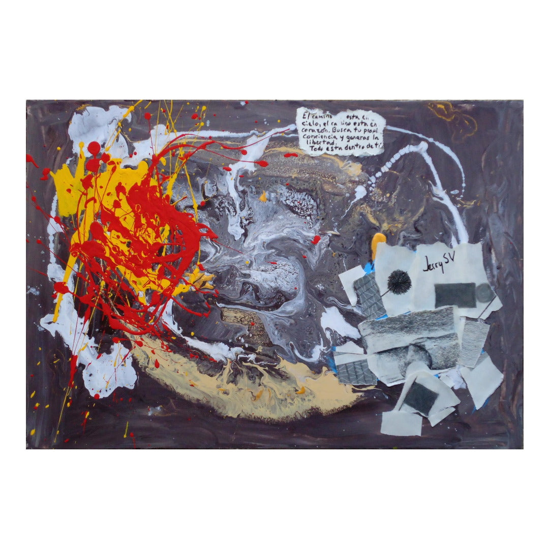 Aquí, el lienzo pulsa con una sinfonía de disonancias y armonías internas. El estallido cromático de rojo y amarillo a la izquierda no es meramente color, sino la vibración sonora de una pasión que irrumpe, un acorde estridente que se libera del silencio. El blanco que lo envuelve es el aliento, el espacio vital para esta explosión emocional. A medida que mi mirada se desplaza, el flujo central de grises y ocres es un movimiento interior. Las formas fragmentadas y la presencia del texto en el lado derecho introducen un elemento de lo concreto, de la palabra que busca su resonancia en el lenguaje abstracto de las formas y los colores, buscando un equilibrio entre la expresión pura y el eco de la razón.