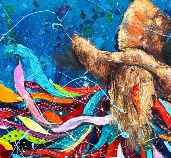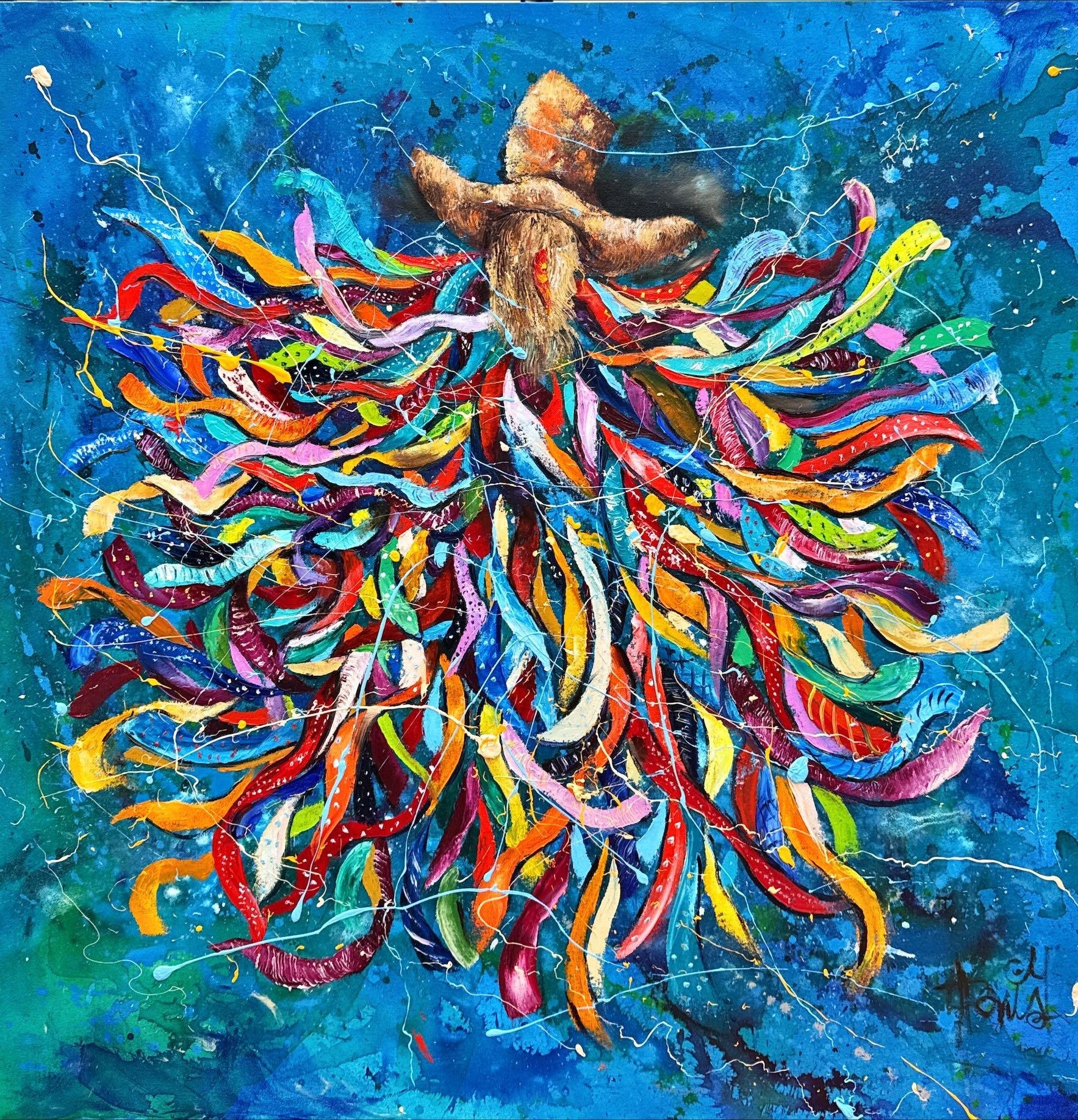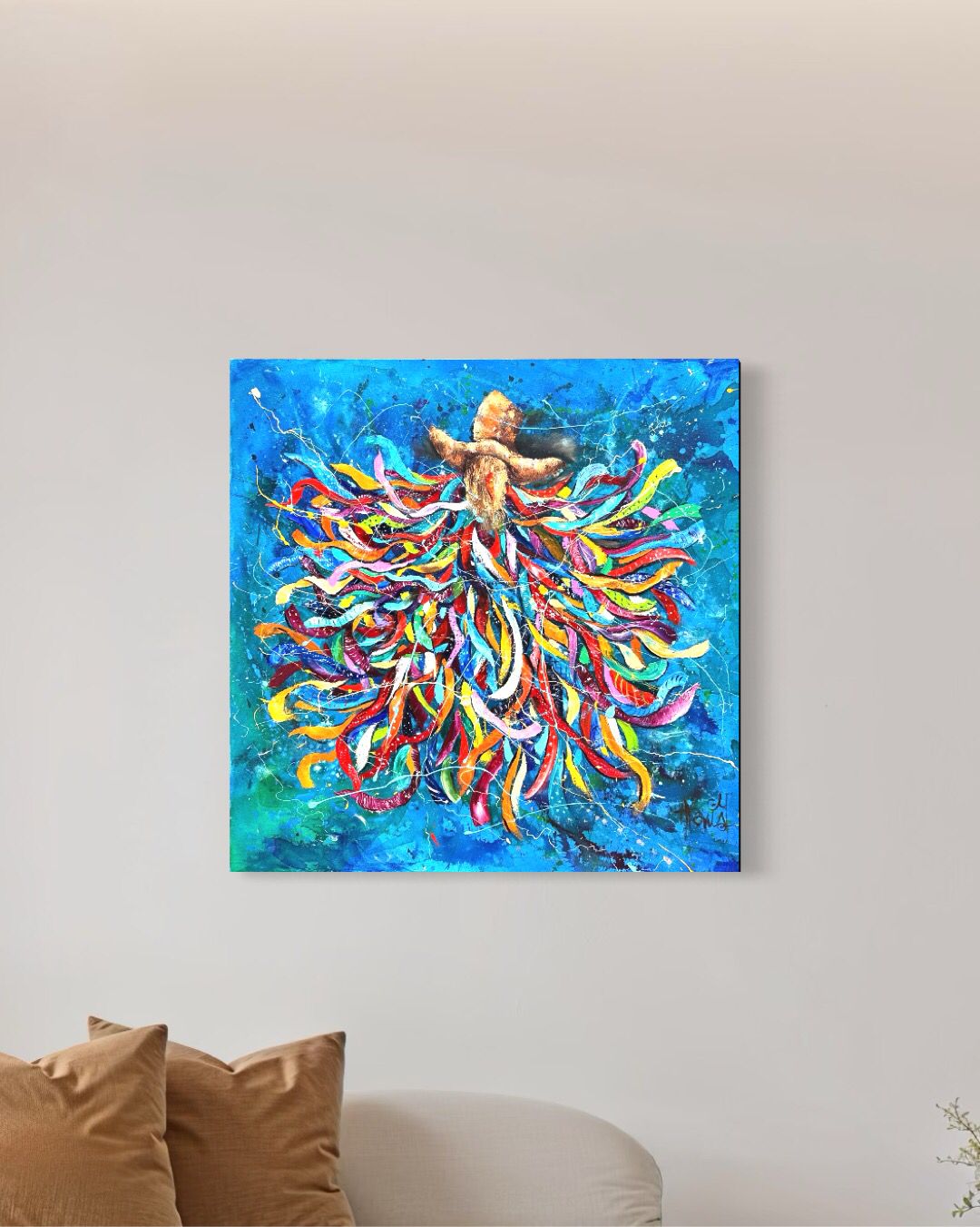 Celebra la energía, la alegría y la diversidad a través de una danza de cintas vibrantes que emergen sobre un fondo azul profundo. Casi mágico, parece flotar en la profundidad, invitando a sentir la libertad y la vitalidad que emanan de cada trazo.