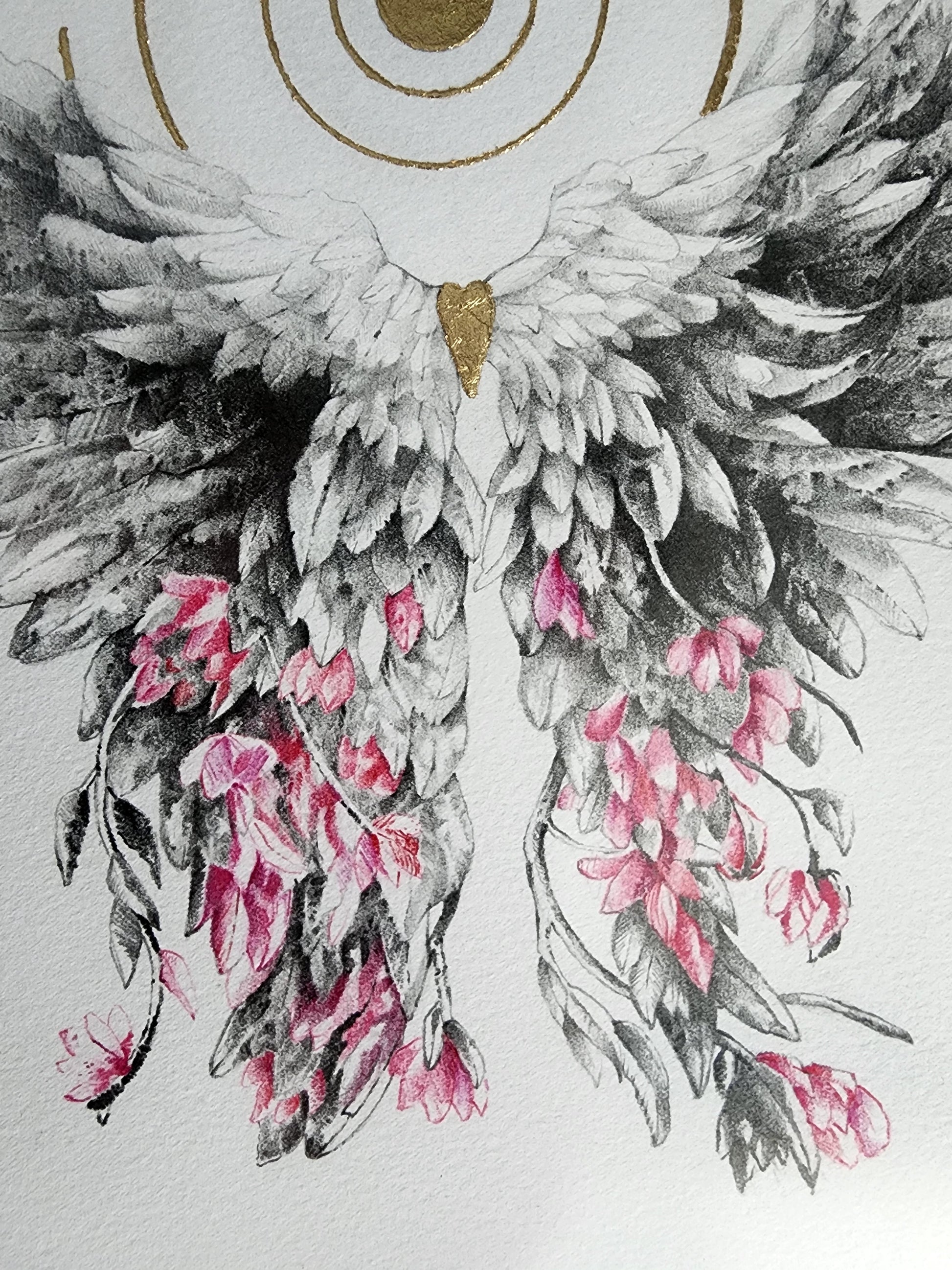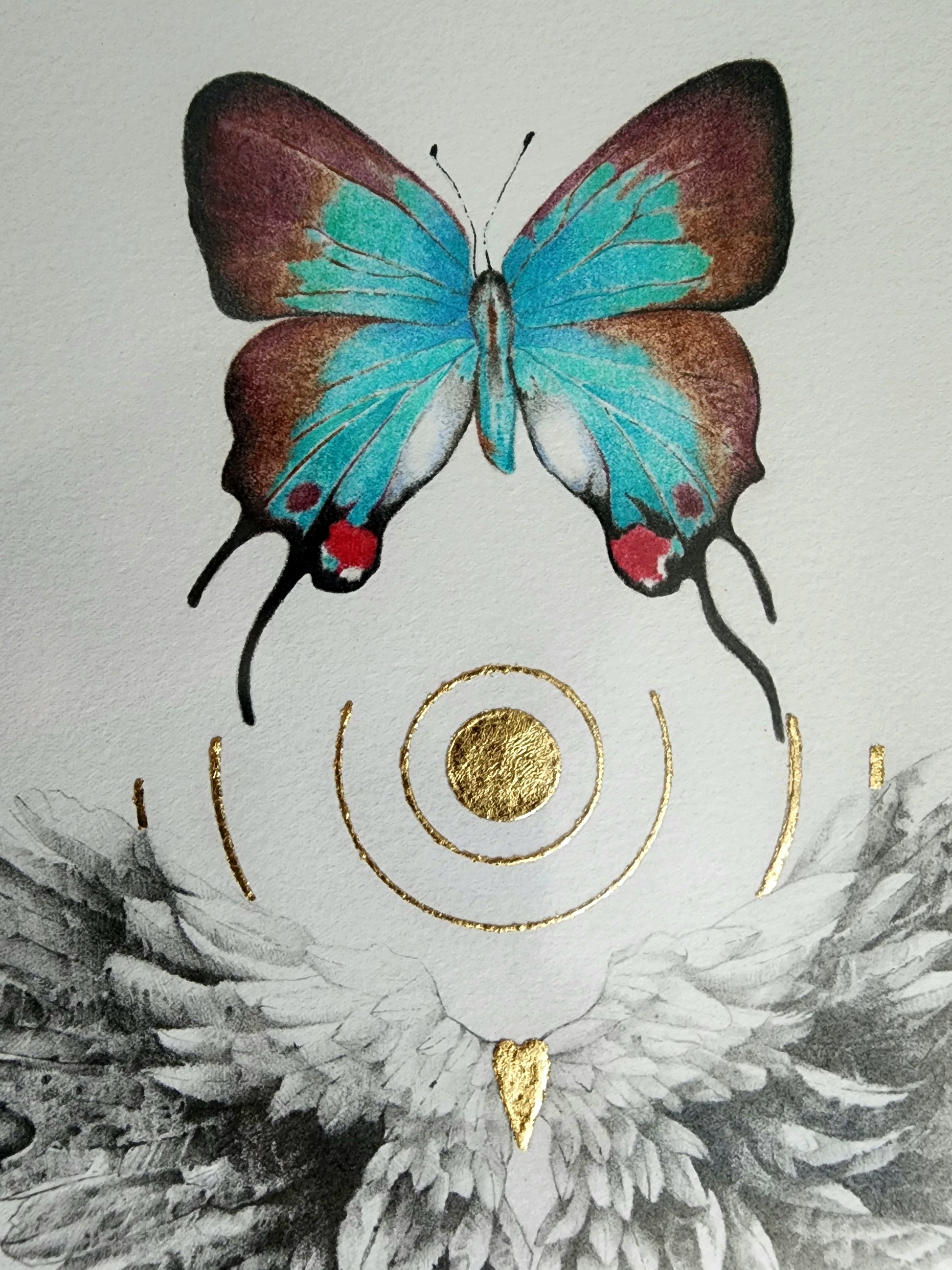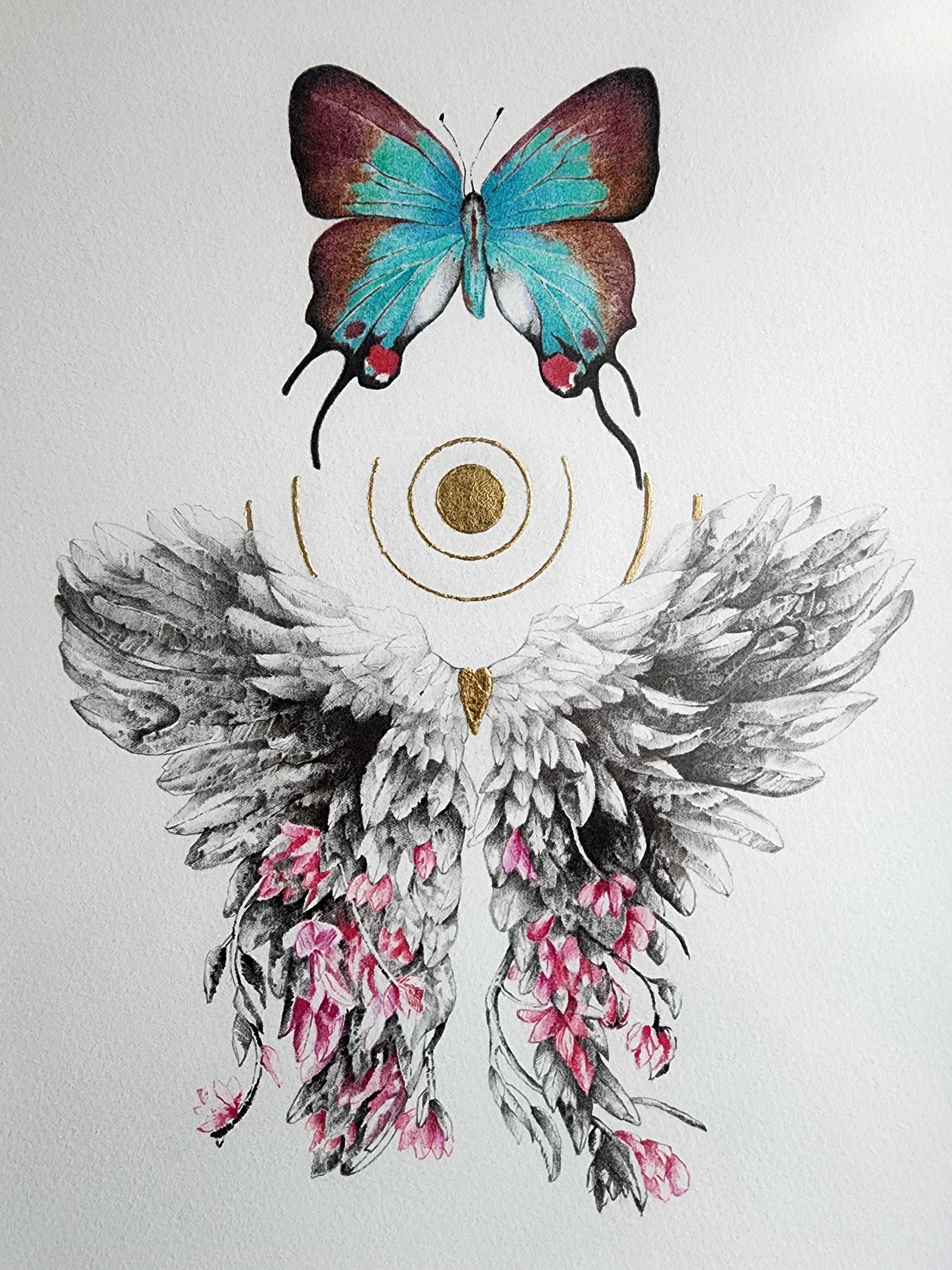 Lápiz de color y lápiz de grafito con detalles de hoja de oro.