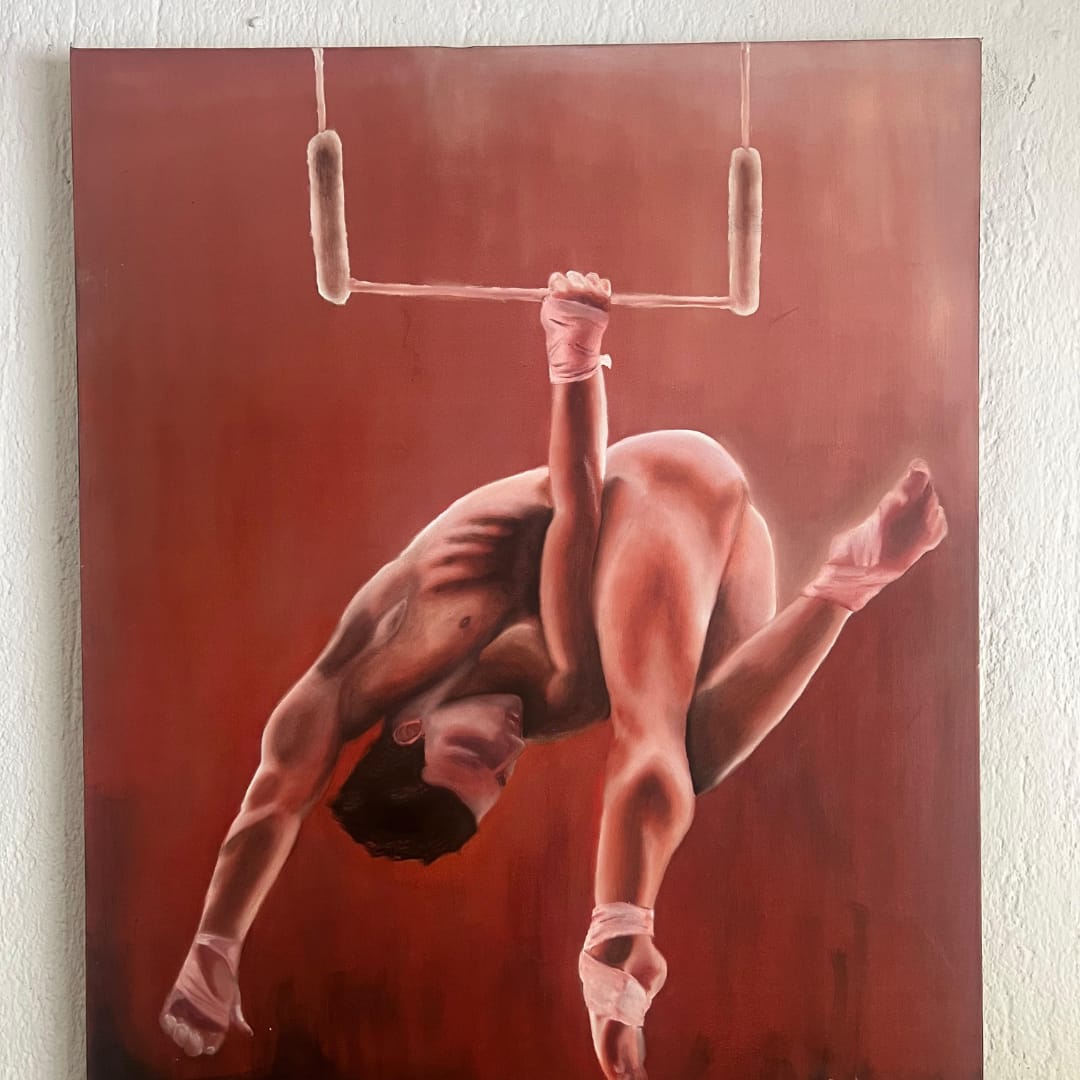 El acróbata captura la esencia de la gracia y la destreza humana. La obra evoca una sensación de dinamismo y libertad, donde el acróbata parece desafiar la gravedad con su cuerpo en una posición suspendida. Los colores vibrantes y las líneas fluidas transmiten energía, mientras que la luz y las sombras juegan un papel crucial en resaltar la musculatura y la tensión del cuerpo en acción.