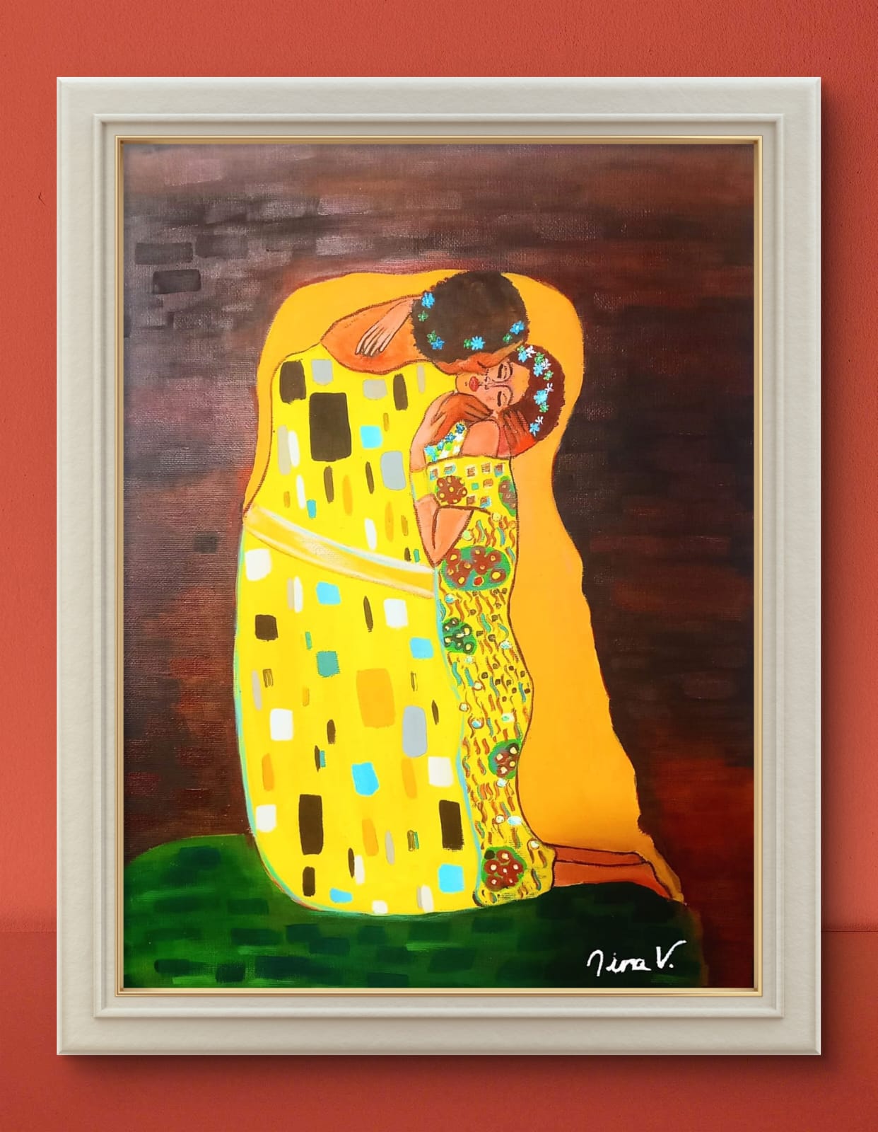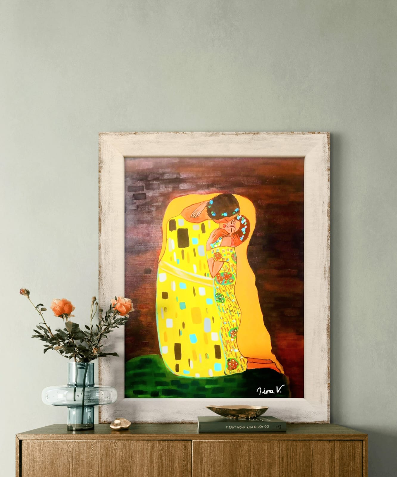 Es una obra inspiradora donde sus amantes se sugieren fundidos en complicidad por sus túnicas con su hermosa ornamentación en formas geométricas y abstractas, una belleza de obra que merece homenaje al gran pintor Gustav Klimt.