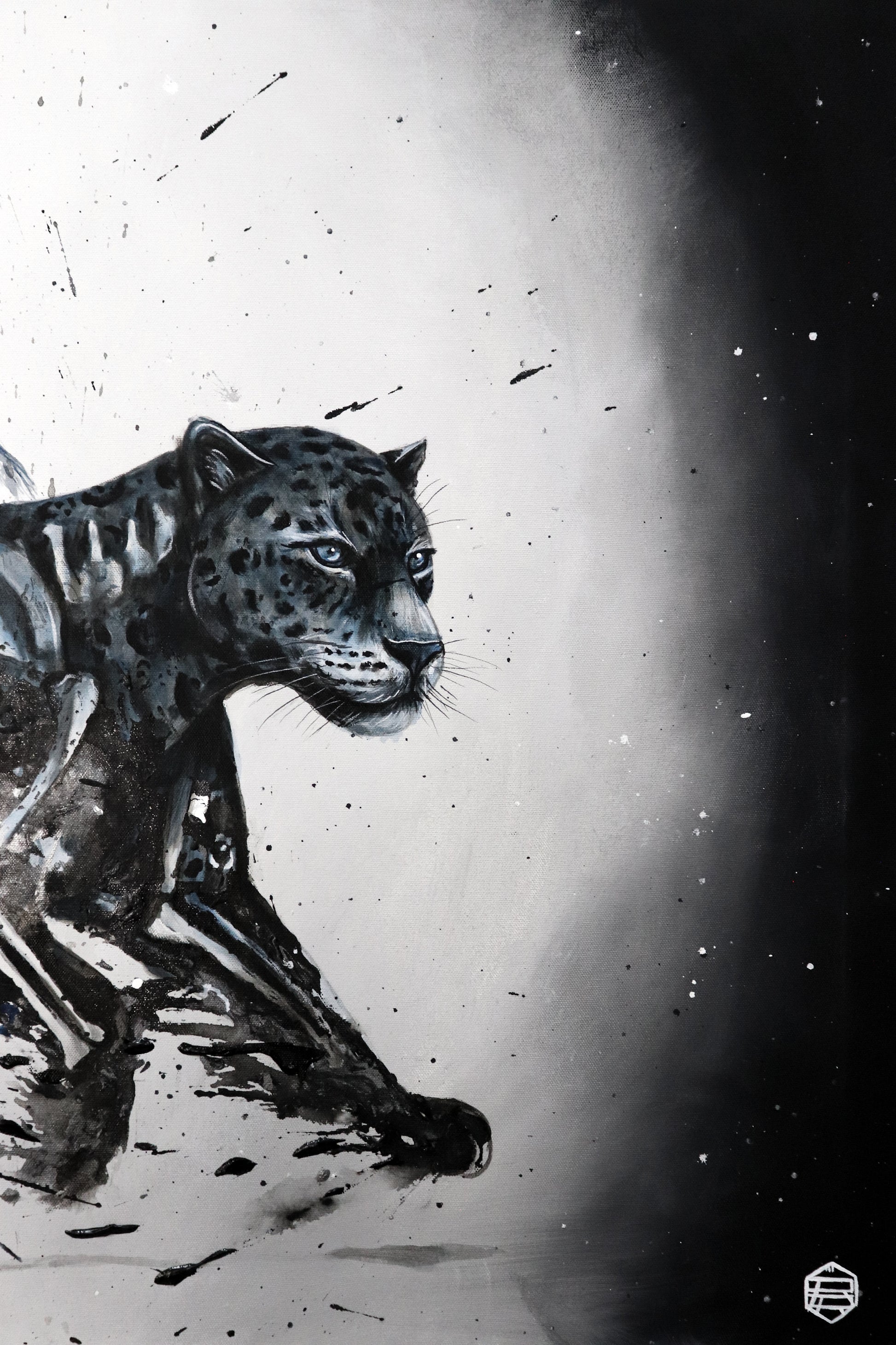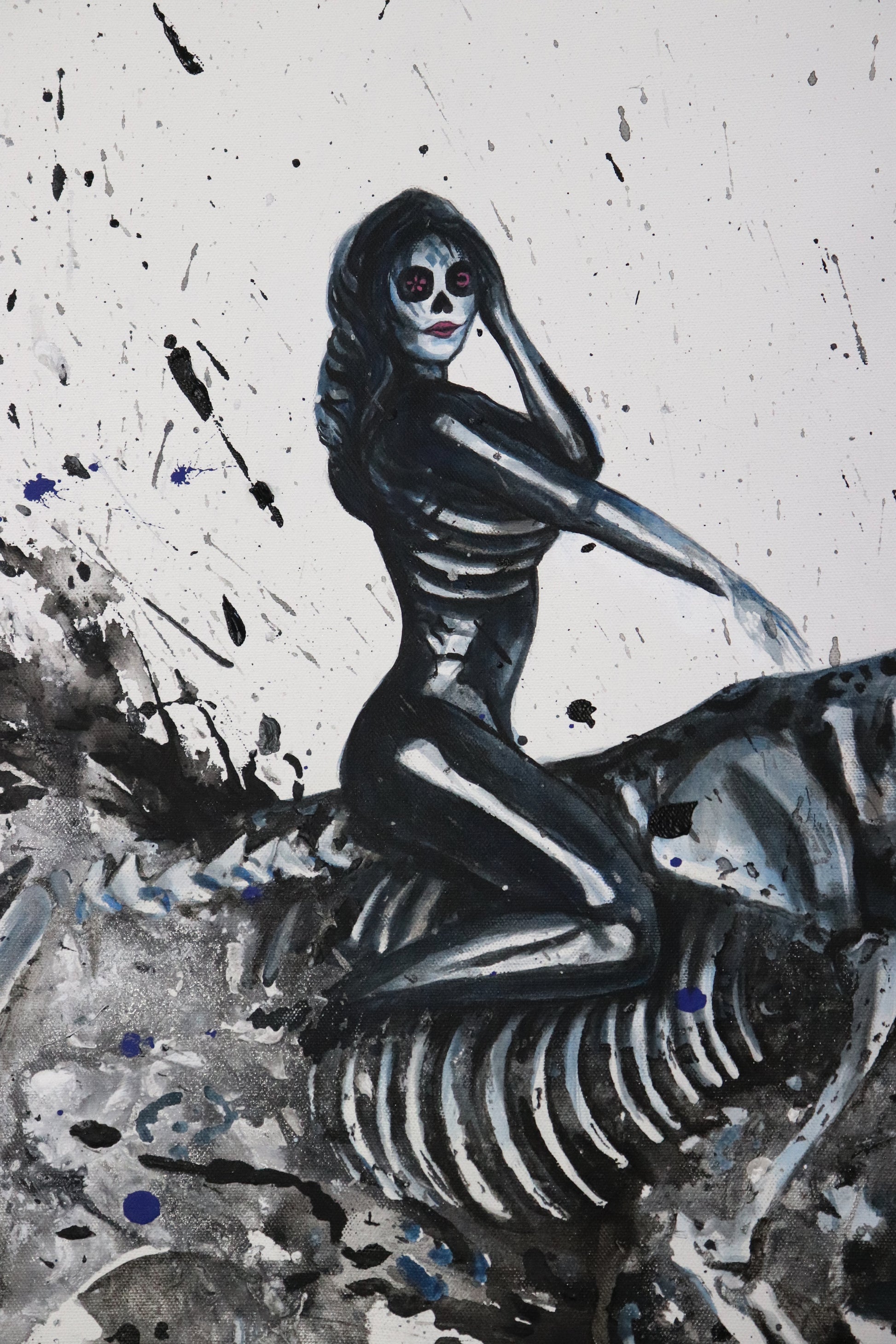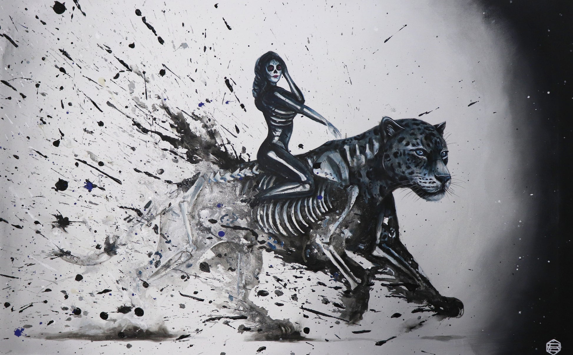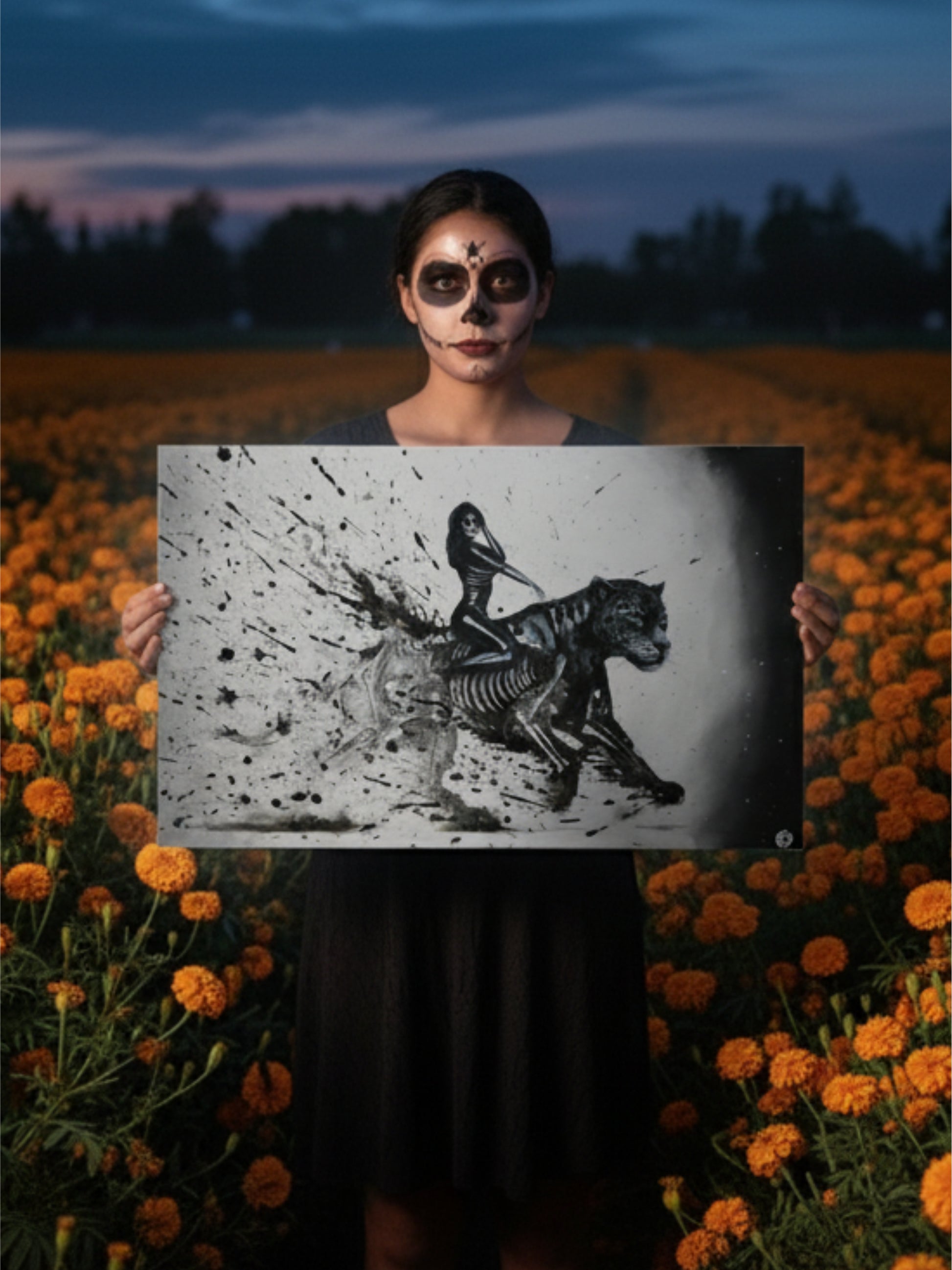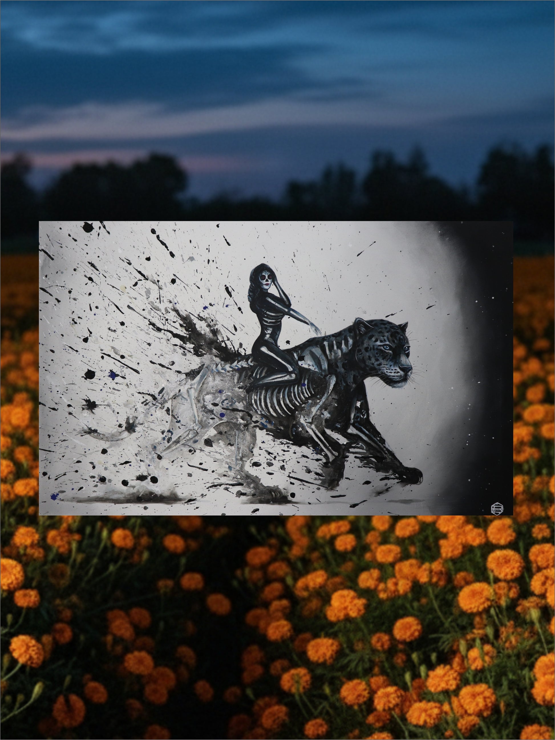 La Muerte, celebrada en México, impulsa y libera. Esta Catrina, bella y serena, cabalga el Jaguar, símbolo de poder. Un recordatorio visual: aceptar el camino, dirijir tu destino y vivir plenamente. Tu motivación diaria.